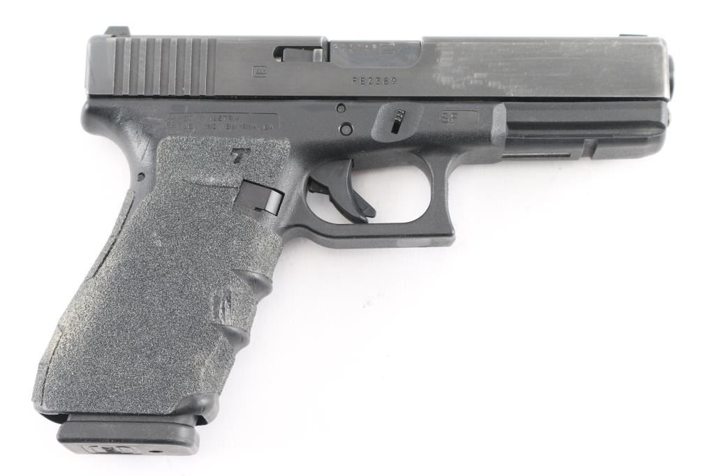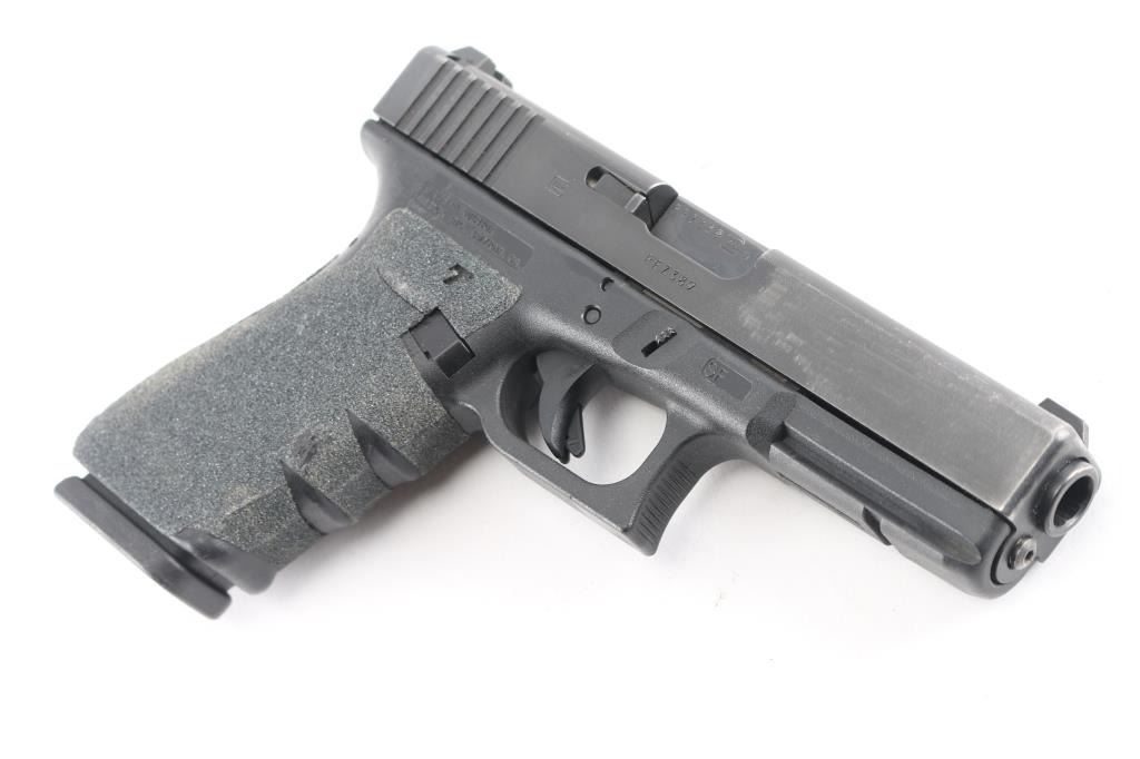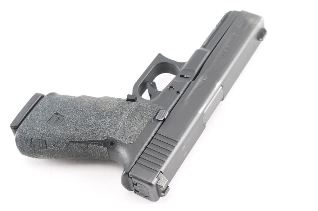 Austrian semiautomatic pistol. Features approx 4.5" barrel, 3 dot night sights (fixed front & dovetailed rear), striker fired, manual safety in trigger, polymer frame with accessory rail on dust cover & textured finger grooves in front strap. All black finish. Added grip tape panels all around grip area. Bore is excellent condition. Retains 85% finish on slide, with handling marks, scuffs. Polymer shows minor blemishes. Grip tape is beginning to crack and peel on butt side. Includes one 13 rd magazine.