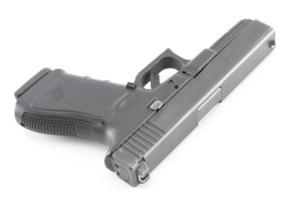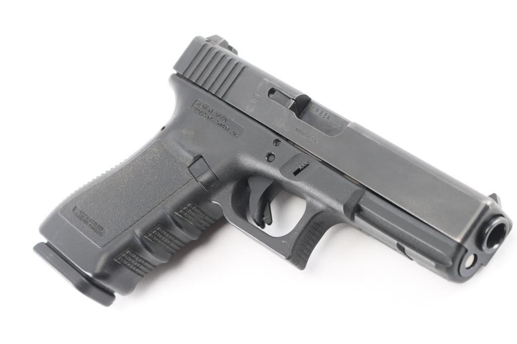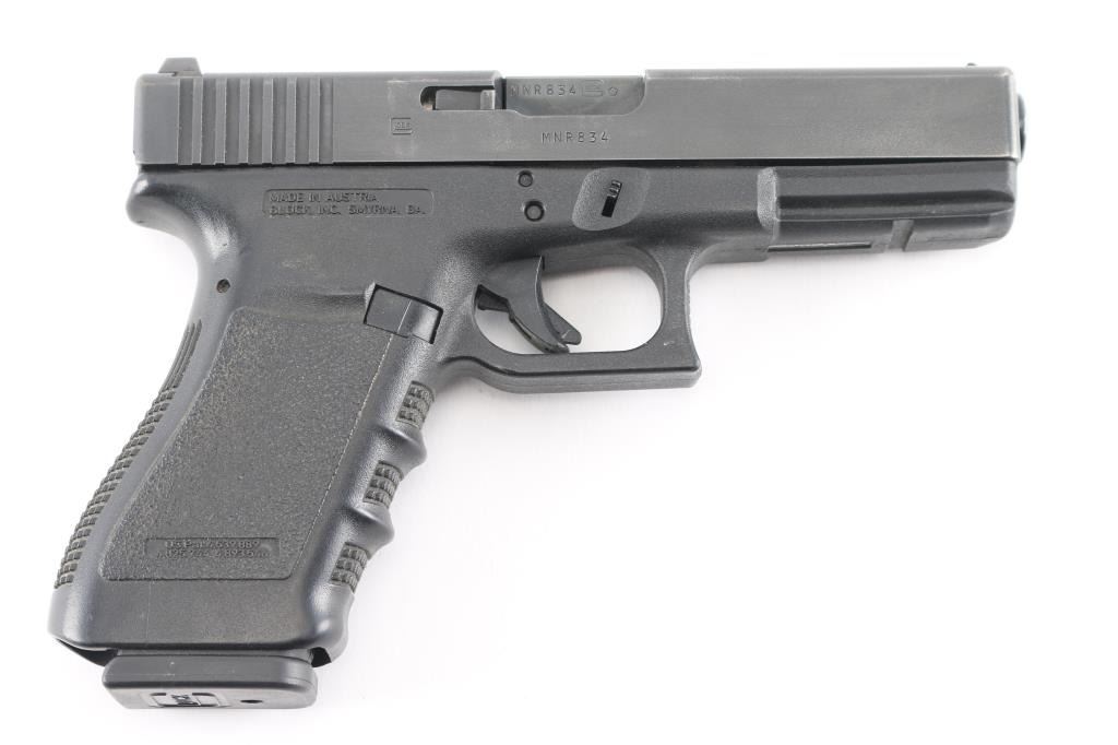 Austrian semiautomatic pistol. Features approx 4.5" barrel, fixed front sight with white dot, dovetailed rear sight with white outline, striker fired, manual safety in trigger, polymer frame with accessory rail on dust cover & textured finger grooves in front strap. All black finish. Bore is excellent condition. Retains 95% finish on slide, with handling marks. Polymer shows minor blemishes. Includes one 13 rd magazine.