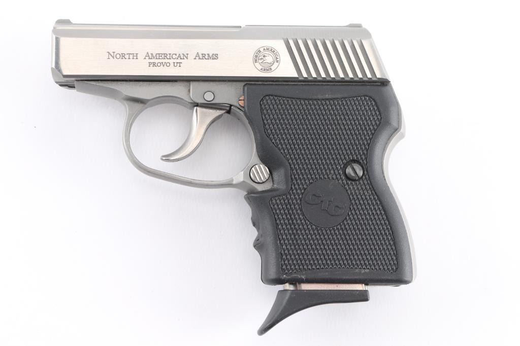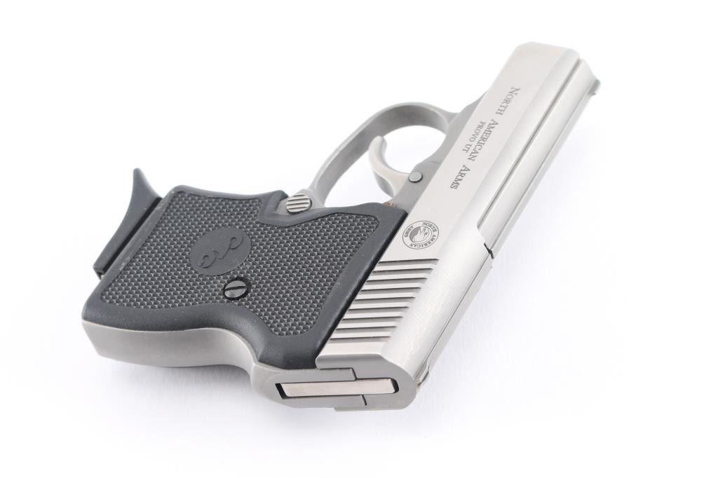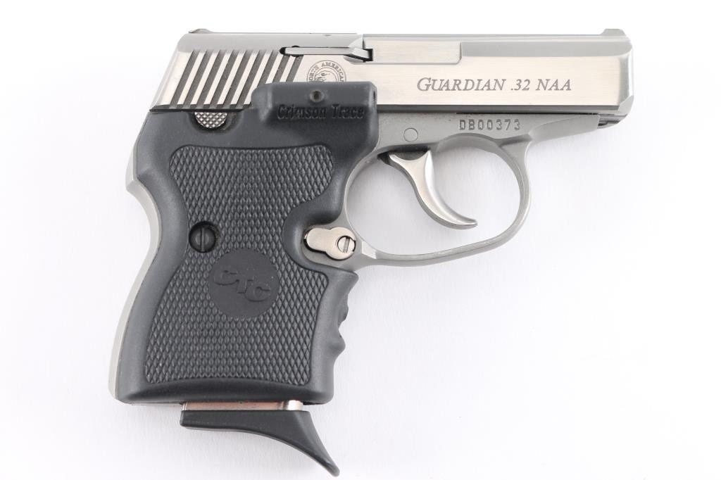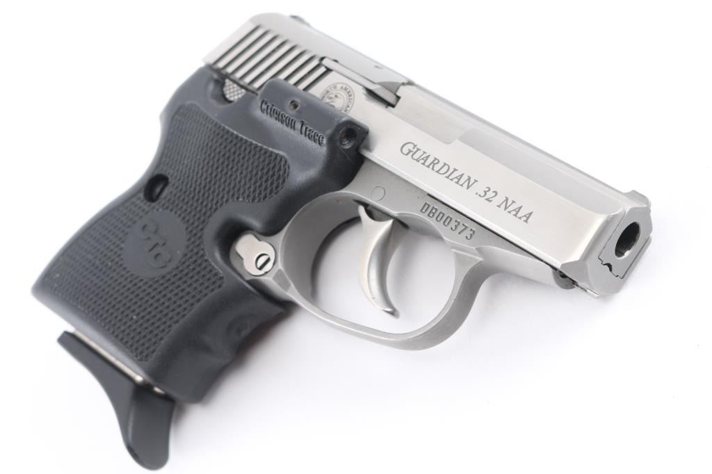 SN: DB00373 Stainless steel double-action-only semi-automatic pistol chambered in .32 North American Arms (which is a .380 ACP case necked down to .32 caliber). Features a brushed/matte finish, 2.5" barrel, fixed sights, smooth trigger, bobbed hammer, push button magazine release, Crimson Trace checkered black plastic laser grips with NAA insignias. Bore is very good. Metal is very good, showing scratches and scuffs. Grips are very good, laser works, needs fresh batteries. Includes one magazine.