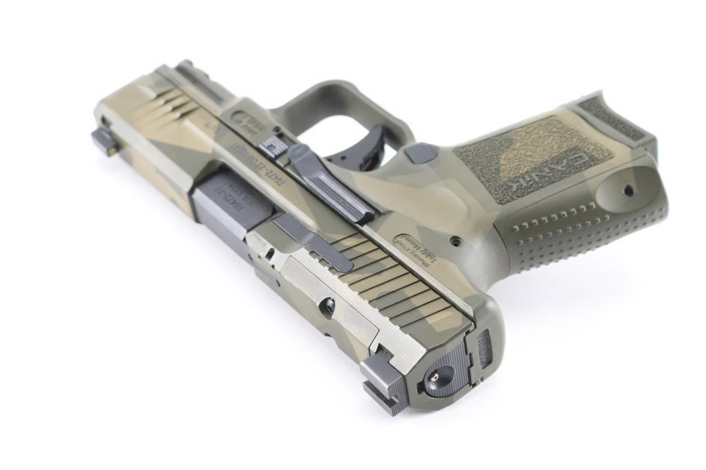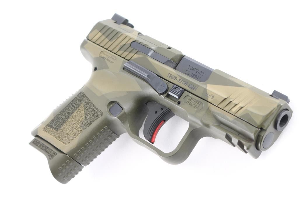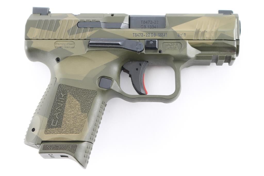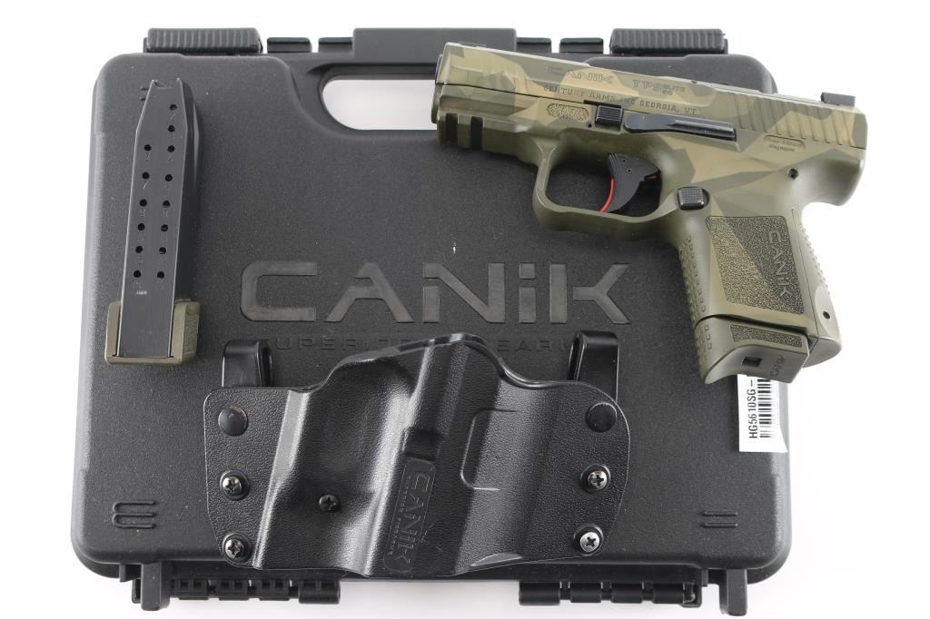 SN: 22CB13341 Turkish made semi-automatic compact pistol chambered in 9x19mm. Imported by Century Arms of Georgia, V.T. Features green camouflage finish, 3.5" barrel, striker fired, trigger safety, optic cut slide with removable plate installed, dovetailed sights with white dot front, polymer frame with accessory rail & replaceable backstraps, cocked indicator, loaded chamber indicator, ambi slide stop, push button magazine release. Bore is pristine. Retains 98% finish with minor handling marks. Includes the original factory hard case with manual, kydex belt slide holster, additional backstrap, cleaning tools, two magazines (one compact with pinky rest extension, one extended).