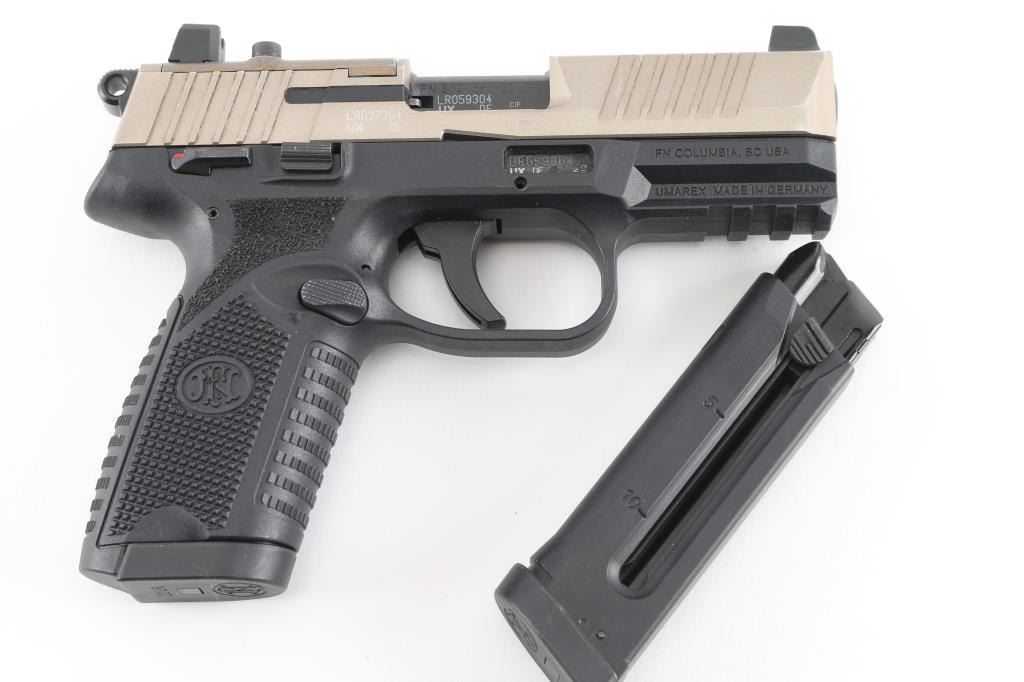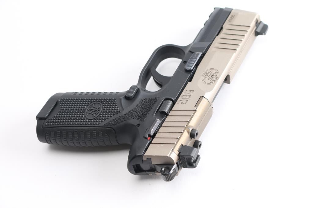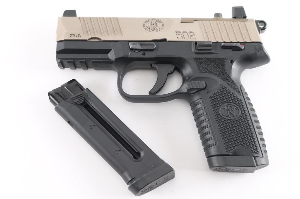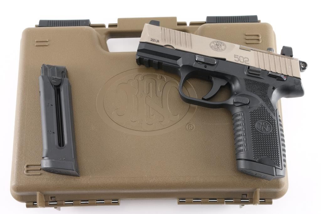 German made rimfire pistol with the size and style of the service type FN pistols, imported by FN USA Columbia SC. Features burnt bronze slide, matte black controls and polymer frame, 4" barrel, double action trigger with exposed serrated ring hammer, ambi manual frame mounted safety, ambi slide stop, ambi push button mag release, tall dovetail mounted sights with white rectangle "dots", rear sight mounted on a blank plate to fill the slide's optic cut. Bore is pristine. Retains 95% finish with handling marks, mostly on edges of installed filler plate for the optic cut. Includes factory hard plastic box, manual, several optic plates with rear sights attached, two magazines. Slide number is mismatched to frame, barrel matched frame.