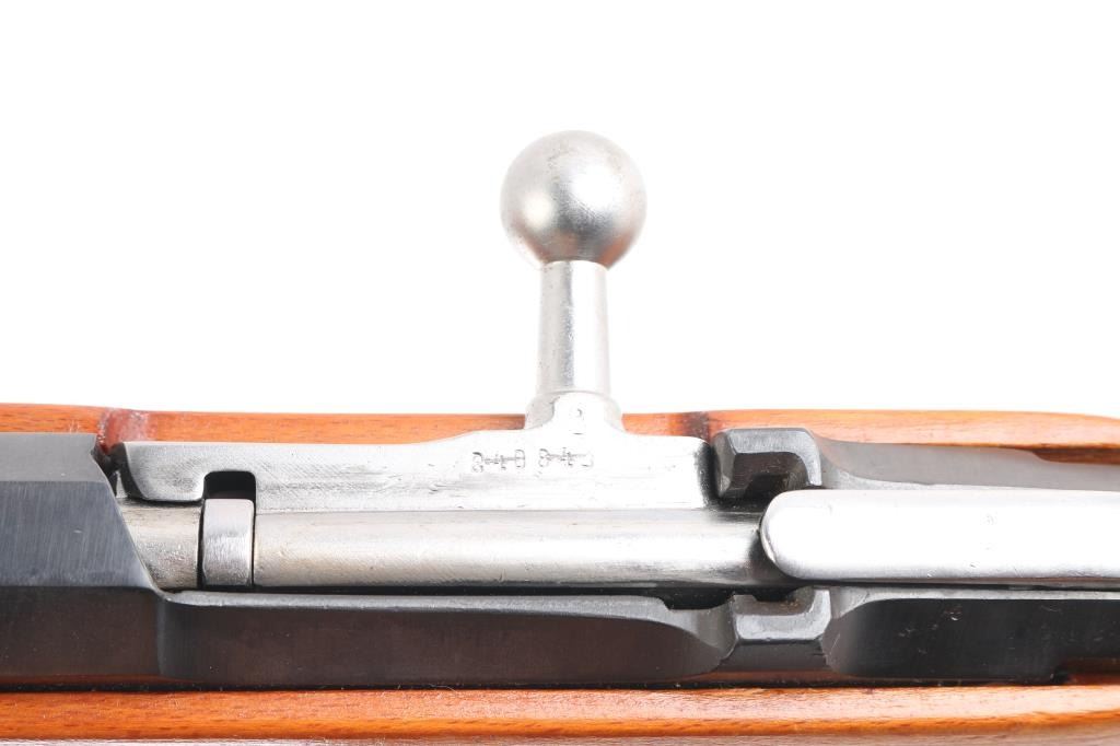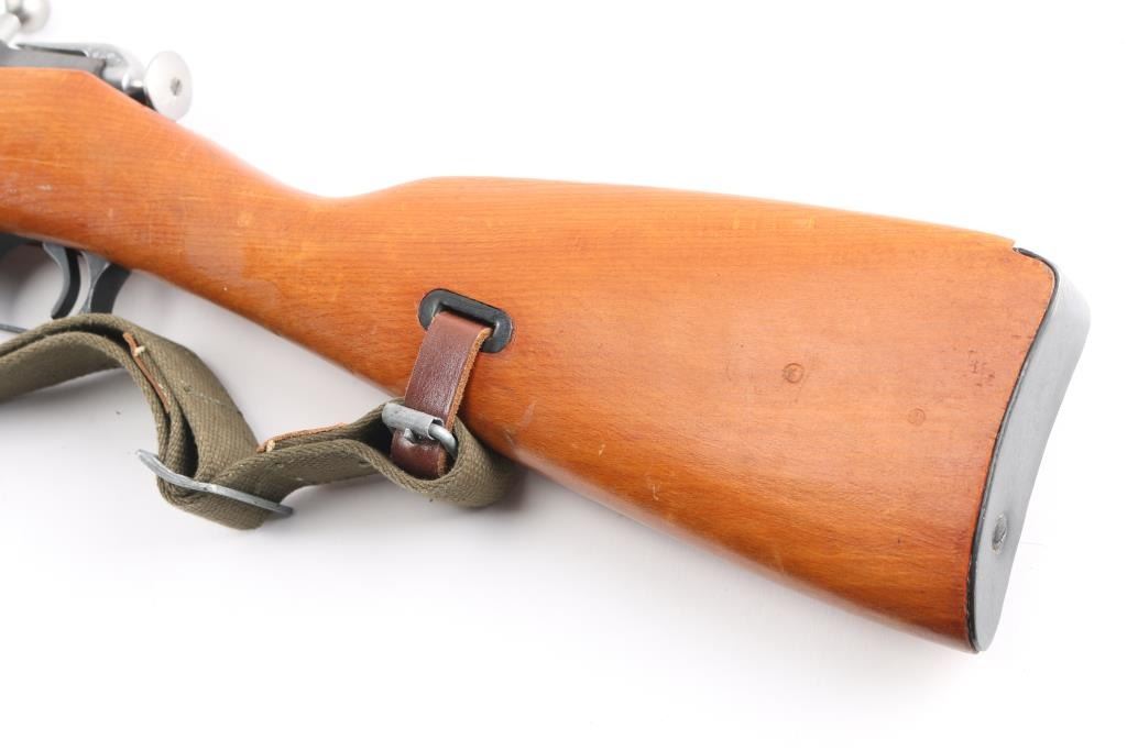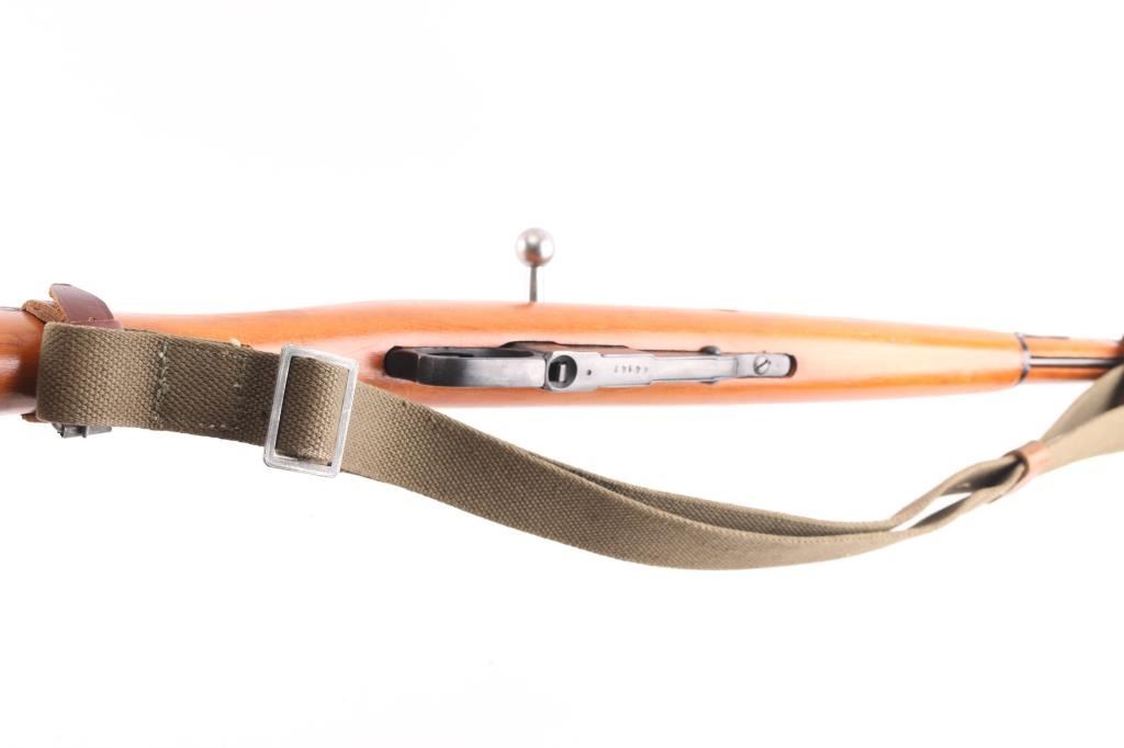 This is the rare M91/38 (Vz91/38) Czech Mosin-Nagant carbine made post war using M44 stocks. The stock has the bayonet cutout on the right side. Imperial Russian Tula arsenal markings on the barrel shank along with a Czech star proof. Dated 1898. The hex receiver has Czech circled 'T' proofs. Sources say there are only about 3000 produced. Matching serial numbers on the barrel, receiver, floorplate, steel butt plate, and electro-penciled on the polished bolt. Wood has 4 small cartouches. 20' barrel. Bore is pristine, blue is about 98% with minor scratches, wood is very good with some small dents in the left fore stock. Comes with correct green canvass sling attached with leather 'Dog Collars'.