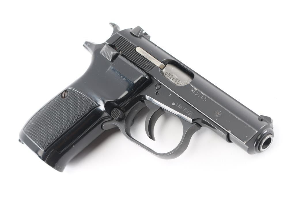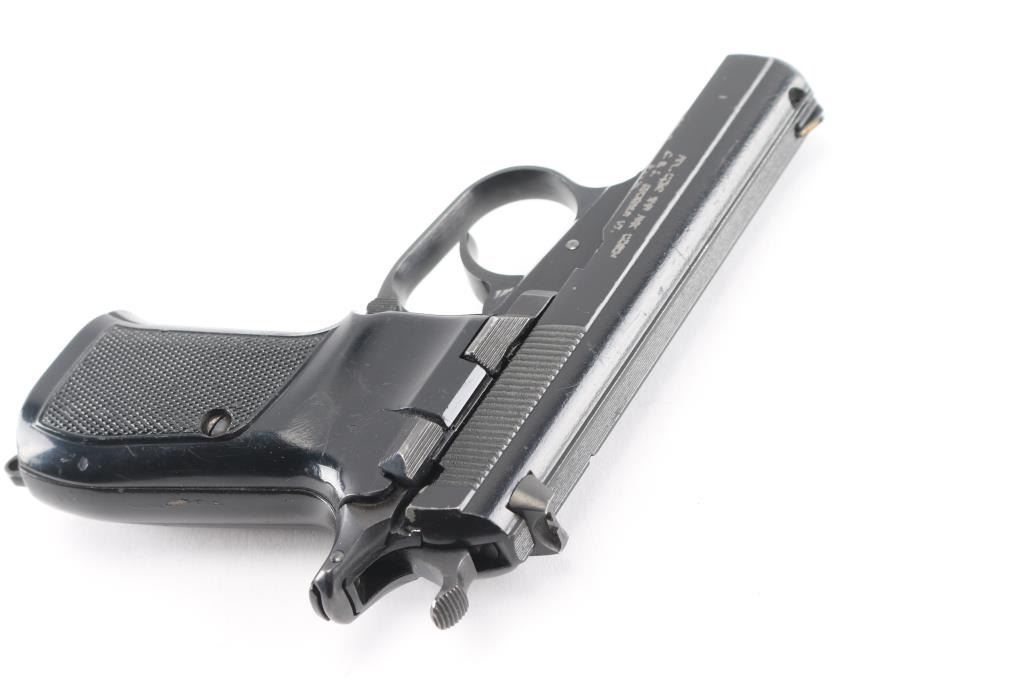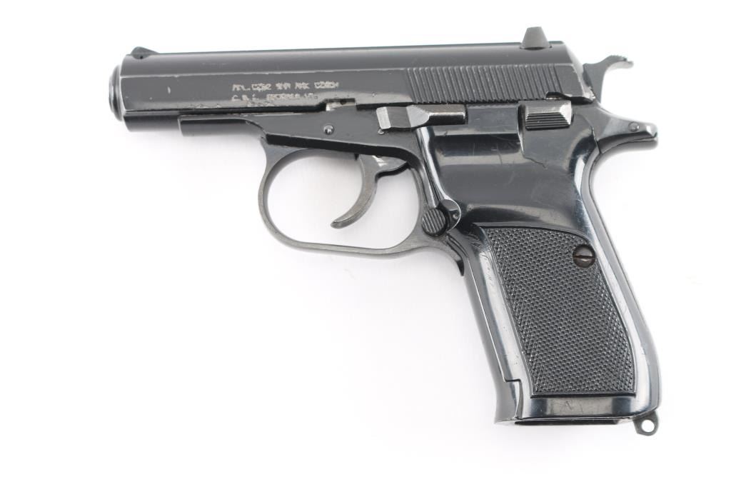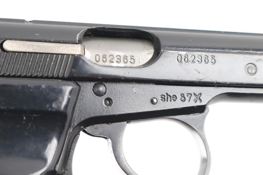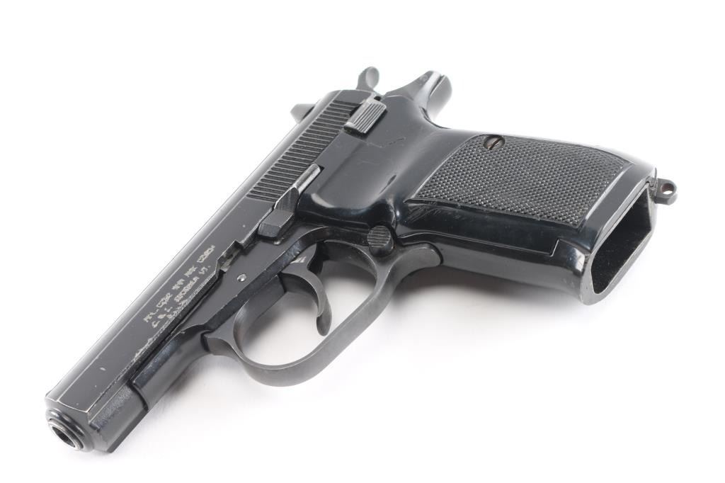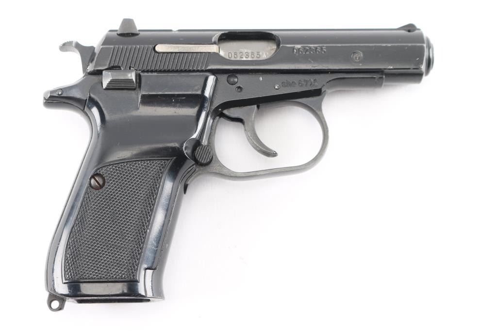 'Pistole Vz.82' Czech single/double action pistol imported by CAI, Georgia VT. Features 3.75" barrel, fixed sights with white front ramp, ambidextrous frame mounted safety, lanyard stud, black plastic checkered grips. Bore is very good condition. Retains 80% black finish, bare metal at sharp edges, scuffs on slide and grip straps. Grips are good to very good condition. NO MAGAZiNE.