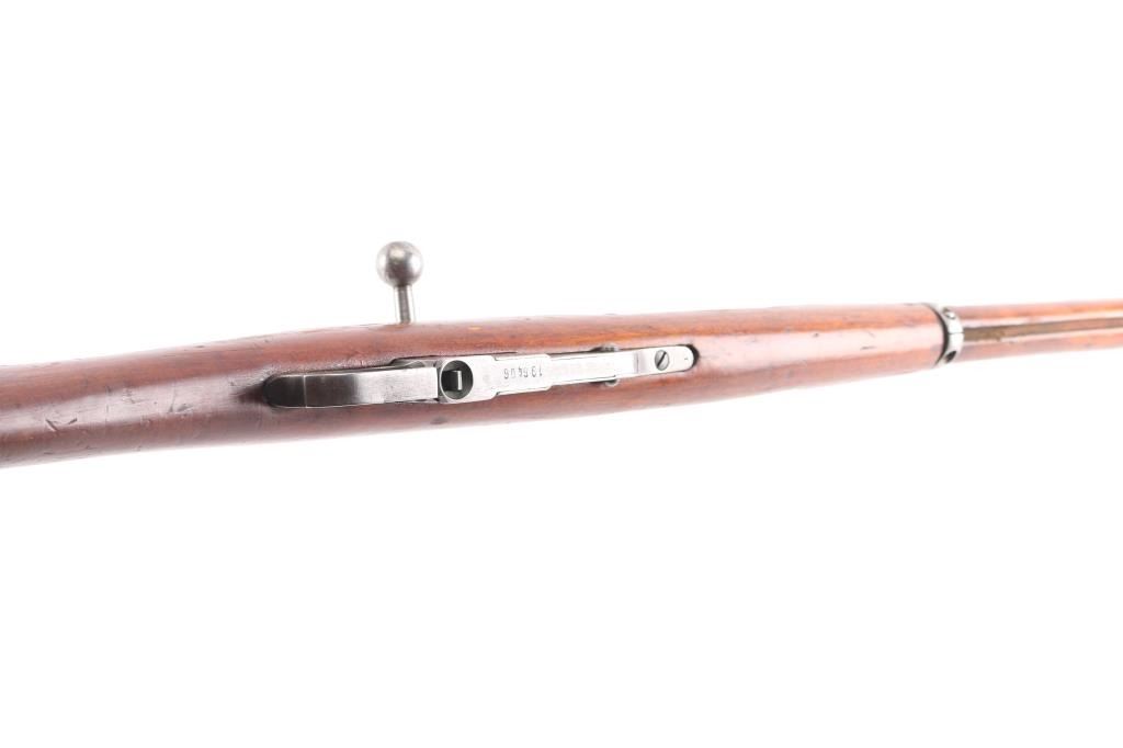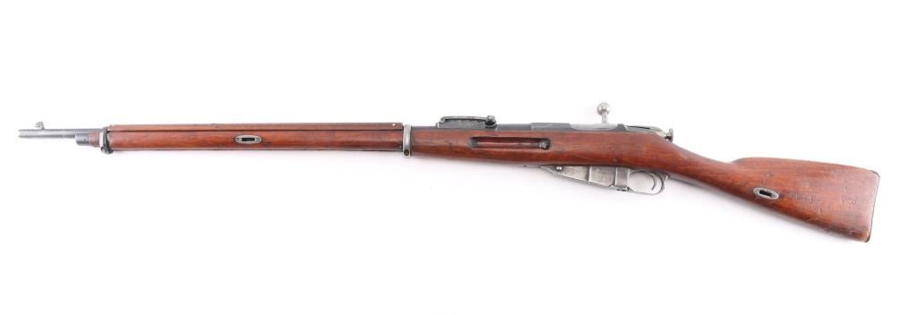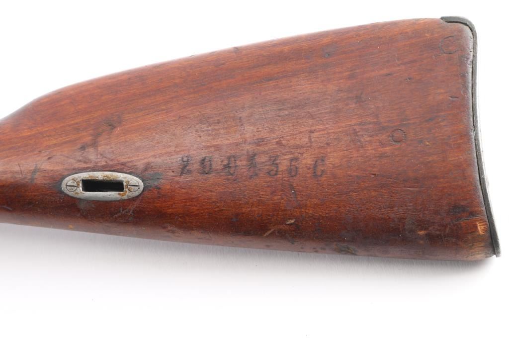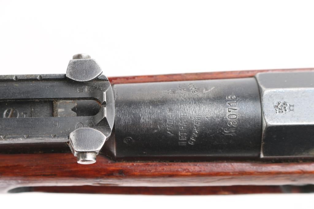 WW1 Imperial Russian military blued bolt action rifle with a 31-1/2" barrel Dated 1915 very feint. Made at the "Tula/ Emperor Peter the Great Ordnance Factory" ,marked on barrel shank, feint from markings being buffed. Imperial crest on barrel, and hex receiver are gone . CAI import mark on upper right barrel. Bore is rough/dark, but rifling present, may improve with cleaning. Wood is good with the usual dents/dings. Action works well. Blued metal finish is mostly there, has dulled somewhat, edge wear, and a couple of rubs on the receiver. Markings are clear, matched serial numbers on barrel,receiver, mismatched bolt, butt plate, & floorplate. Action works well. No cleaning rod.
