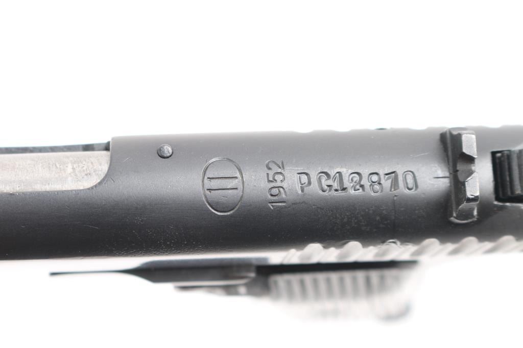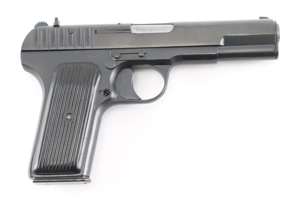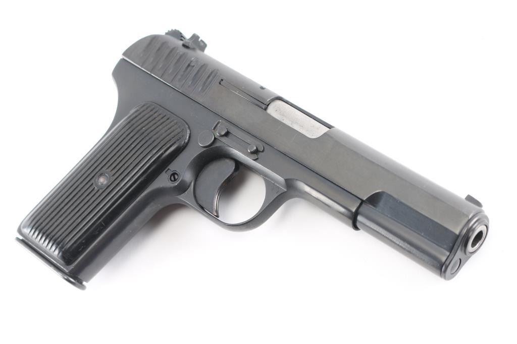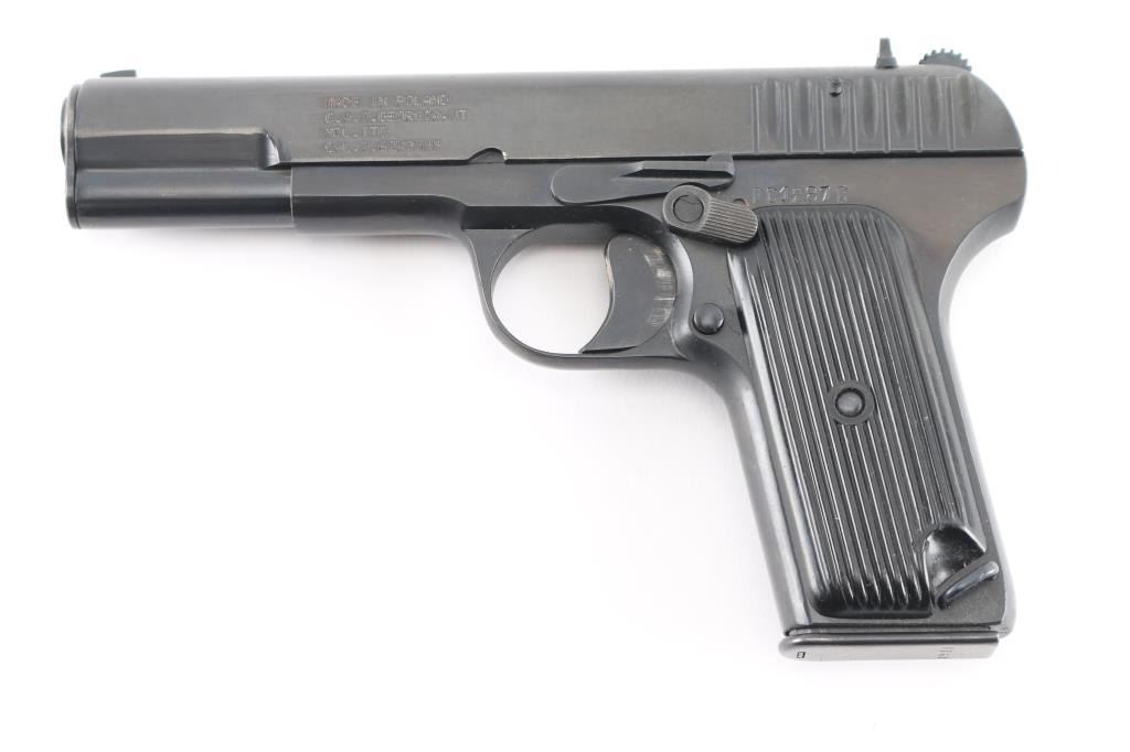 'wz.33' Polish Tokarev copy military pistol imported by CAI, Georgia VT. Features dark blued finish, approx 4.5" barrel, fixed sights, detachable magazine, manual safety on left side of frame, push button magazine release, lanyard loop, black plastic ribbed grips. Bore is very good condition. Retains 95% arsenal re-finish with handling marks. Grips are very good condition. Original markings include 1952 date, "Circle 11". Includes one mismatched magazine.