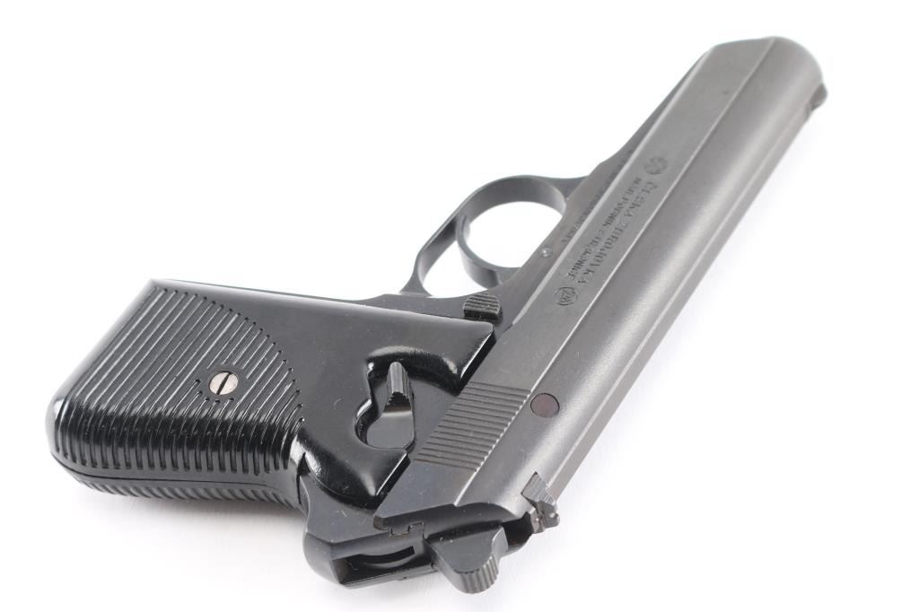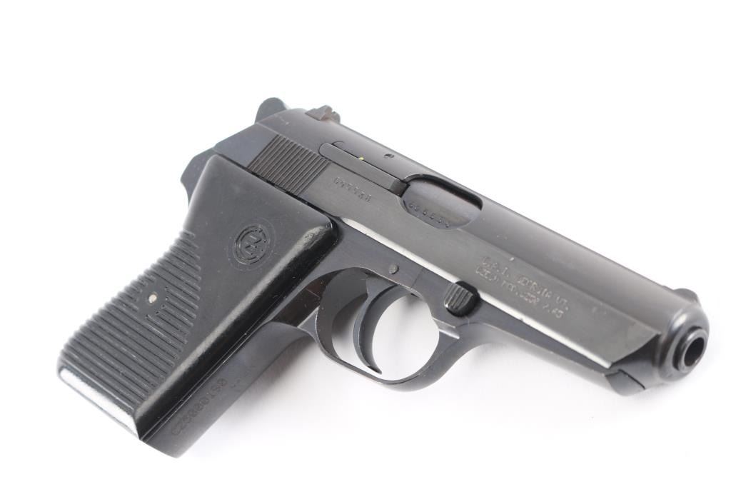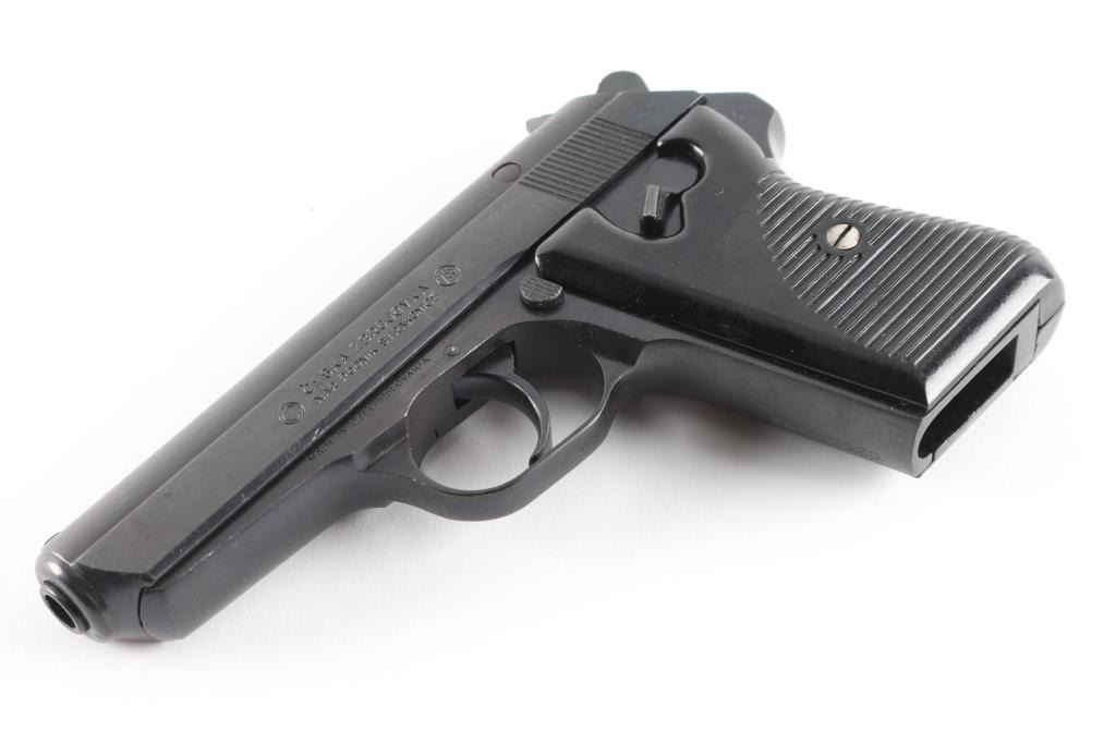 'Vz.50' Czechoslovakian semiautomatic pistol imported by CAI, Georgia VT. Dated 1950. Features fixed sights, approx. 3.5 inch barrel, frame mounted manual decocker/safety, double and single action, black plastic "CZ" logo grips with ribbed texture. Bore is very good condition. Probably reblued before importation, retaining 95% finish with handling marks. Grips are very good. Serial is importer applied, previous numbers visible on slide & barrel. No Magazine.