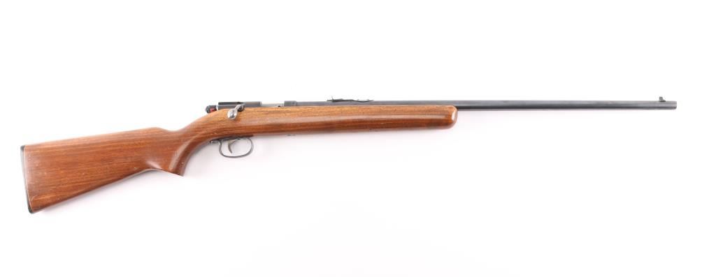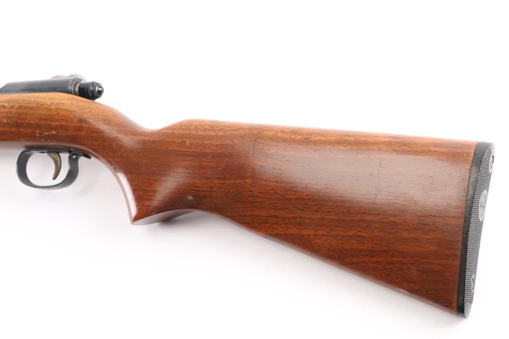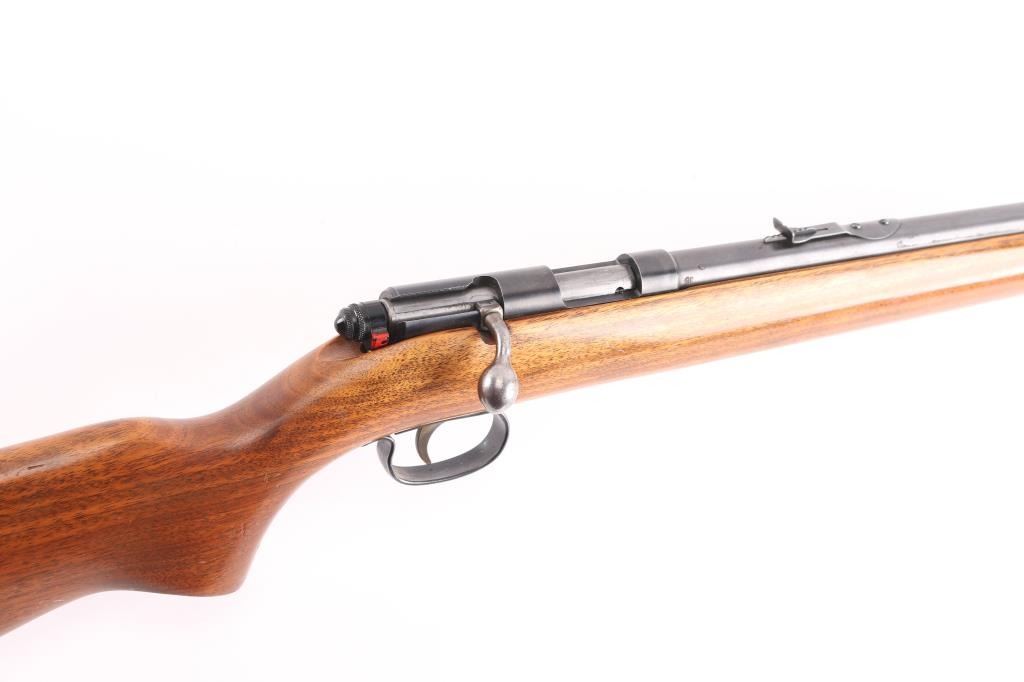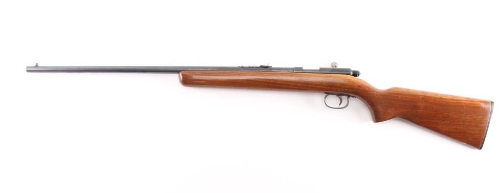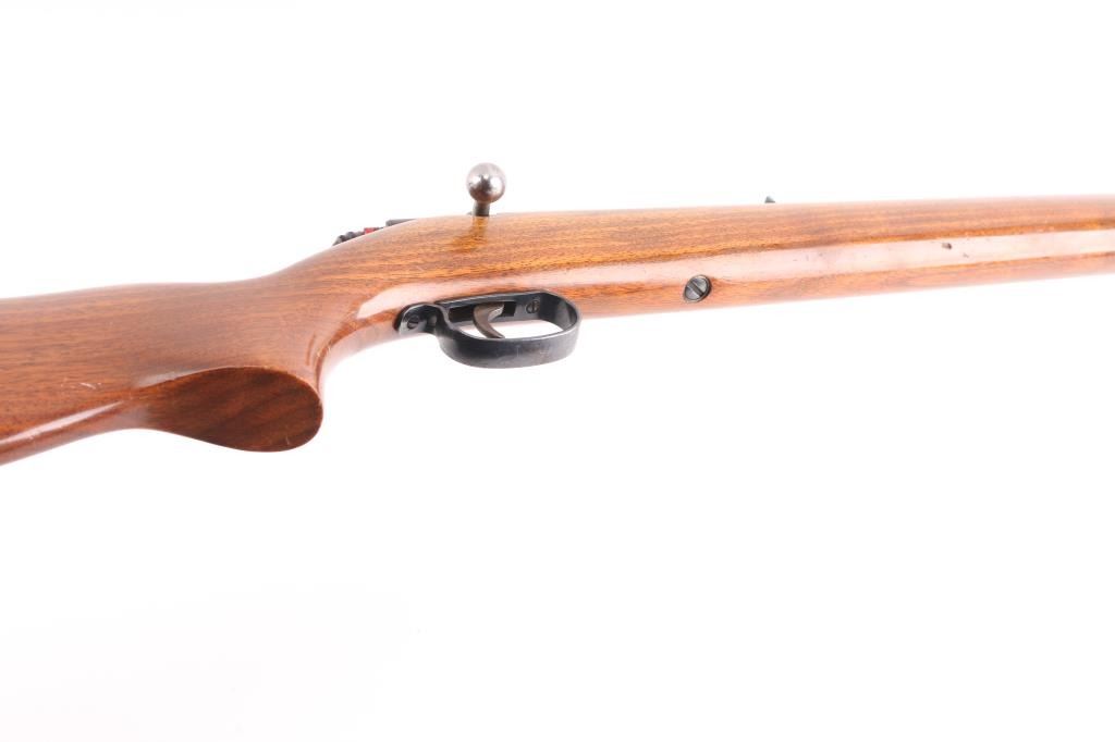 Vintage Bolt-Action Single-Shot rimfire rifle chambered for .22 Short, Long and Long Rifle cartridges, circa 1951. Features blued finish, smooth walnut stock, 24" barrel, dovetailed blade front sight, adjustable notch rear sight, metal trigger guard, smooth trigger, rotating cocking piece safety. Bore is very good condition. Retains 85% finish, some drifting towards gray color, with edge losses and scratches. Stock is very good, varnished, some dents and dings, possibly refinished.