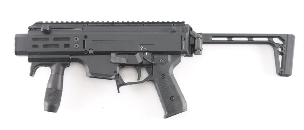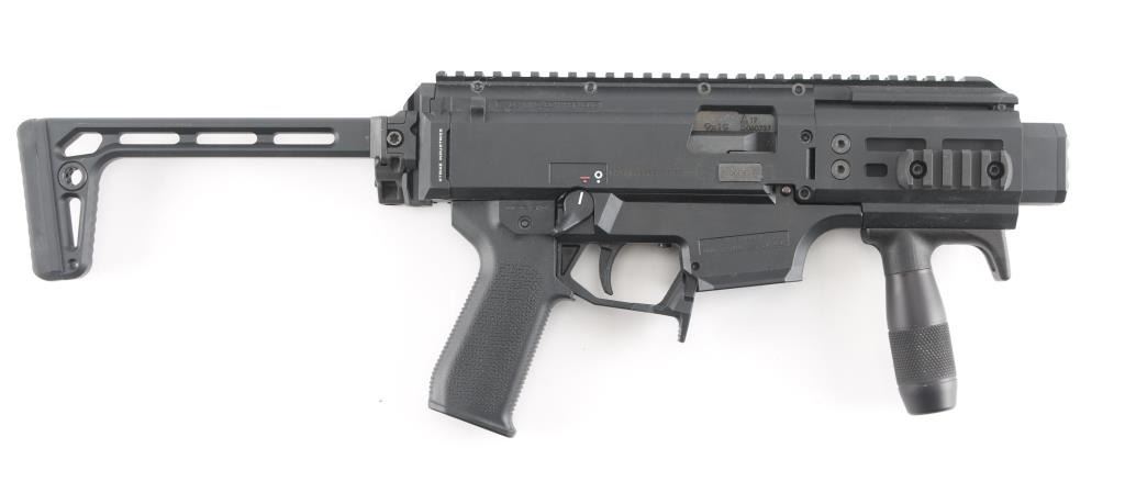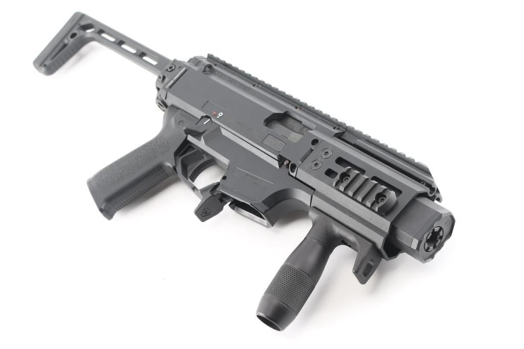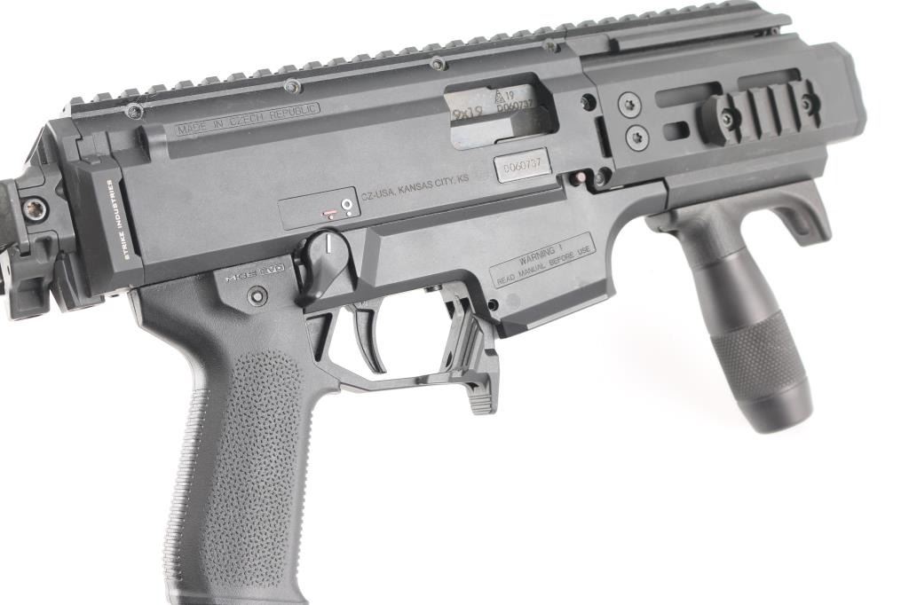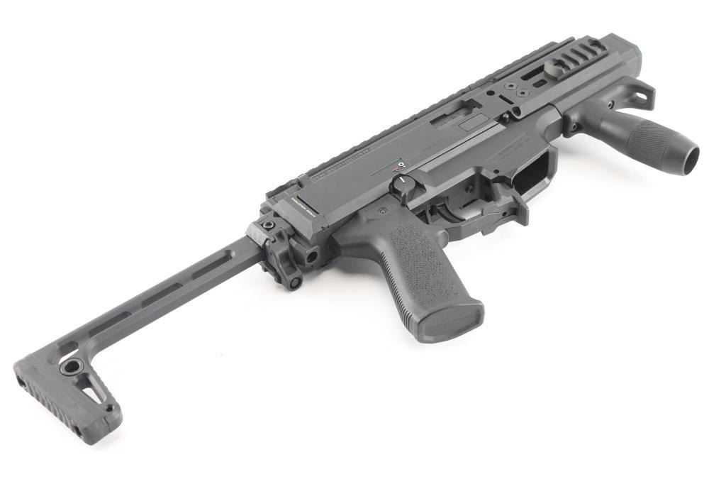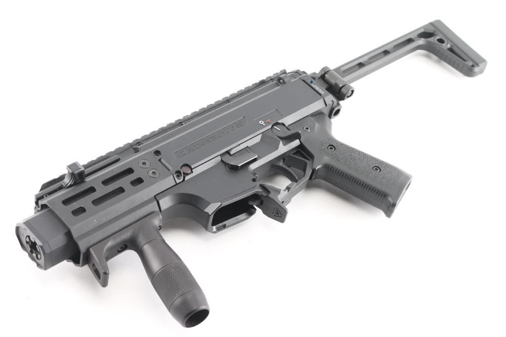 'Micro Scorpion' Semi-automatic short barreled rifle variant of the blowback-operated EVO 3 A1 submachine gun chambered in 9x19mm. Manufactured in Czech Republic circa 2019. Features a 4” cold hammer forged steel barrel with SilencerCo faux suppressor, left or right side swappable non-reciprocating charging handle, 4.25” aluminum M-LOK compatible handguard, A3 Tactical vertical foregrip, black fiber-reinforced polymer receiver with 11” optics rail, ambidextrous 45° safety selector lever, textured polymer trigger, Strike Industries paddle style magazine release, no magazine, Magpul MOE EVO pistol grip, Strike Industries end plate with integral QD cup and Sig Sauer left-side-folding aluminum shoulder stock with QD cups, rubber recoil pad & 12 ?” LOP. SBR shows a few scattered scuffs and dings. The action is mechanically sound, the bore is excellent and the polymer is excellent.