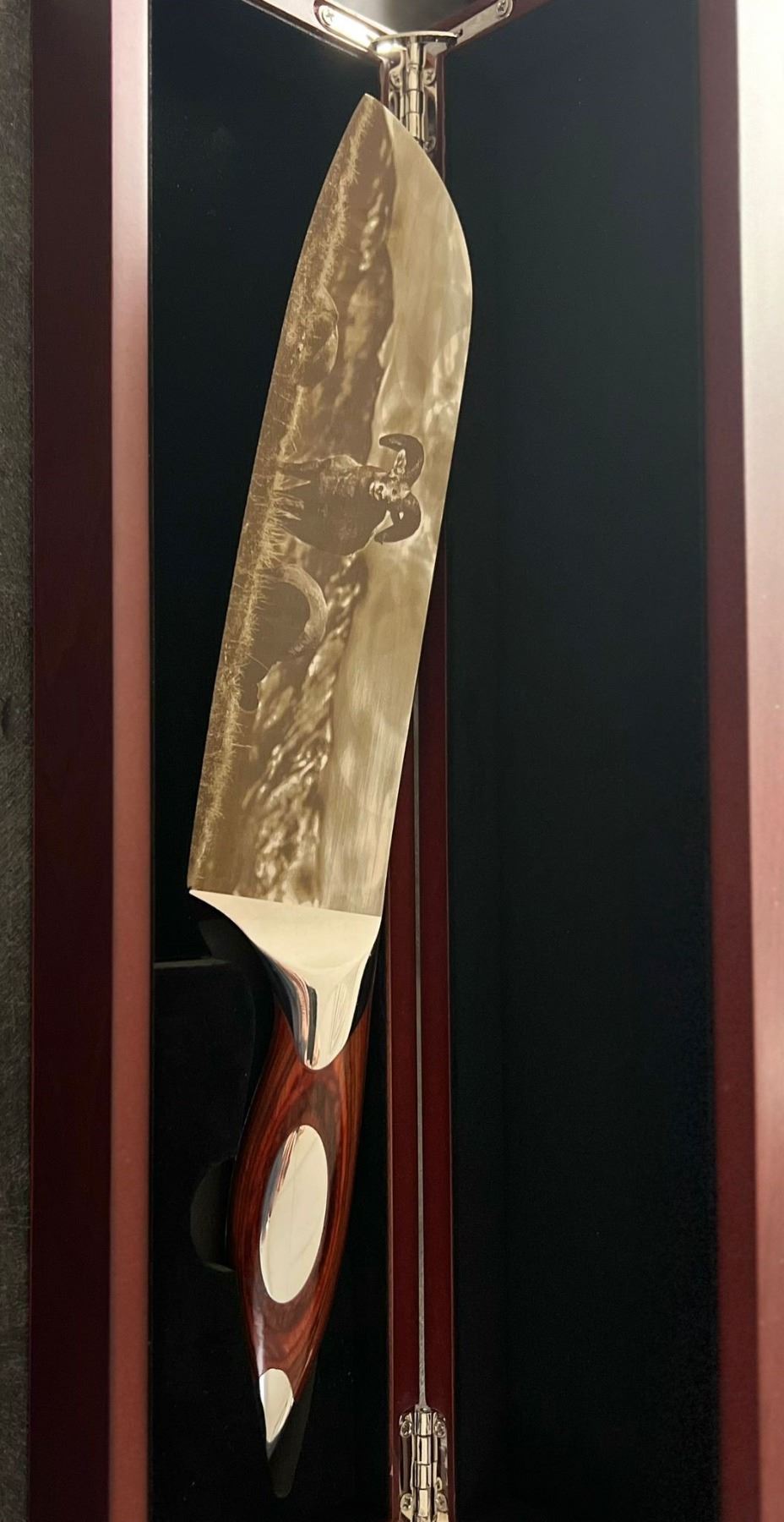 Full Blade Rocky Mountain Big Horn Sheep chefs Knife made on High Carbon German Steel in wooden DSC Logo display box.