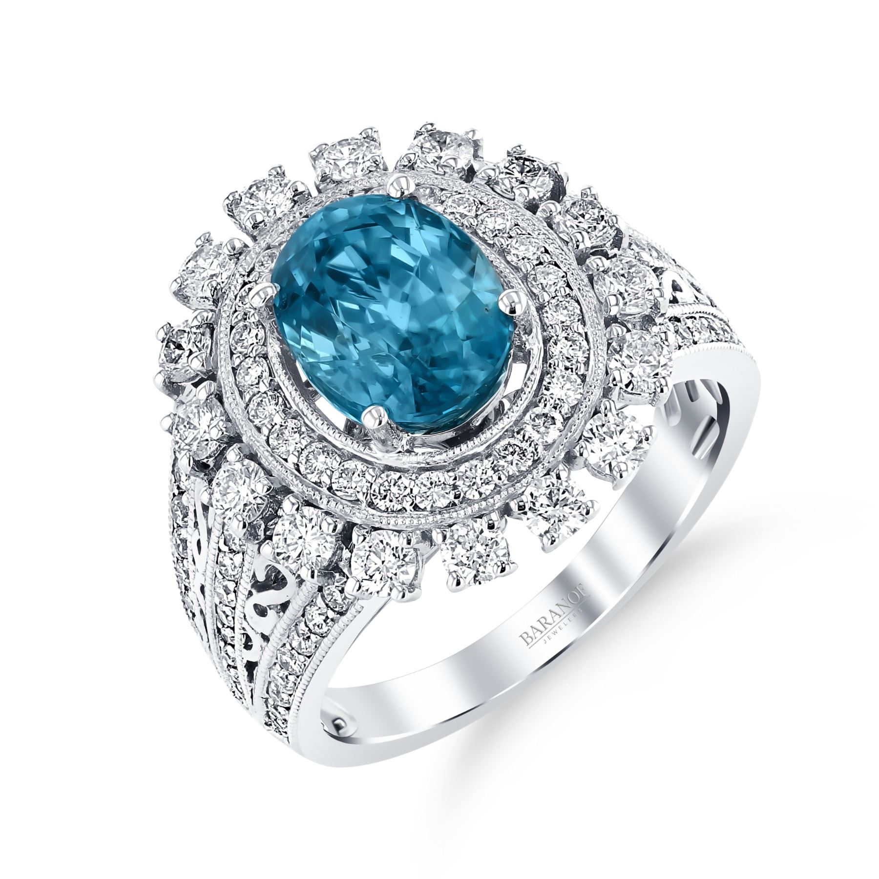 Natural Blue Zircon and diamond ring set in 14 karat white gold set a 4.00 carat natural blue zircon and surrounded by 1.225 total carat weight of natural diamonds, color 4 clarity VS1.