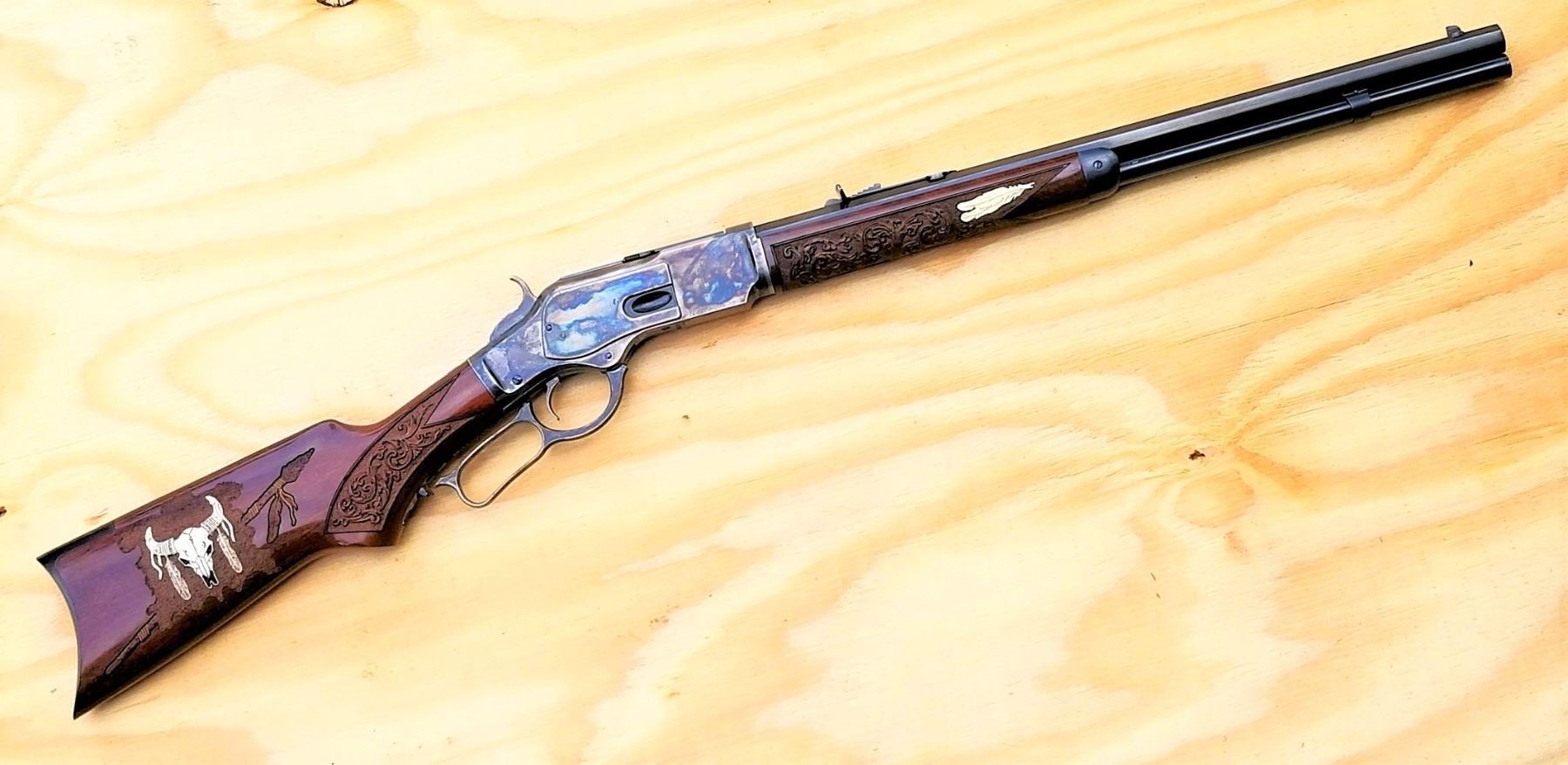This is a one-of-a-kind rifle featuring an action with a charcoal case hardened finsish, custom western scrolls on the pistol grip and forearm, inlaid cast Ivory buffalo skull in the butt stock with feathers on both sides of the forearm.