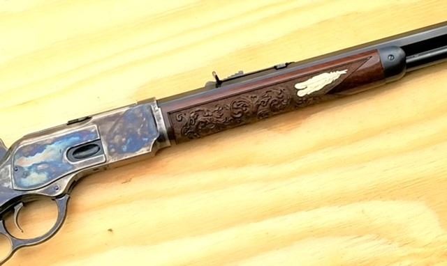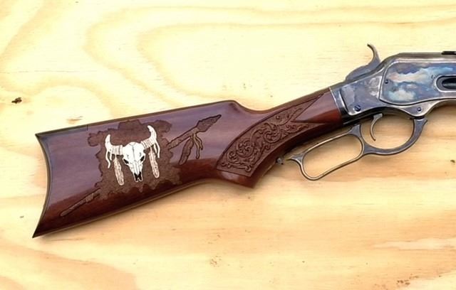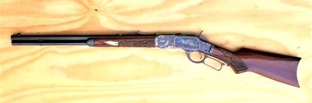 Lot 3A 1873 Winchester 32 WCF made by Uberti for Cimarron featuring a custom carved stock
