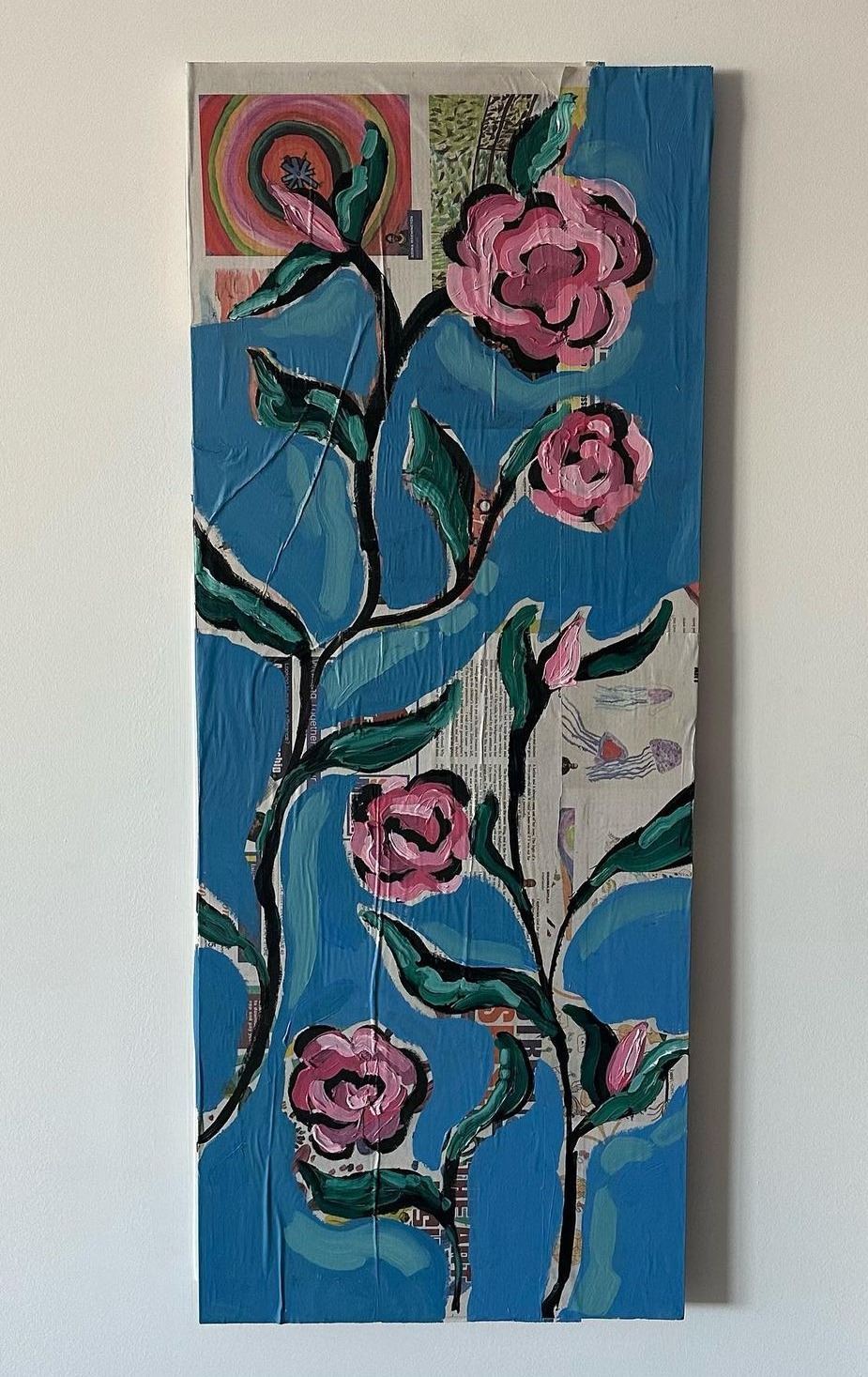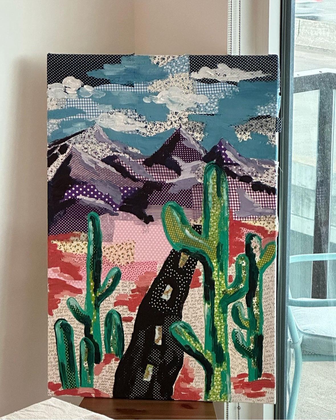 She now primarily experiments with mixed media collages, often using colorful fabrics and heavy body acrylic.