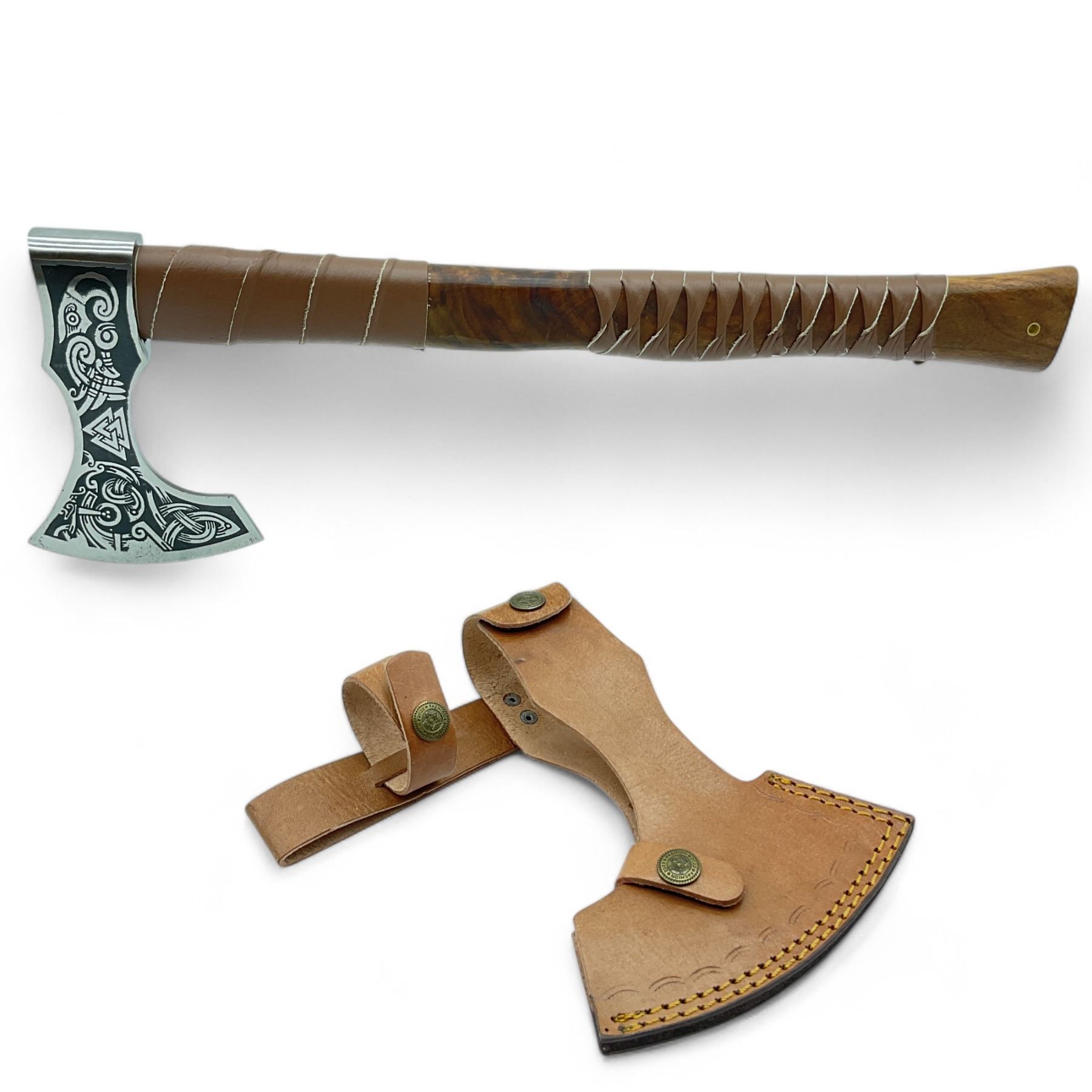 Fixed 5" Blade Axe with Leather Wrapped Wood Handle and Leather Sheath