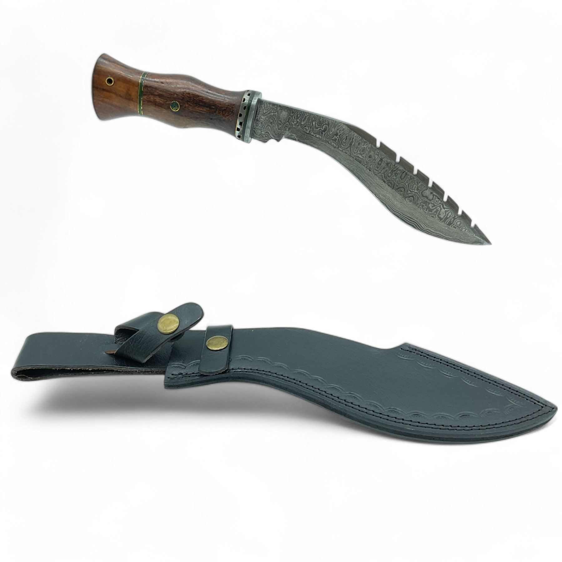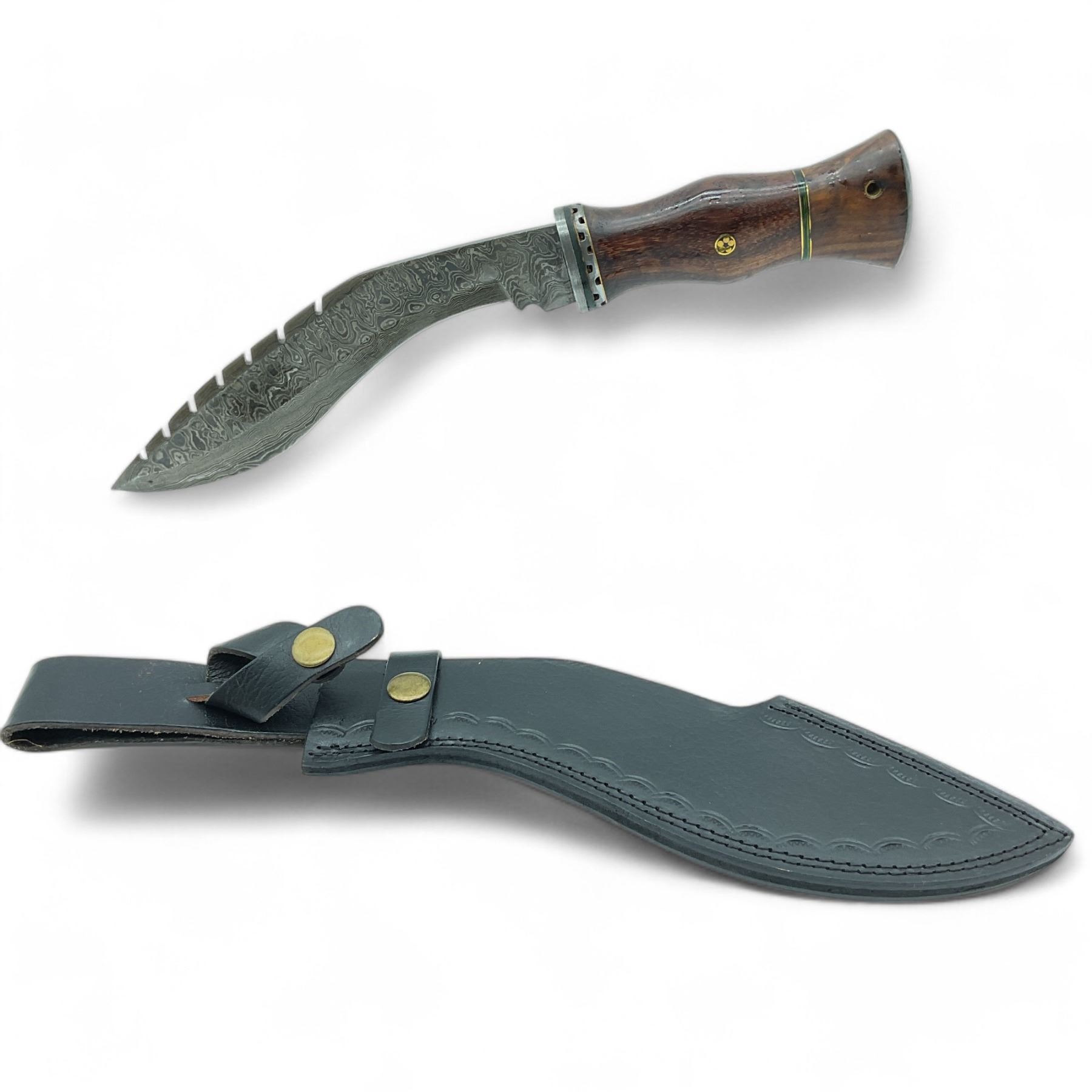 Fixed 8-1/2" Damascus Kukri Blade Knife with Wood Handle and Leather Sheath