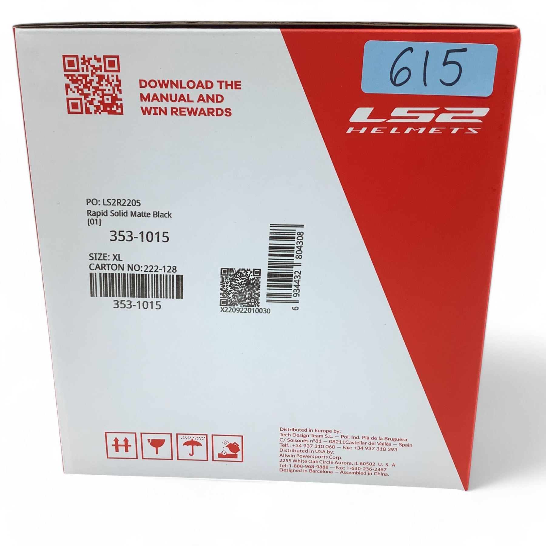 Lot 615 LS2 Rapid Full Face Helmet, Solid Matte Black, Size: XL, New