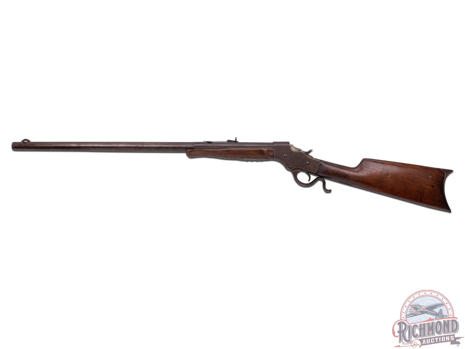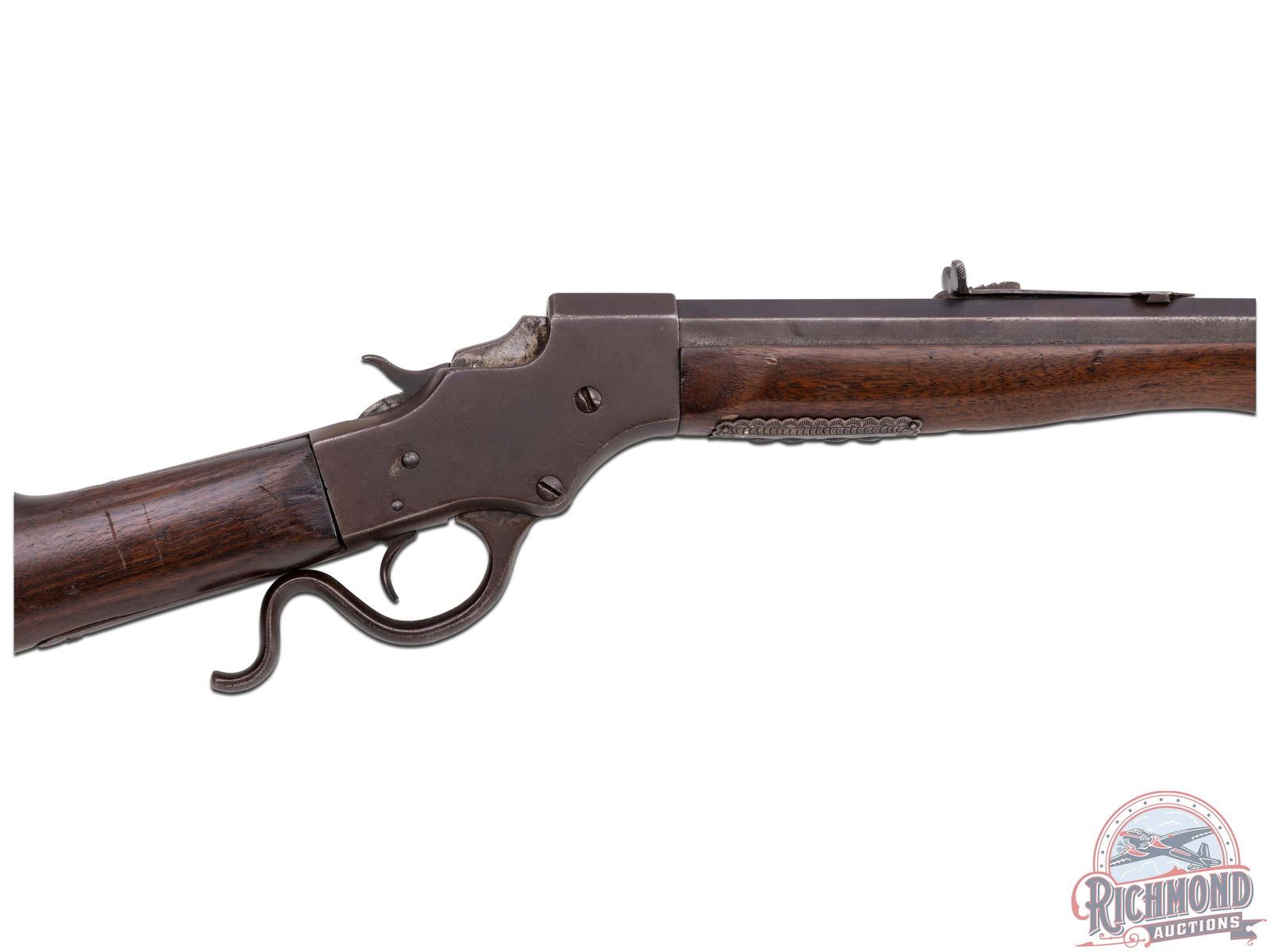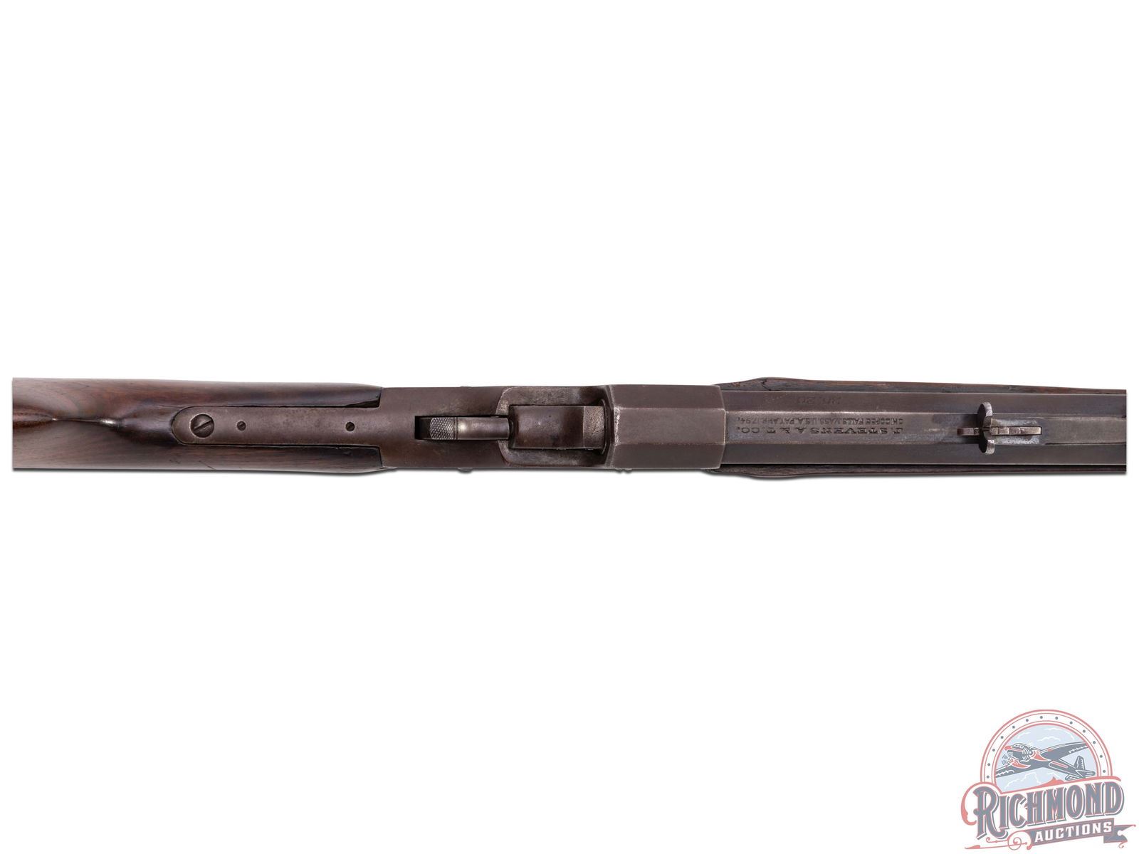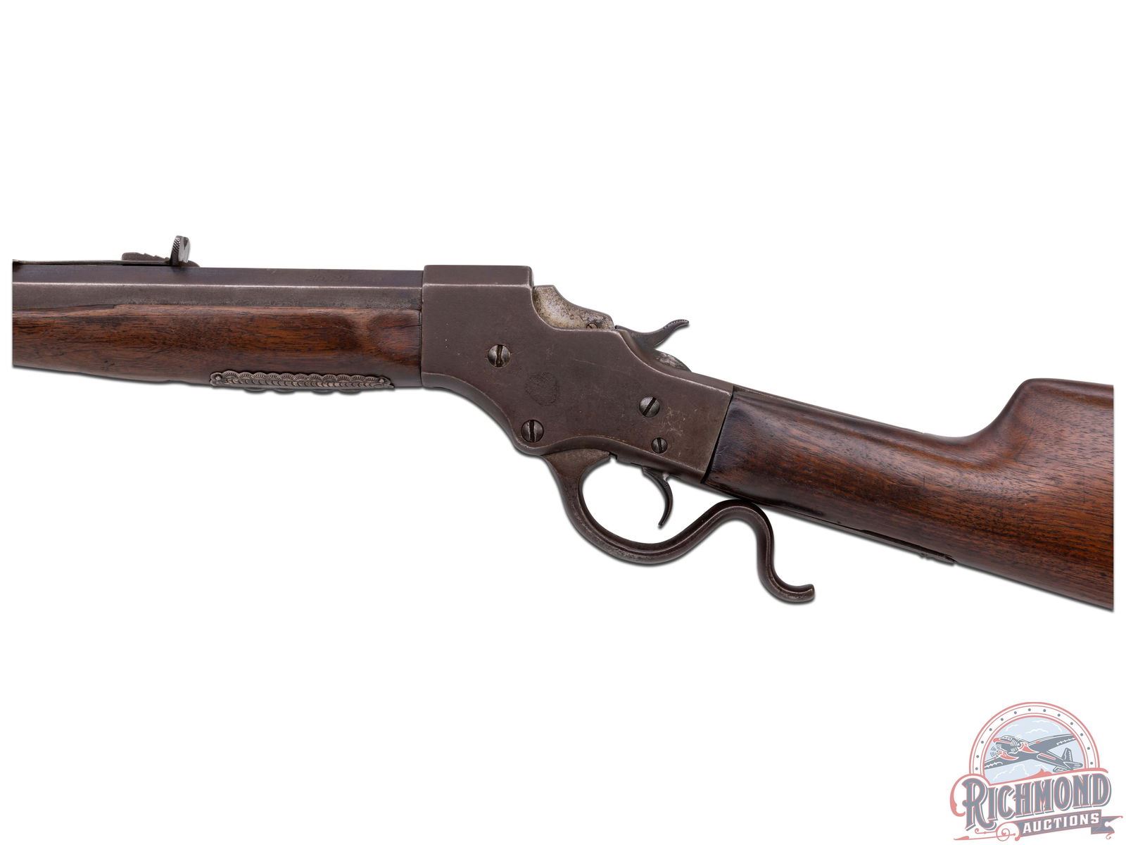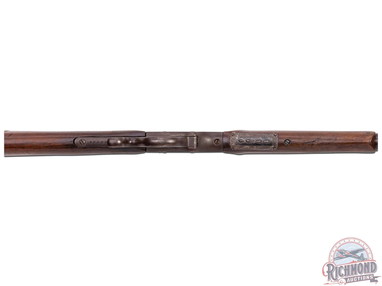 Made by J. Stevens Arms and Tool Company, circa 1900. Rifle has floral embossed gold or brass inlay work on right side of stock in "101" design, possibly indicating a connection to the famous 101 Ranch. Rifle also has a highly decorated sterling silver plate as possible protection during saddle use. 25-1/4" blued No. 2 weight barrel in "25-20" with hunting sights and standard Stevens barrel markings. Case-hardened 44 action with plain trigger and standard opening level. Standard walnut plain stocks embellished with "101" markings. CALIBER: 25-20. S/N: 50141. FFL STATUS: Curio & Relic.