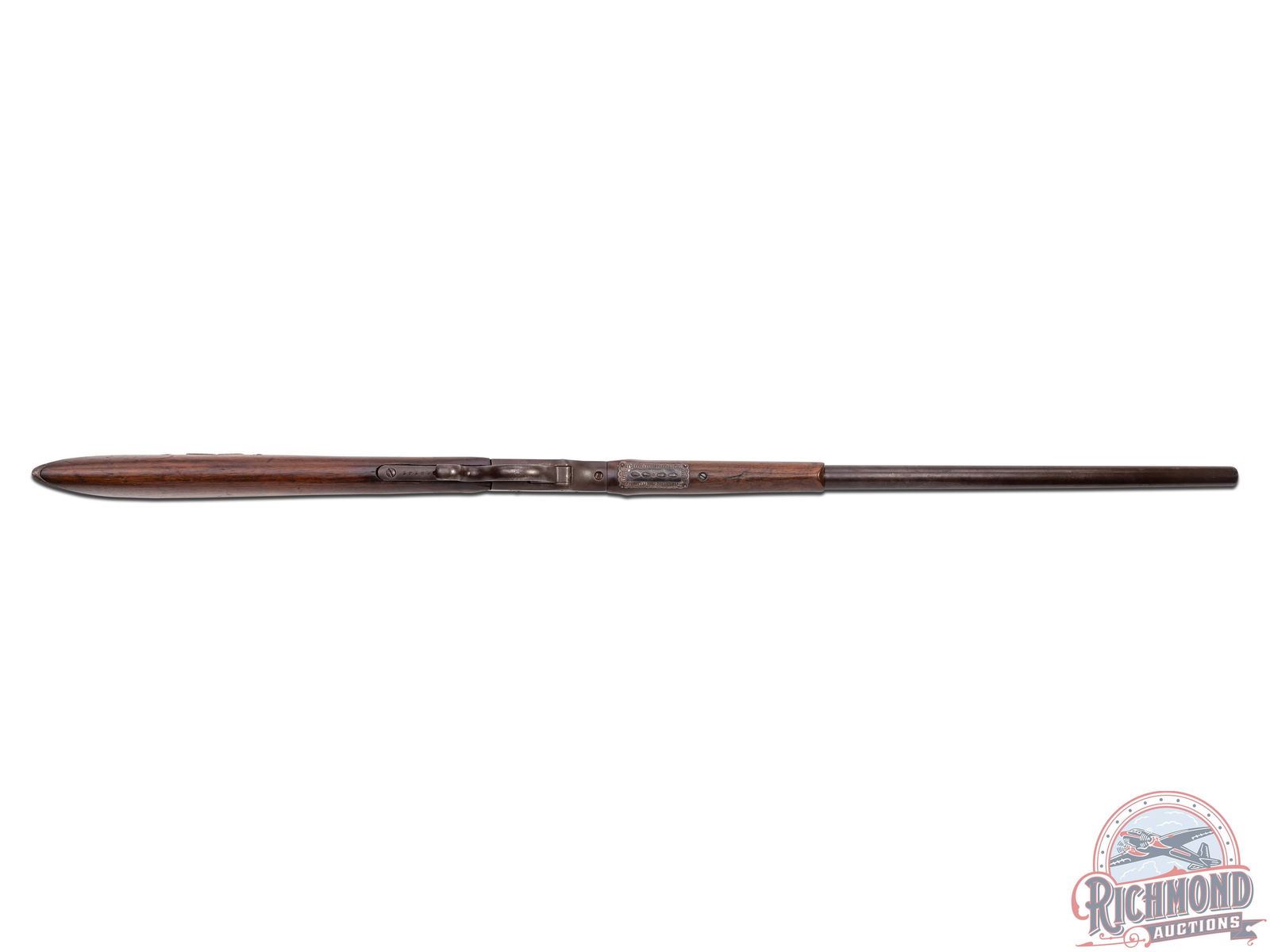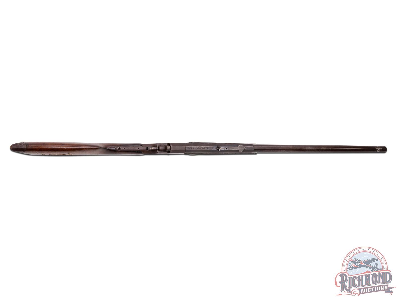 Overall Fair with metal having a silvery brown appearance. Action has faded to brown. Traces of original varnish with crack in forearm and usage dings and marks. Frosted bore with visible rifling and soft mechanics.
