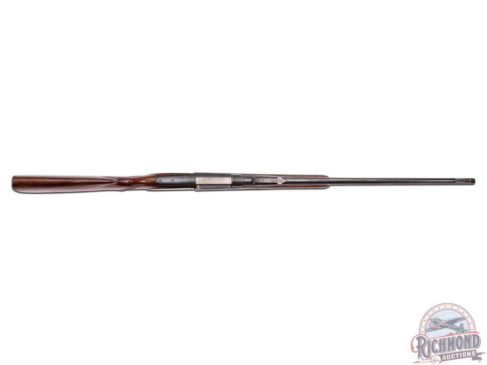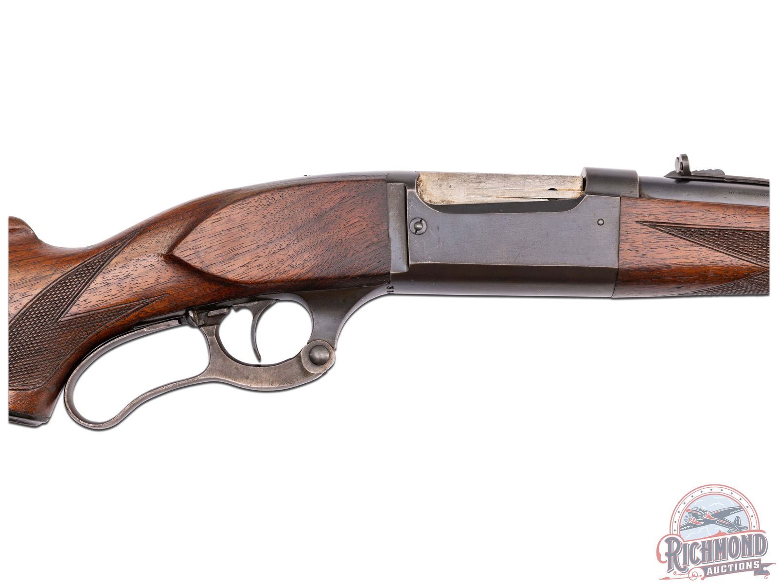 Manufactured in 1937. Features a 24" blued tapered barrel with ramp blade brass bead front sight and rear adjustable buckhorn sight. Barrel is stamped center top "SAVAGE ARMS CORPORATION / UTICA, N.Y. - MADE IN U.S.A.". Serial number is stamped under the receiver in front of the lever. Safety lever switch and cocking indicator. Walnut stock and foregrip with deluxe hand-checkering 18 LPI. Fitted with a factory "SVG" steel butt plate and swivel studs. LOP: 13-1/2". CALIBER: 300 SAVAGE. S/N: 364677. FFL STATUS: Curio & Relic.