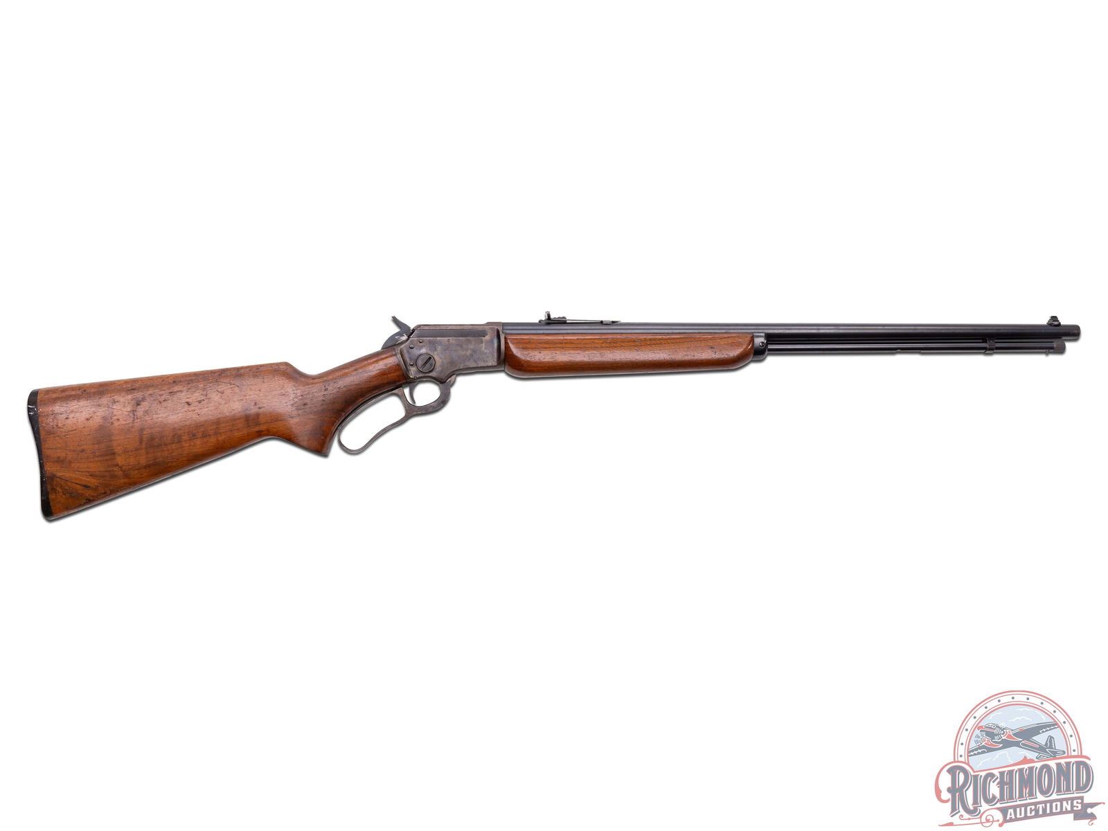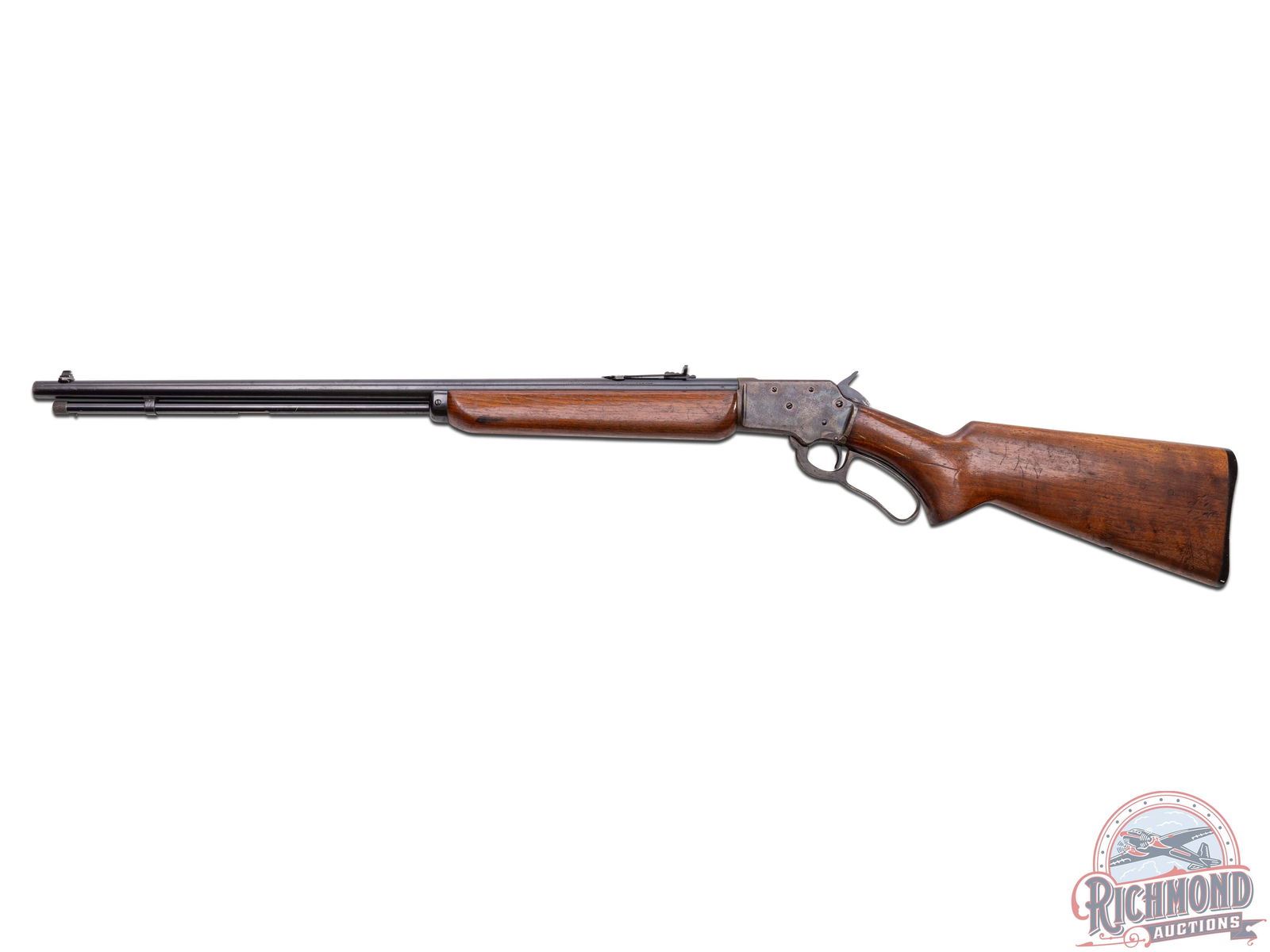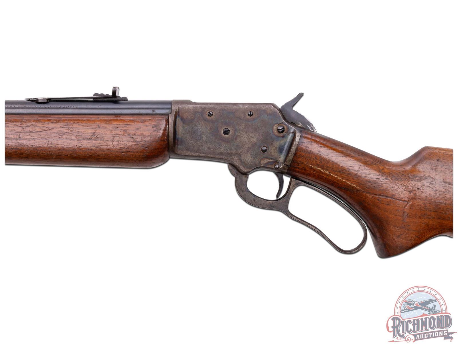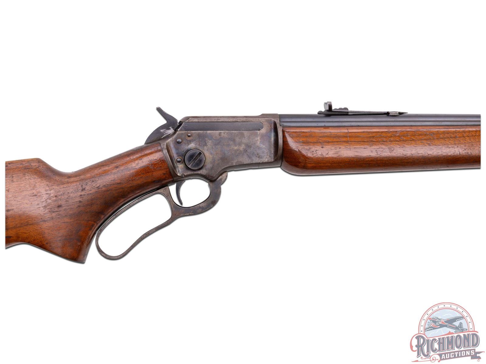 Made by Marlin Firearms Company in 1941. 24" blued round steel barrel with Marlin two-line address and 22 S, L, LR caliber marking with bead pedestal front sight and adjustable Buckhorn rear sight. Case-hardened takedown receiver with blued full tubular magazine and plain trigger. Walnut plain pistol grip stock with Marlin hard rubber butt plate and "Bullseye" stock inlay (missing). Matching swelled plain forearm with plugged sling swivel hole. J.T. Livengood Collection. CALIBER: 22 L, S, LR. S/N: B3340. FFL STATUS: Curio & Relic.