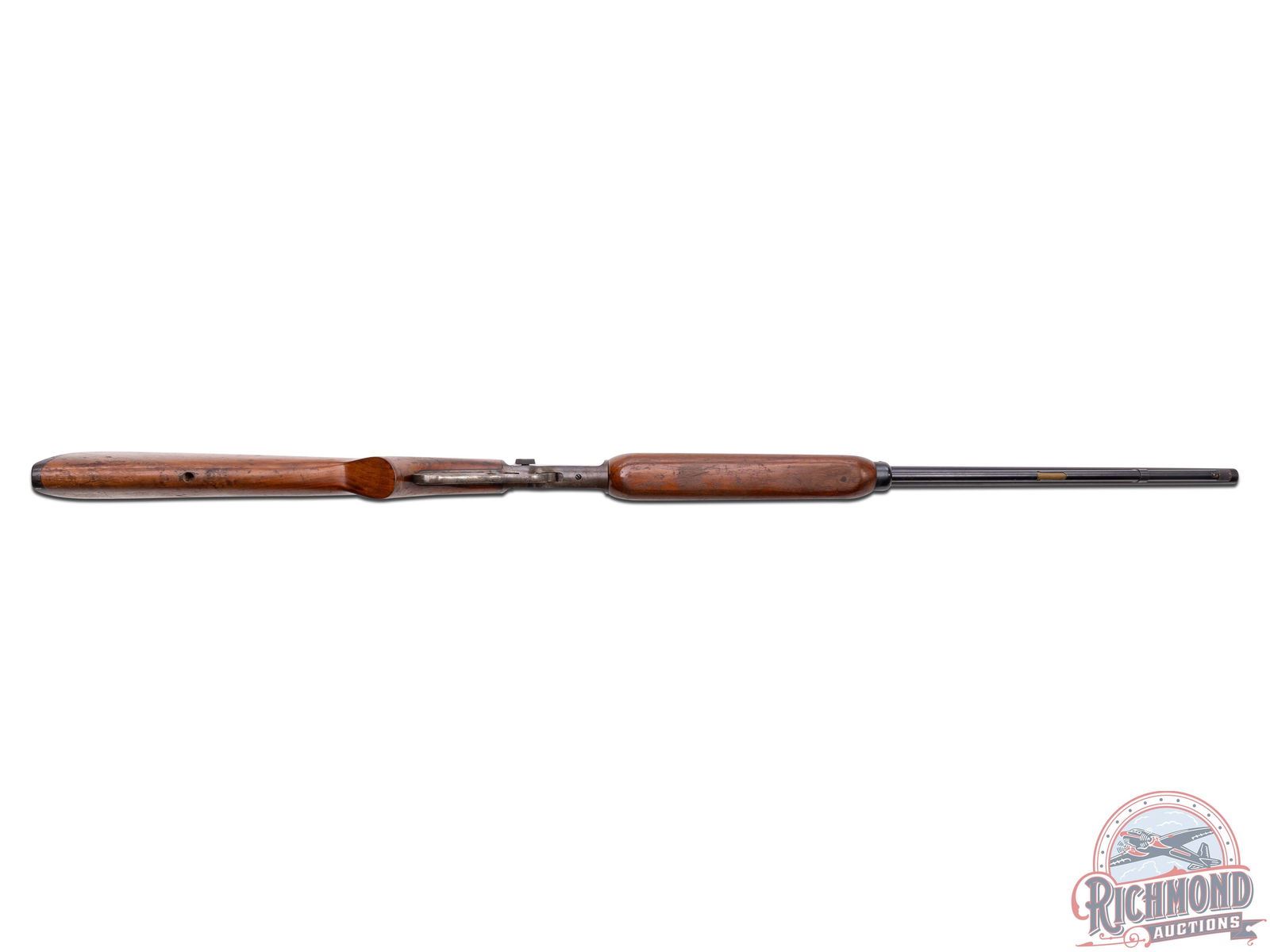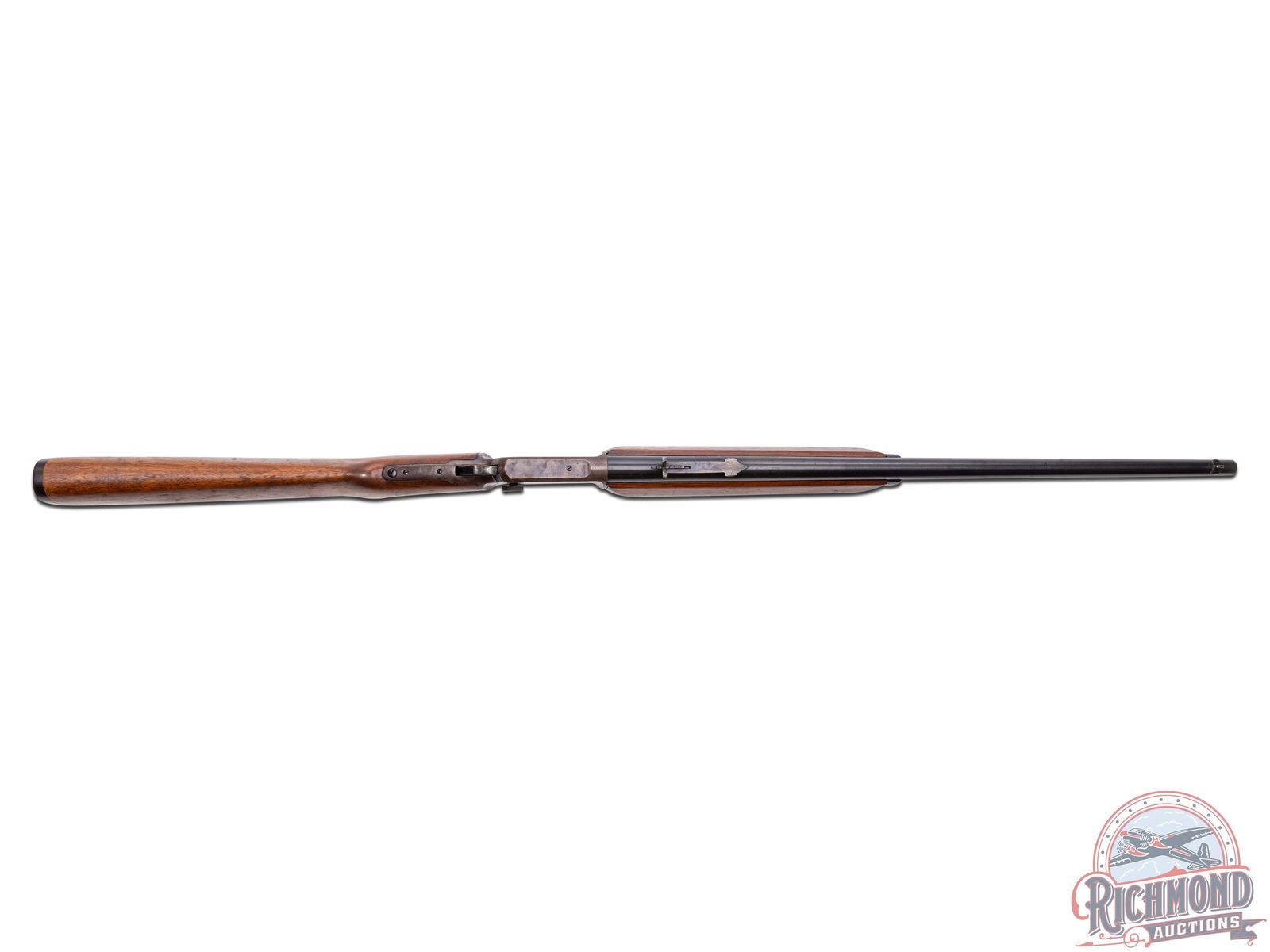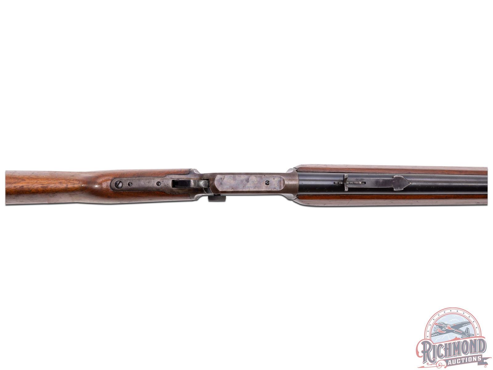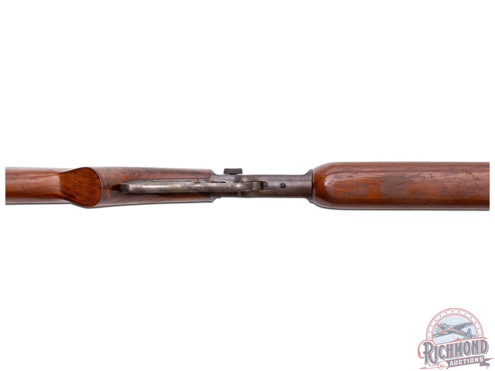 Made by Marlin Firearms Company in 1941. 24" blued round steel barrel with Marlin two-line address and 22 S, L, LR caliber marking with bead pedestal front sight and adjustable Buckhorn rear sight. Case-hardened takedown receiver with blued full tubular magazine and plain trigger. Walnut plain pistol grip stock with Marlin hard rubber butt plate and "Bullseye" stock inlay (missing). Matching swelled plain forearm with plugged sling swivel hole. J.T. Livengood Collection. CALIBER: 22 L, S, LR. S/N: B3340. FFL STATUS: Curio & Relic.
