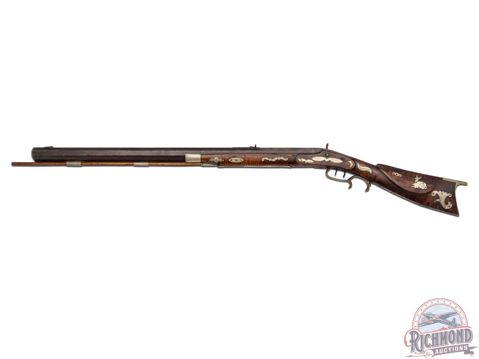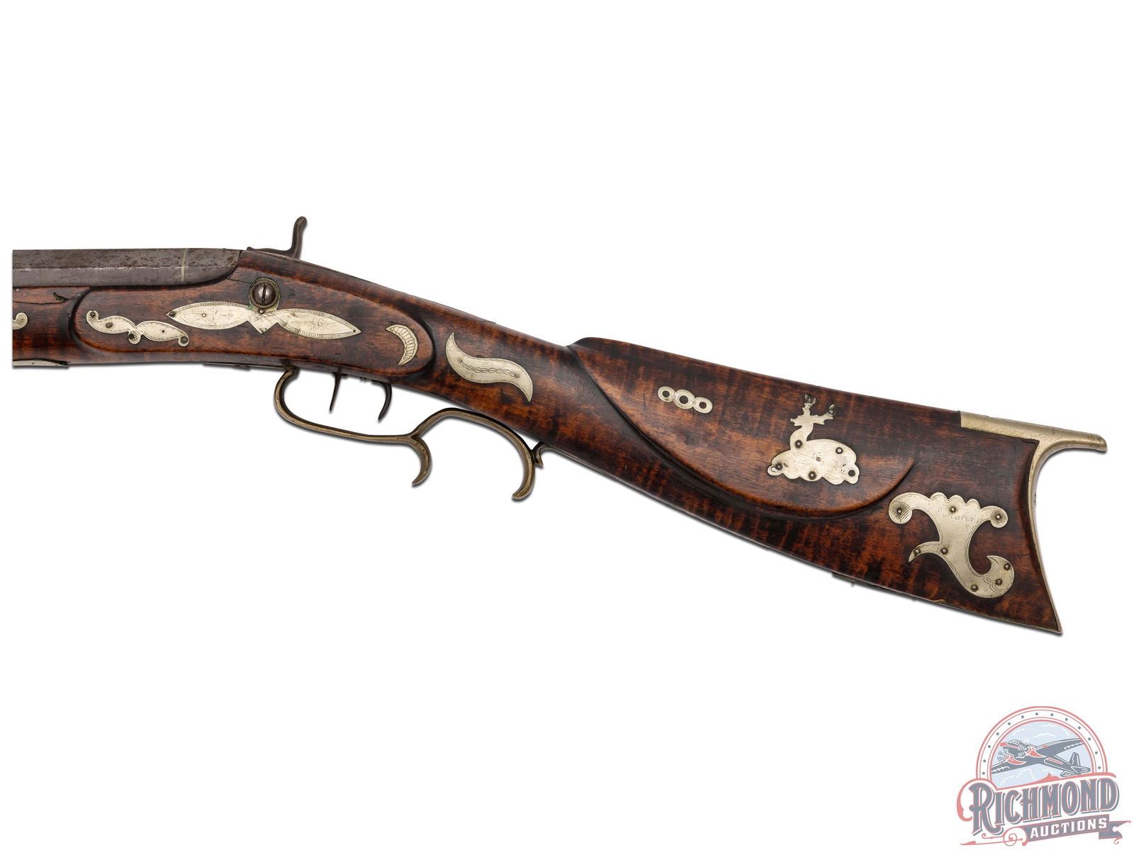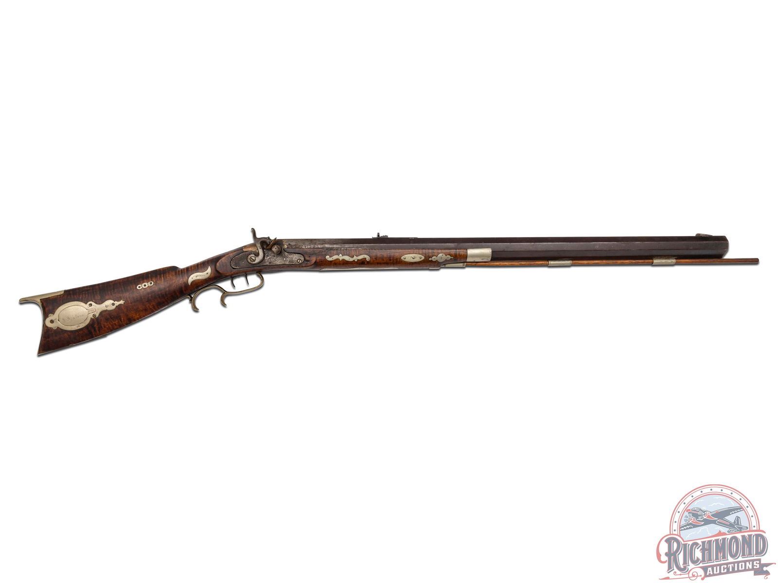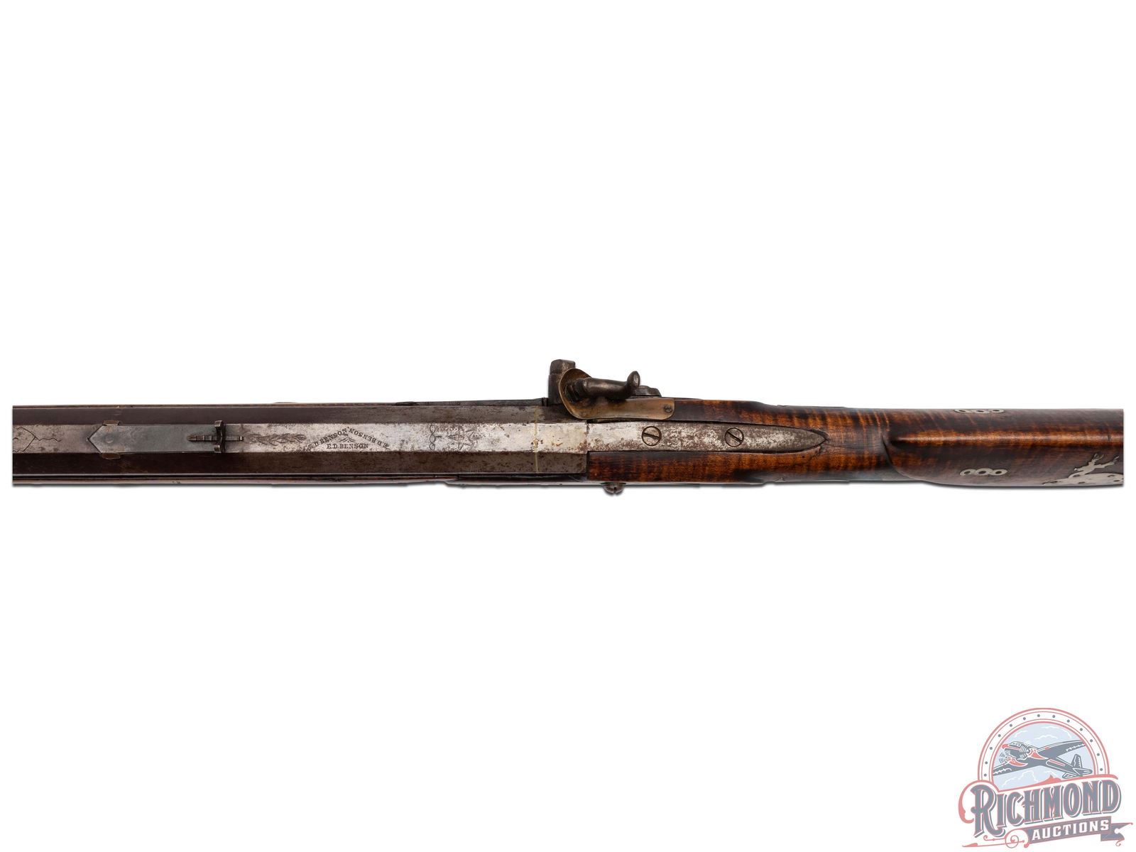 Made by Ezra D. Benson, who worked in Farmington, West Virginia, circa 1860. Rifle has several other marks on rifle that are probable owners. "J.Malone" which is in script in patchbox lid and on a morning glory inlay on left stock side. Barrel has "O.J. Stump", which appears to be a later addition. Being the configuration of this gun, it is believed these men were probably former local shooters at the area "BEEF" Shoots and were probable owners. Rifle measures 47-1/2" overall, weighing a hefty 17-3/4 lbs. Rifle has a massive 31-1/2" octagon 45 caliber rifled barrel, measuring 1-1/4" from barrel flat to barrel flat. Barrel is signed by Benson in his usual three name stamping pyramid with a gold barrel ring at breech. Barrel has a Rocky Mountain front sight and adjustable rear notch sight. Barrel has some squiggle engraving and a 5 pointed star. Commercial percussion lock with flash protector and double set trigger control. Curly maple half-stock with a bit of a fish belly possibly for shooting off a sandbag off a bench. Stock has 15 silver inlays with a brass trigger guard, German silver butt plate, ferrels, and nose cap. Silver oval patchbox, toeplate, and saddle plate, all floral engraved. Comes with hardwood ramrod and document of its presence in a Moundsville, West Virginia collection. CALIBER: 45. FFL STATUS: Antique.