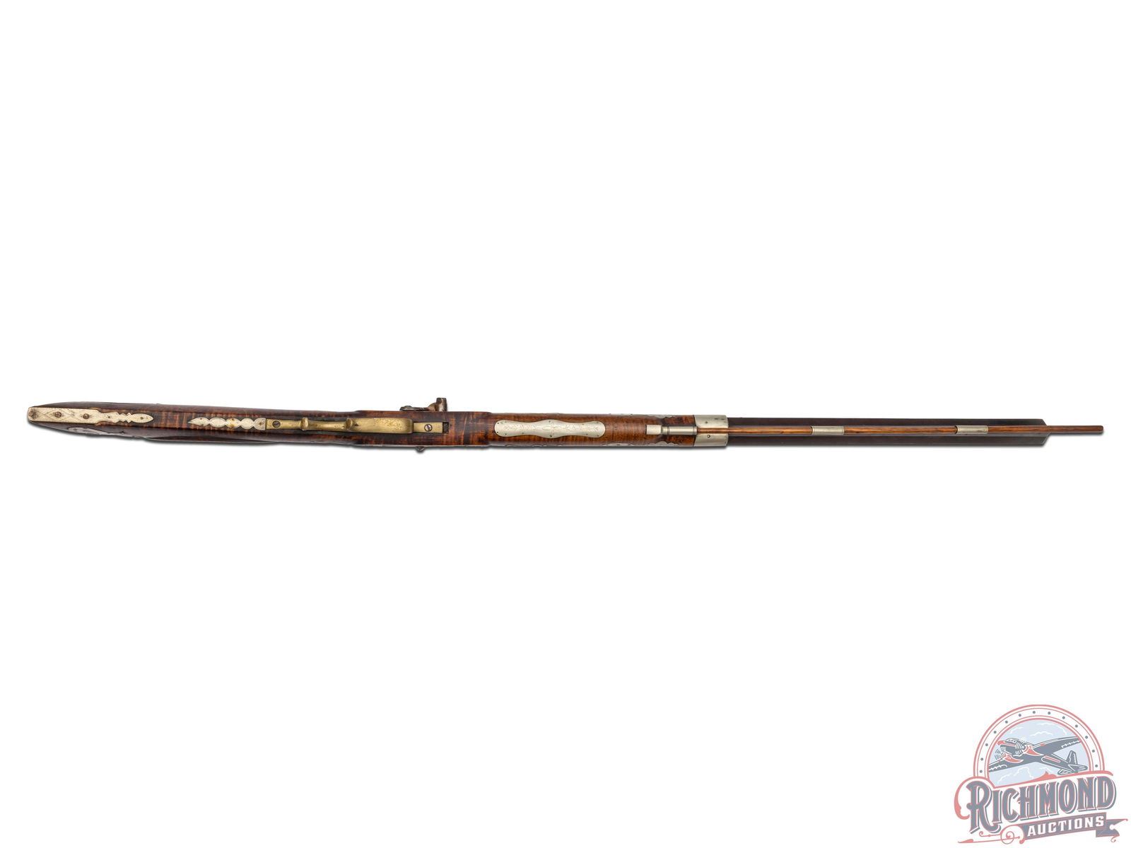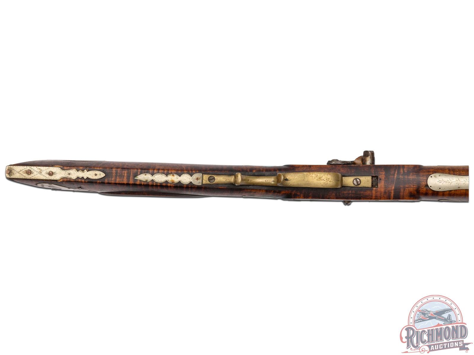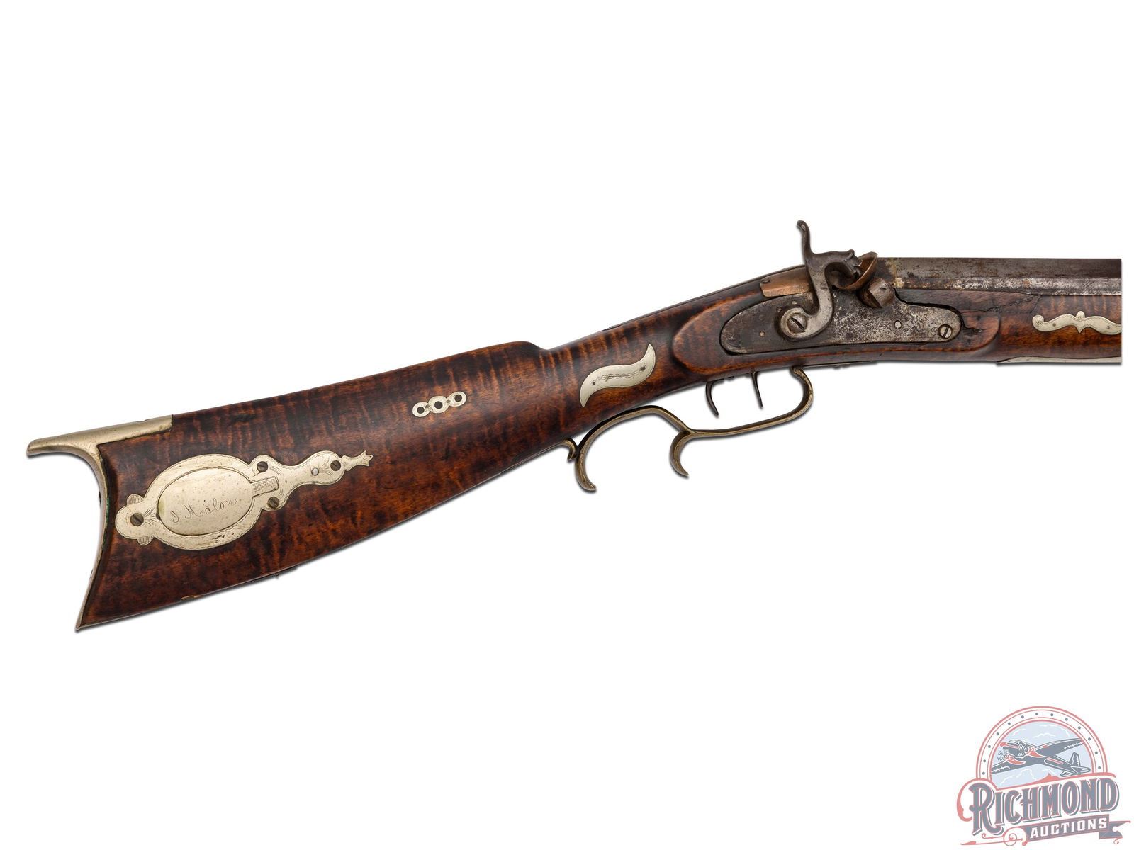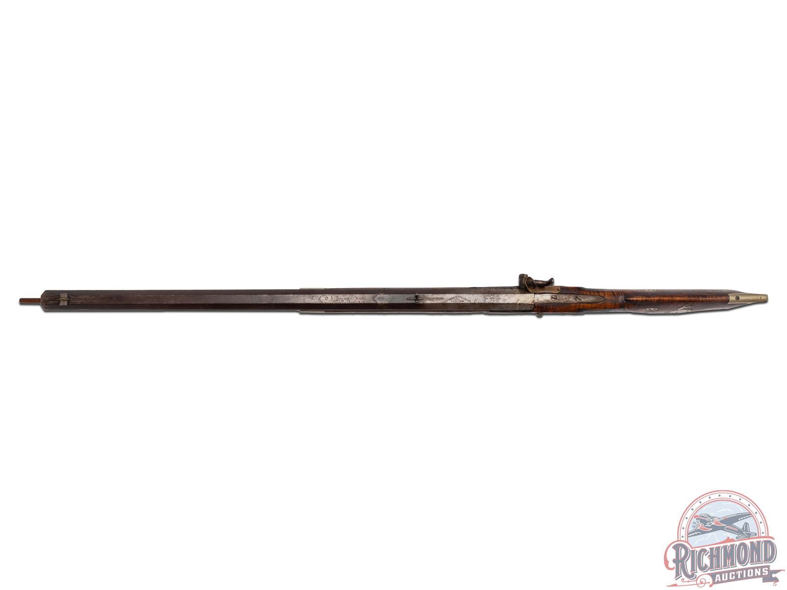 Made by Ezra D. Benson, who worked in Farmington, West Virginia, circa 1860. Rifle has several other marks on rifle that are probable owners. "J.Malone" which is in script in patchbox lid and on a morning glory inlay on left stock side. Barrel has "O.J. Stump", which appears to be a later addition. Being the configuration of this gun, it is believed these men were probably former local shooters at the area "BEEF" Shoots and were probable owners. Rifle measures 47-1/2" overall, weighing a hefty 17-3/4 lbs. Rifle has a massive 31-1/2" octagon 45 caliber rifled barrel, measuring 1-1/4" from barrel flat to barrel flat. Barrel is signed by Benson in his usual three name stamping pyramid with a gold barrel ring at breech. Barrel has a Rocky Mountain front sight and adjustable rear notch sight. Barrel has some squiggle engraving and a 5 pointed star. Commercial percussion lock with flash protector and double set trigger control. Curly maple half-stock with a bit of a fish belly possibly for shooting off a sandbag off a bench. Stock has 15 silver inlays with a brass trigger guard, German silver butt plate, ferrels, and nose cap. Silver oval patchbox, toeplate, and saddle plate, all floral engraved. Comes with hardwood ramrod and document of its presence in a Moundsville, West Virginia collection. CALIBER: 45. FFL STATUS: Antique.