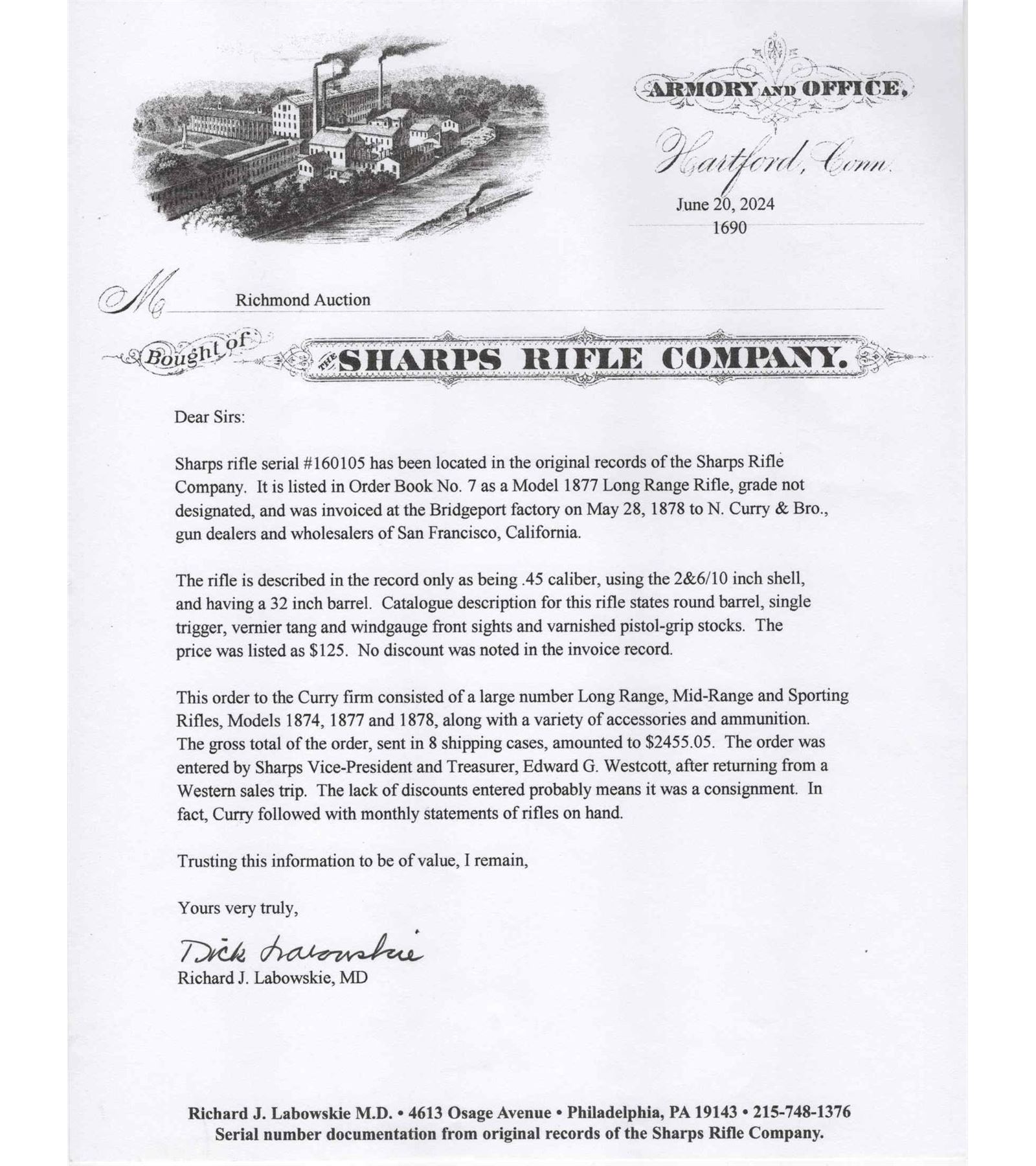 Scarce rifle made by the Sharps Rifle Company of Bridgeport, Connecticut, often referred to as "The English Model". Designed with the help of Charles Overbaugh, one of approximately 10 shipped to N. Curry and Brothers of San Francisco, CA in 1878. This rifle is listed on page 216 of "Sharps Firearms - Model 1874, 1875 & 1877 Target Rifles and Model Variations" by Roy Marcot, Ron Paxton and Edward Marron Jr. as one of the transitioned rifles. These rifles are part of a large order completed by Sharp's Vice President and Treasurer Edward G. Westcott. Features a blued 32" round tapered barrel in 45 2-6/10 caliber. Blanks for these barrels came from England from Triplett and Scott according to The Sharps Firearms book mentioned above. Barrel has Spirit level Globe front sights with no rear sight and tang fitted with a long range Vernier sight not numbered to the gun with staff measuring 6" from top to pivot point. Barrel is marked with "Old Reliable", Bridgeport address. Barrel has "Rigby Flat" at breech. Case-hardened modified and shaped 1874 action with Sharps "1869" patent marked on the left. With locks removed, milled out surfaces are visible and when lever is open, a round milled hole is visible in breechblock (all done to streamline action). Controlled by serrated plain single trigger. Fitted with Italian figured checkered pistol grip stock with unusual hard rubber butt plate. Matching walnut checkered Schnabel forearm with serial number stamped in barrel channel. Experts feel this stock is period correct but not of Sharp's origin. The firm of Curry was well capable of upgrading and possibly did on this rifle. Comes with Sharps factory letter. Jack T. Livengood Collection. CALIBER: 45 2-6/10. S/N: 106, 105. FFL STATUS: Antique.