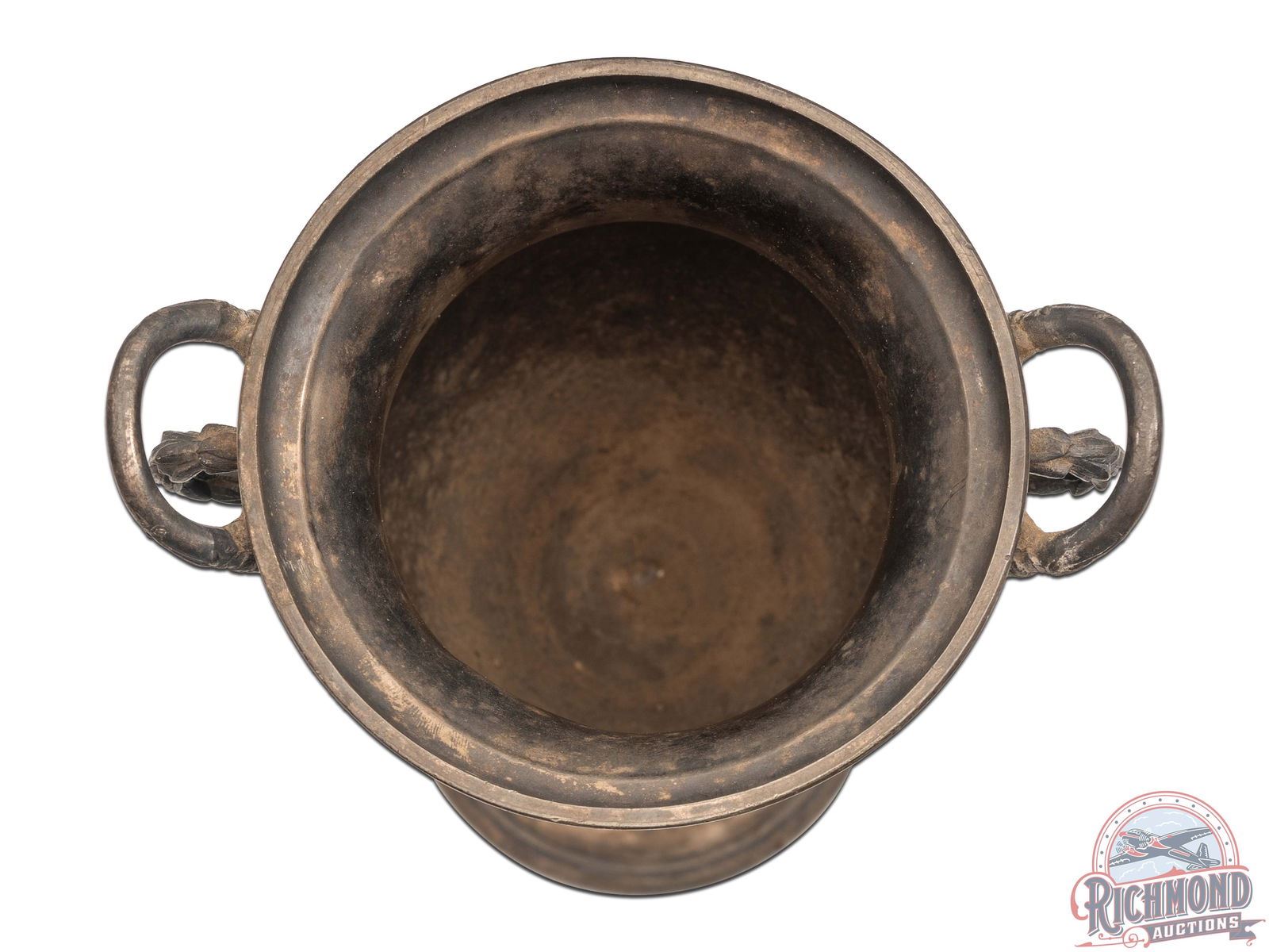 Silver shooting trophy measuring 14" by 6" with crossed Sharps rifles and engraved shooting scene. No match or presentation marks. Ornately done with the number "386" stamped on the bottom and a "crown over VA" silversmith mark.