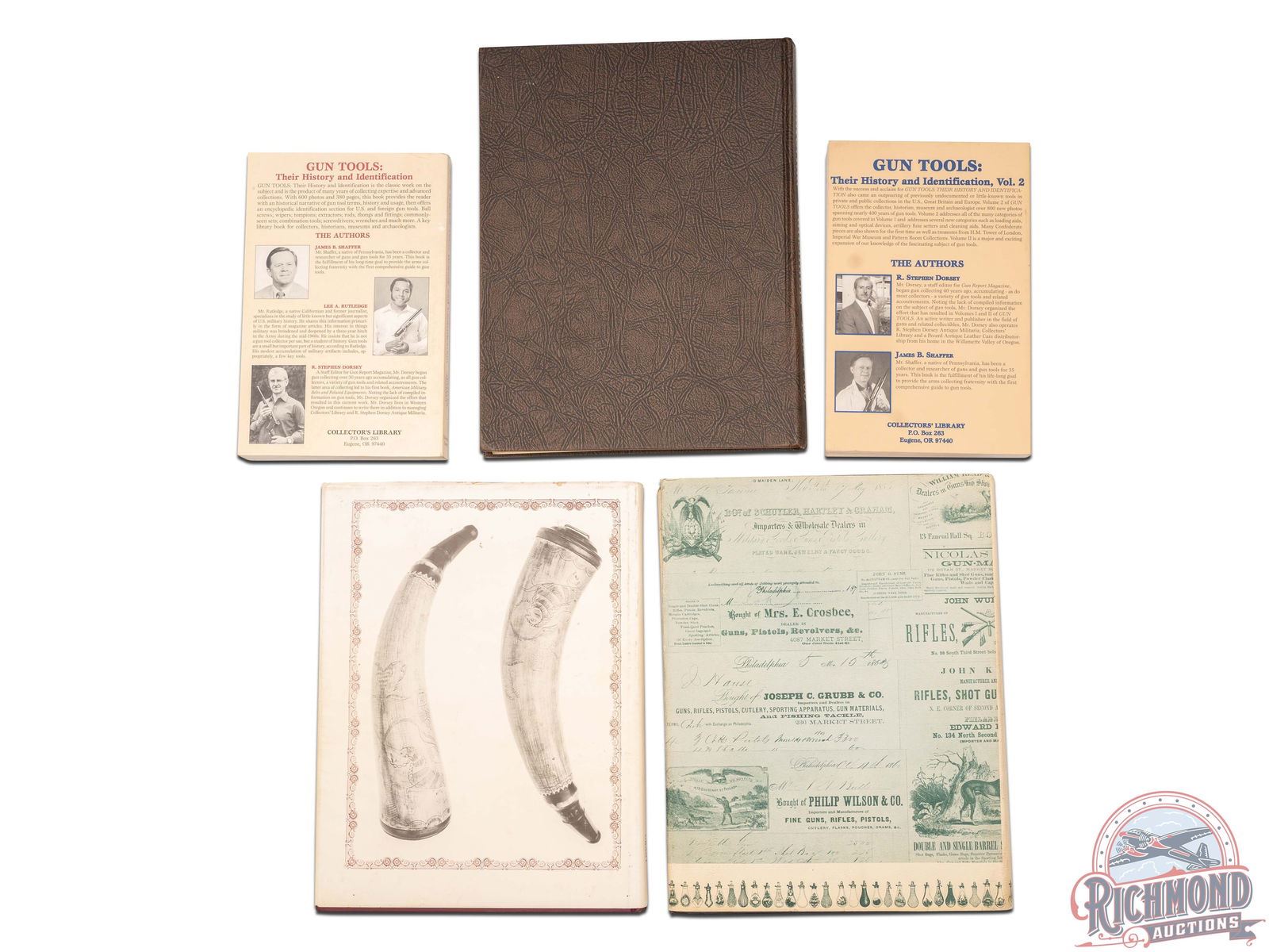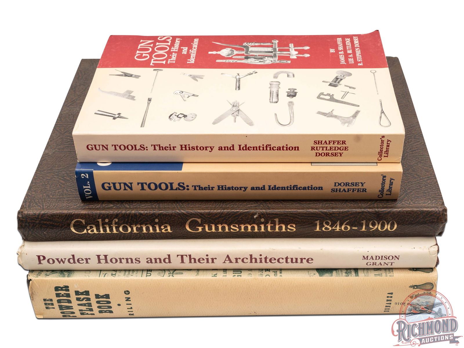 This lot includes the following books: Gun Tools Their History and Identification by James B. Shaffer, Lee A. Rutledge, R. Stephen Dorsey in paperback. Gun Tools Their History and Identification Volume 2 by R. Stephen Dorsey and James B. Shaffer in paperback. Powder Horns and Their Architecture by Madison Grant, hardback. The Powder Flask Book by Ray Riling, hardback. California Gunsmiths 1846-1900 by Lawrence P. Shelton, hardback.