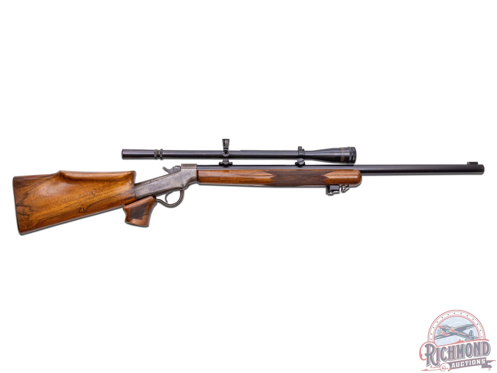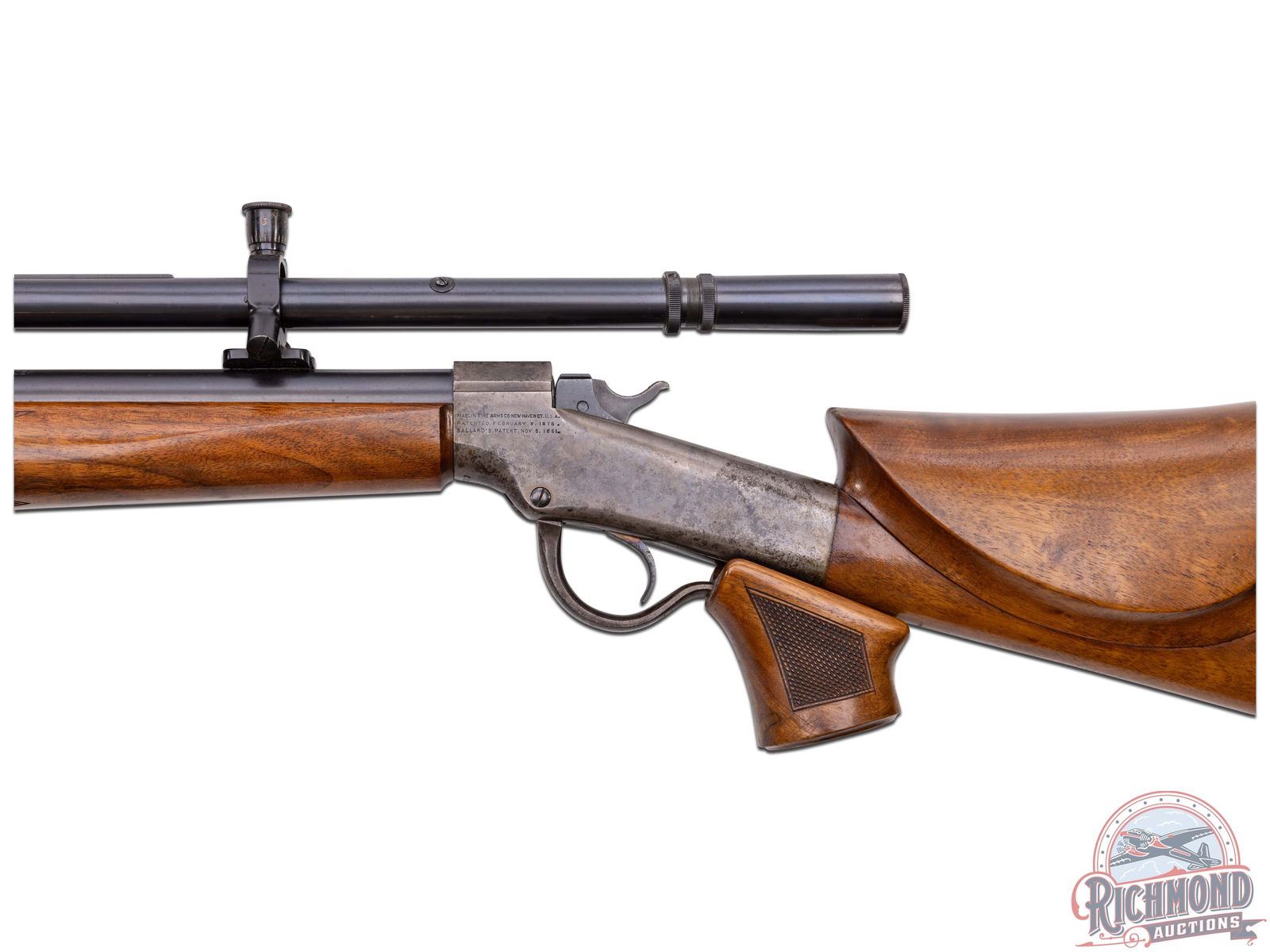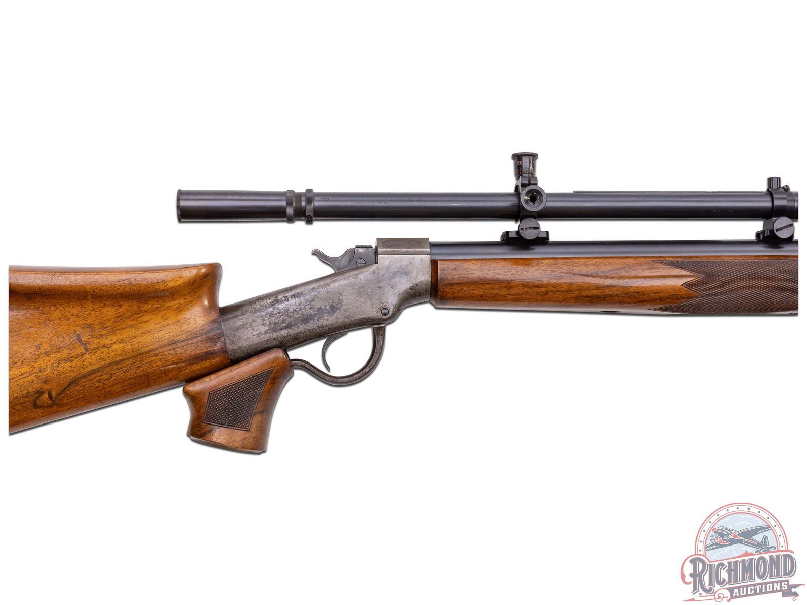 Made originally by J.M. Marlin Company, circa 1880. Rifle was customized and re-barreled by Arthur Hubalek, who worked circa 1930 in Brooklyn, New York. Hubalek was a Master Gunsmith known for his excellent shooting rimfire rifles. This rifle has a 29" blued target weight round barrel with Posa front sight base and Posa scope bases fitted Lyman 10x Super Target Spot with original caps. Barrel is marked "A. Hubalek/Special". Case-hardened Union Hill Ballard action with plain re-worked single trigger and checkered wood tipped opening lever. Custom walnut stock with over-the-comb rollover cheekpiece fitted with checkered steel marksman style butt plate. Walnut checkered marksman style swelled beavertail forearm with adjustable hand position sling mounts. J.T. Livengood Collection. CALIBER: 22 Rimfire. S/N: 29723. FFL STATUS: Antique.