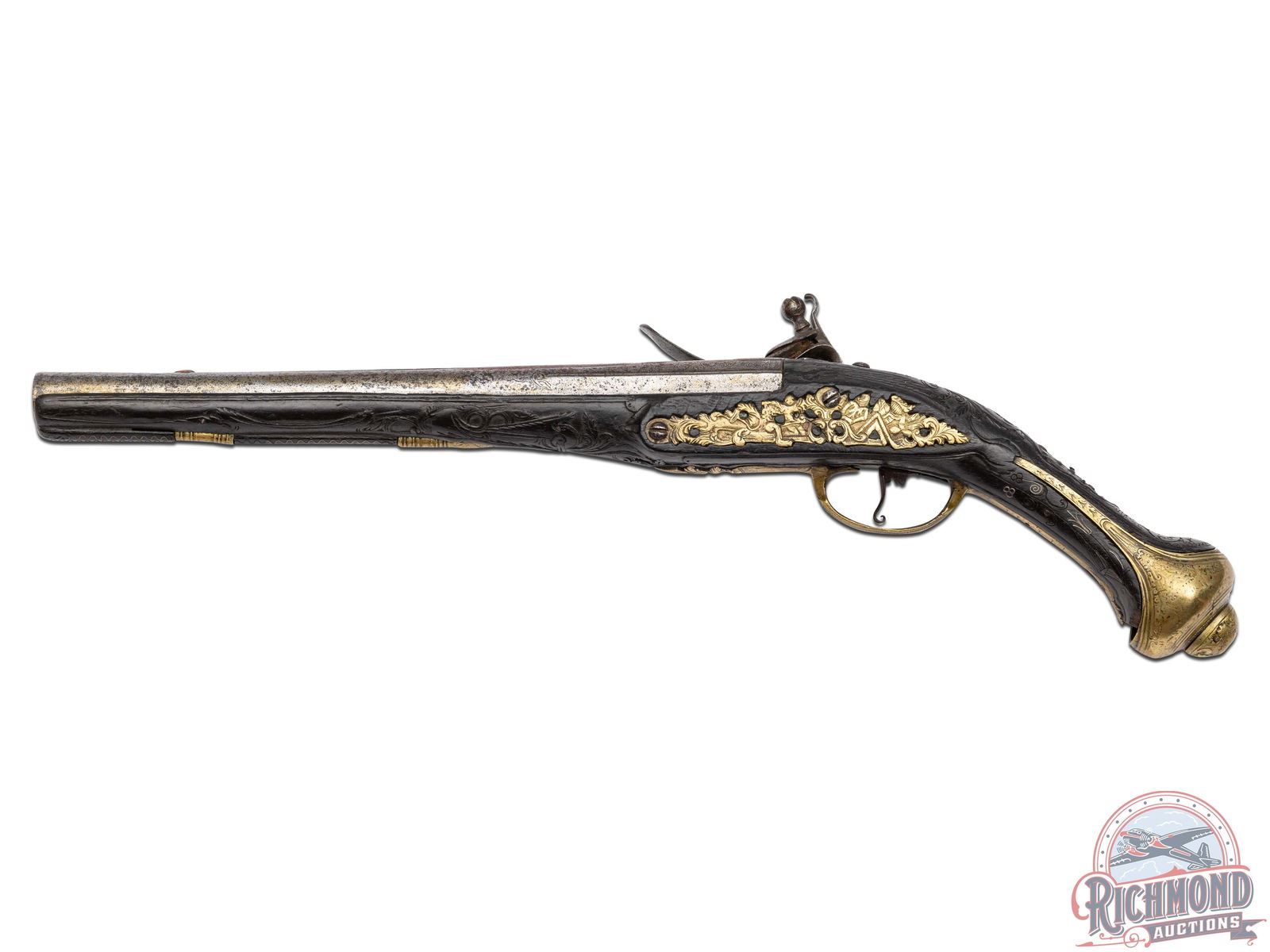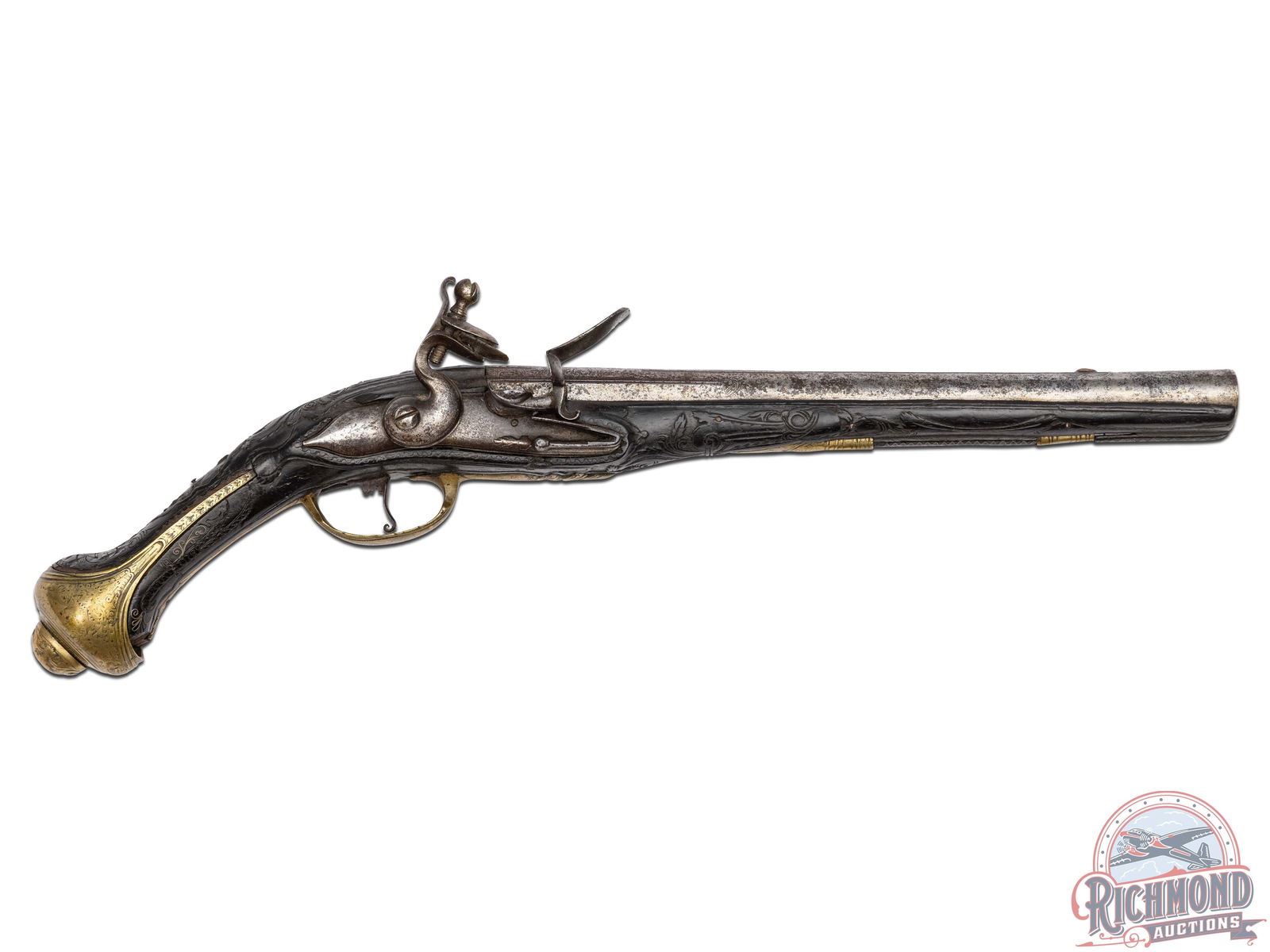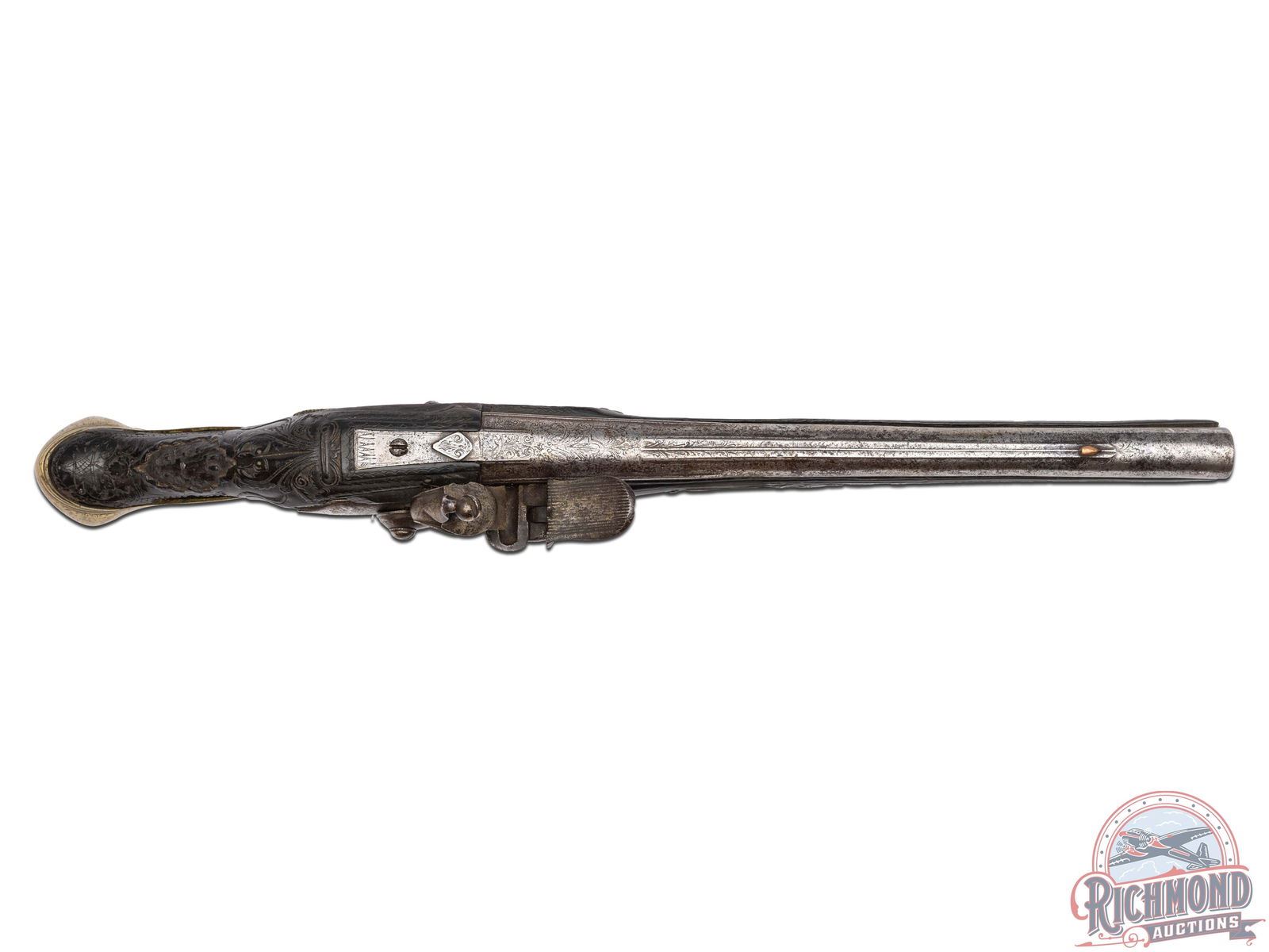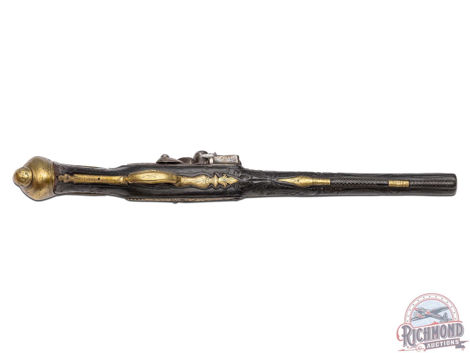 Made in areas under control of the Ottoman Empire circa 1750 and heavily influenced by pistols built on the European Continent, especially France. Gun measures 19" overall with a 11-1/2" steel faceted then turning to round barrel with flared muzzle in .67 smoothbore caliber. Barrel is heavily embellished with floral and line engraving with a flat sighting plane and copper blade front sight. Early "Banana" style flint lock with no markings held in place with raised floral pattern gilded sideplate with 9 piercings and controlled by pierced turned tail trigger. Dark ebony or mahogany wood stock ornately raised carved overall with floral patterns with some areas of silver wire work with faux non-functional ramrod. Stock has brass engraved "Skull Cracker" type buttcap with brass furniture and missing thumbpiece inlay. CALIBER: 67. FFL STATUS: Antique.