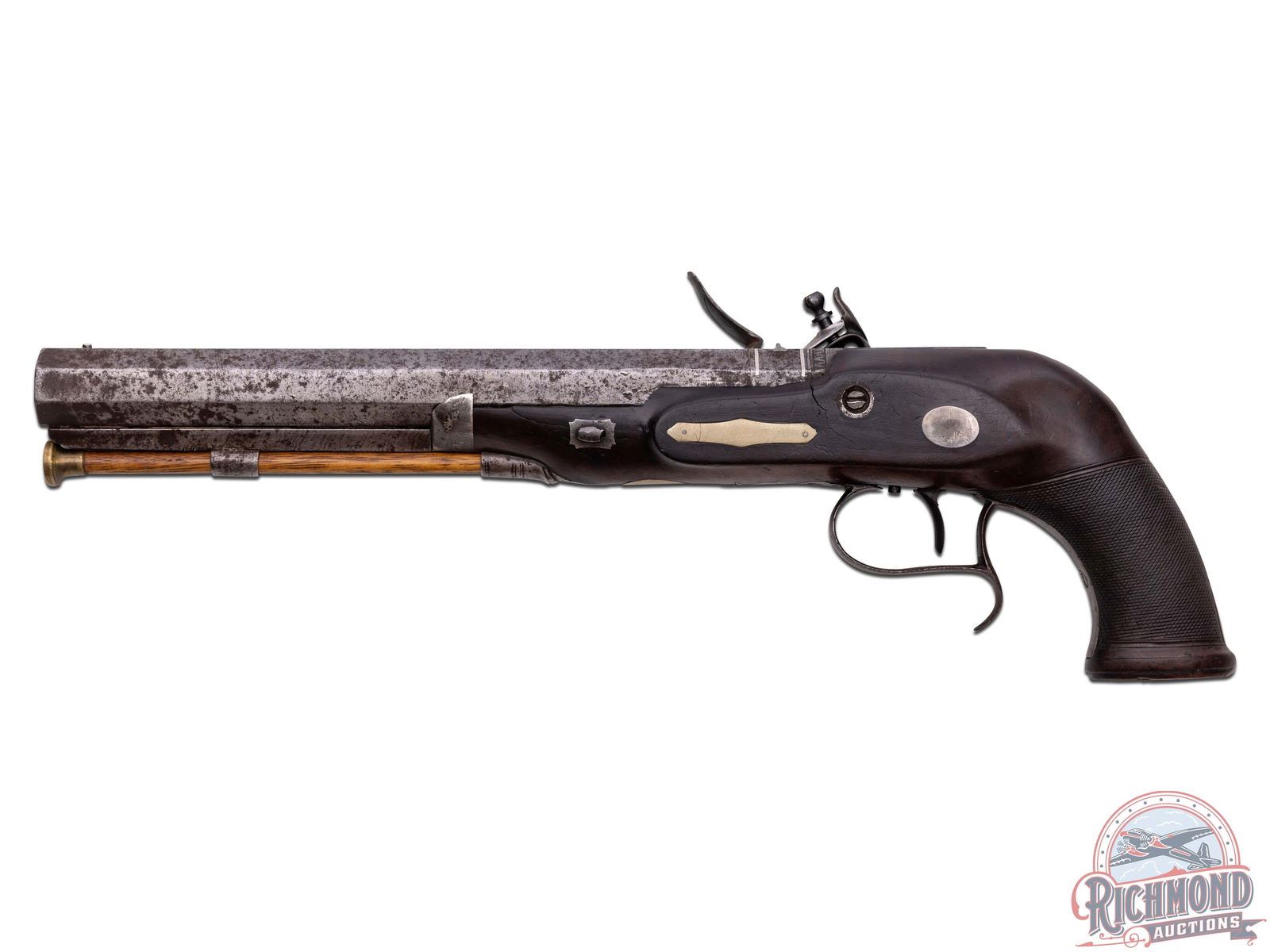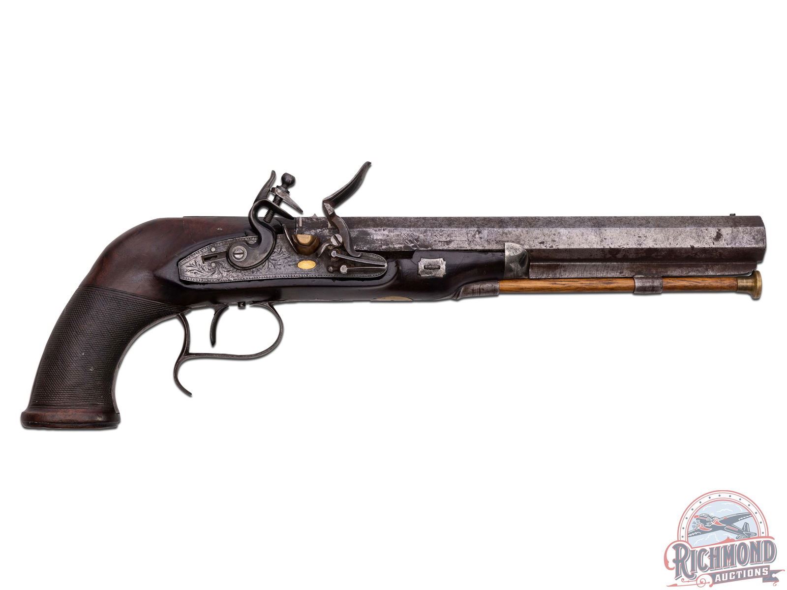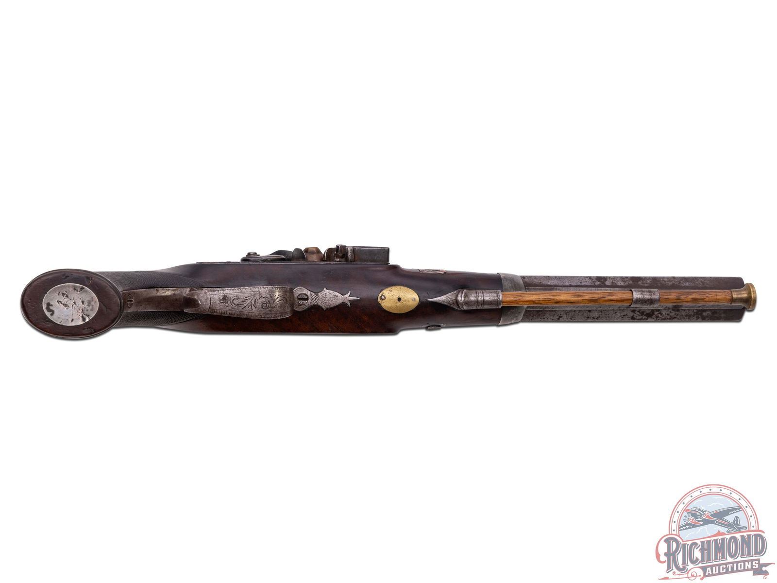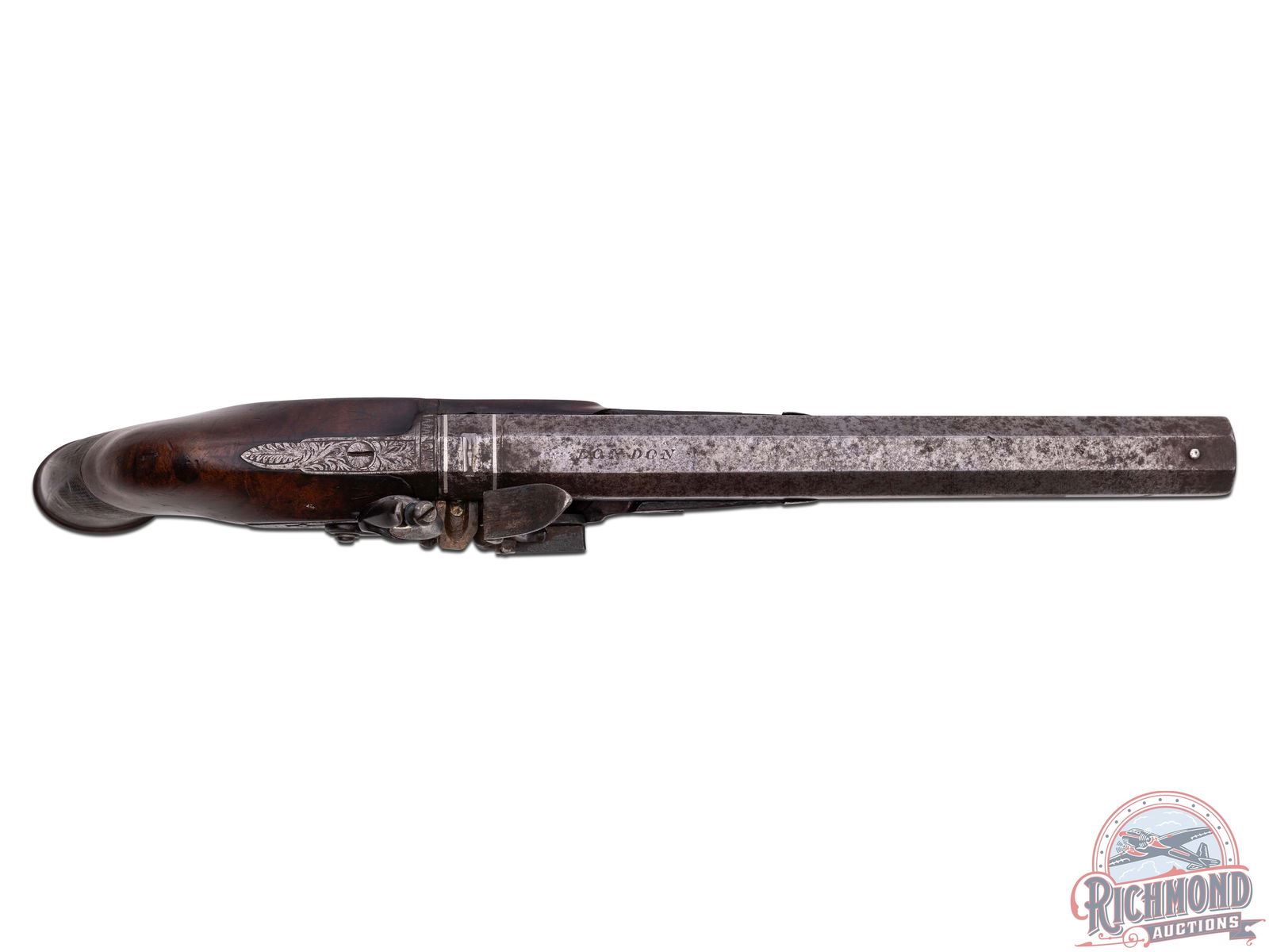 Made by William Chance of London, England circa 1820. Fitted with 10" octagon 70 caliber smoothbore barrel with bead front sight, "LONDON" barrel marking, platinum breech band, and silver notch rear sight. Single bolt flintlock with floral engraving and missing safety catch with brass pan and gold oval inlay with "CHANCE" marked on it. Lock is controlled by a single set trigger with steel finger spur engraved trigger guard. Walnut checkered grip stock similar to a "saw handle" grip with swelled rim butt with silver oval inlay on base. Stock has sterling silver oval inlay on left side with silver nosecap and silver escutcheon plates and a German silver plate in front of lock bolt. Comes with original hardwood ramrod with brass tip. CALIBER: 70. FFL STATUS: Antique.
