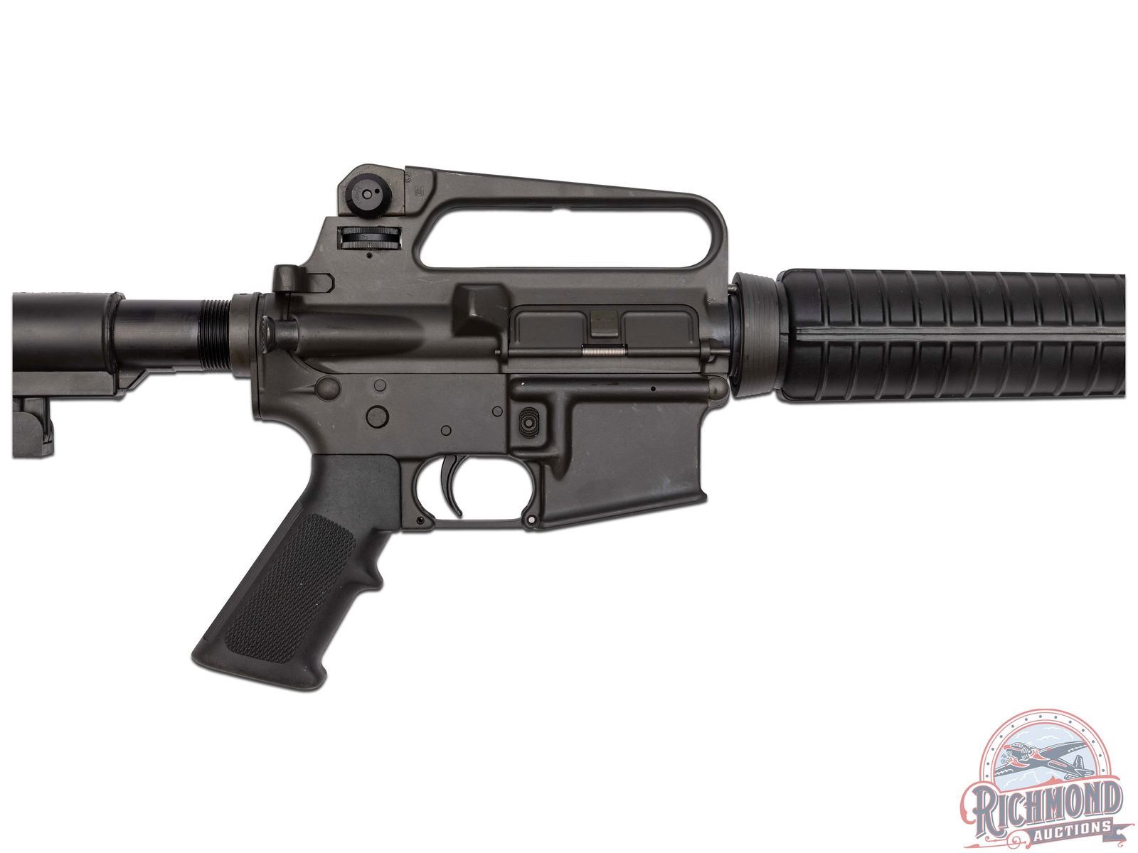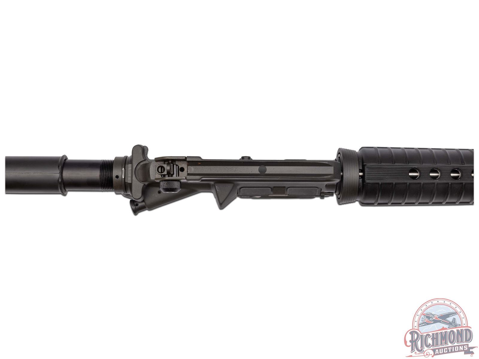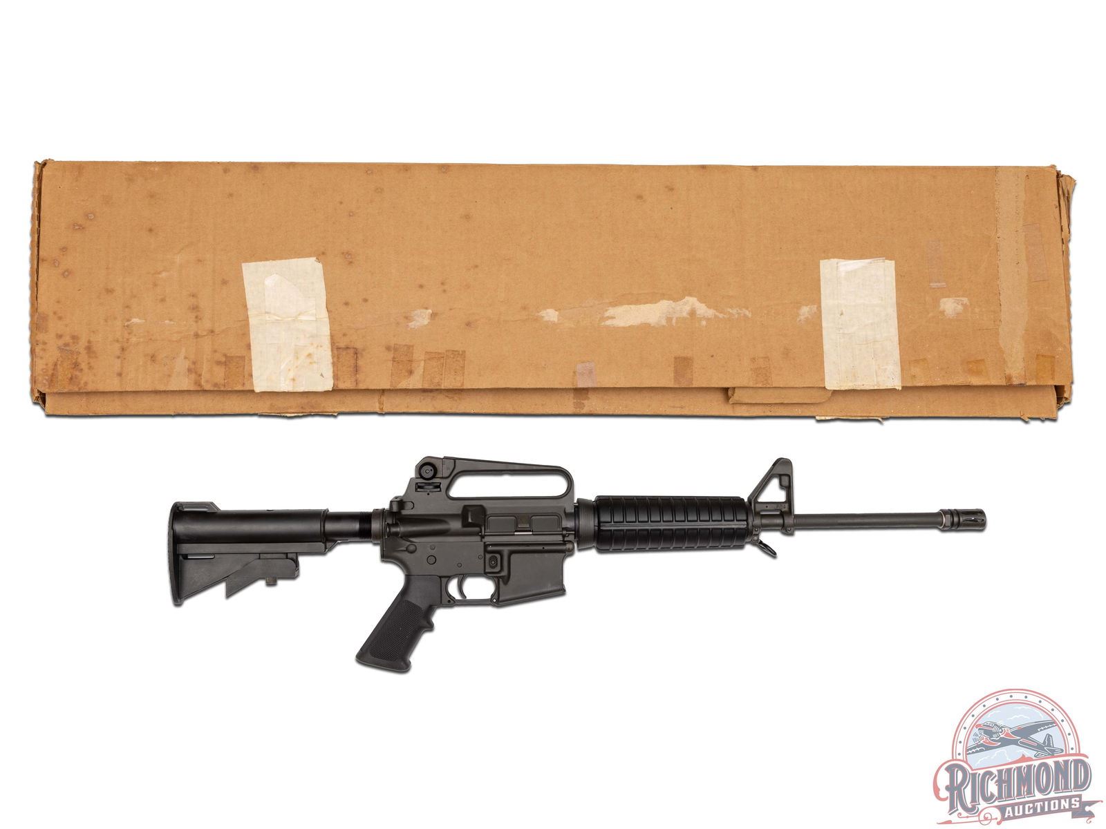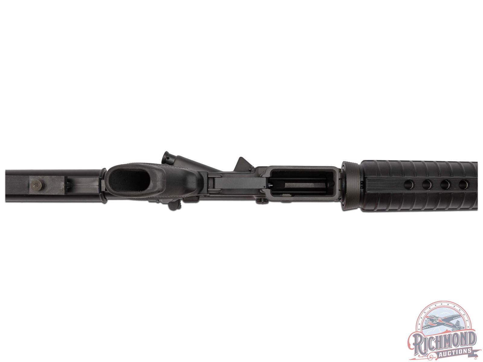 Manufactured circa 1992 previous to the ban on certain semi-auto rifles like this. Features a 16-1/2" barrel with muzzle brake. Barrel is stamped "C MP 5.56 NATO 1/7". Parkerized finish with a black 6" barrel guard. Carry handle with integrated adjustable peep sight and front post sight. Black checkered synthetic pistol grip and collapsible stock adjust from 10" to 13" LOP. Comes in the original factory box with two factory 20-round magazines, barrel brush, canvas sling, and factory manual. LOP: 10 to 13". CALIBER: 223 REM. S/N: SL012915. FFL STATUS: Modern.
