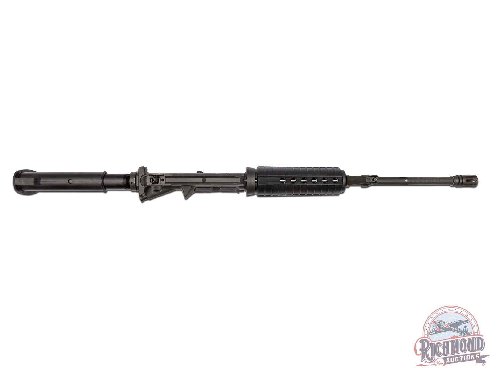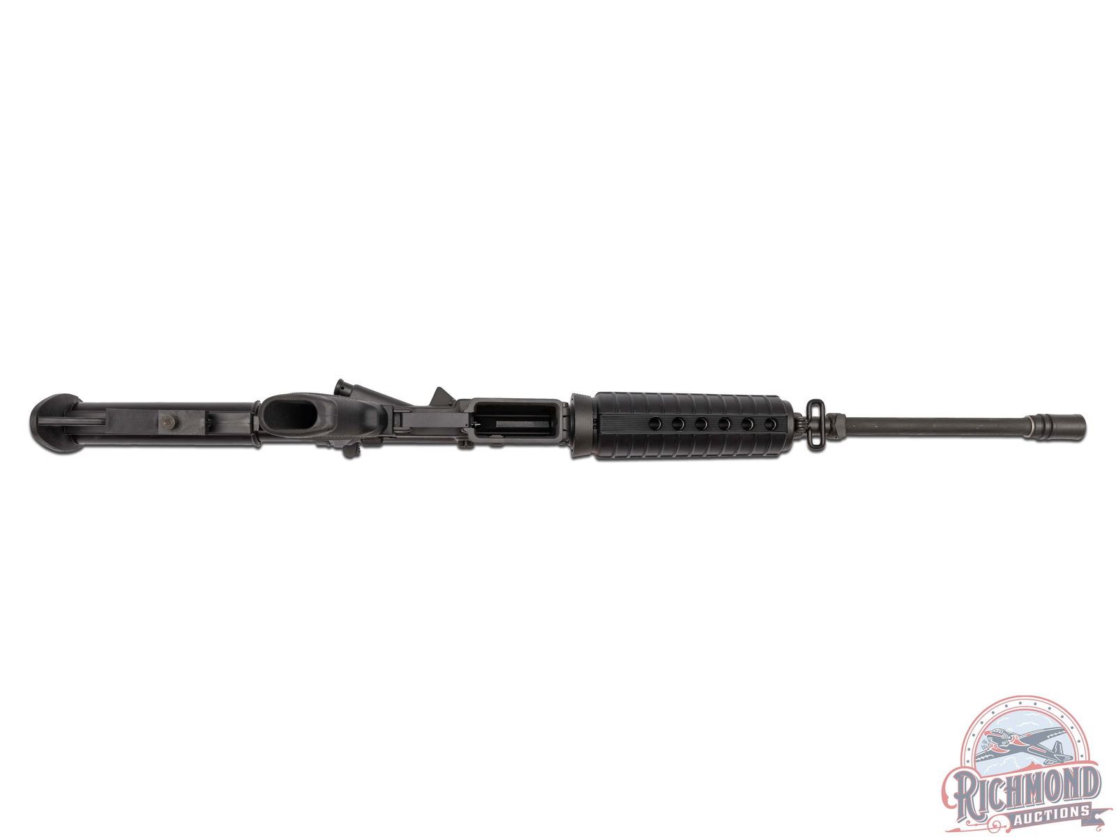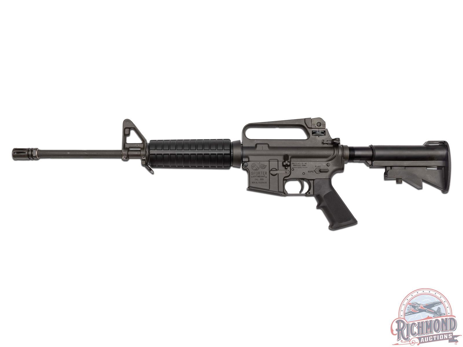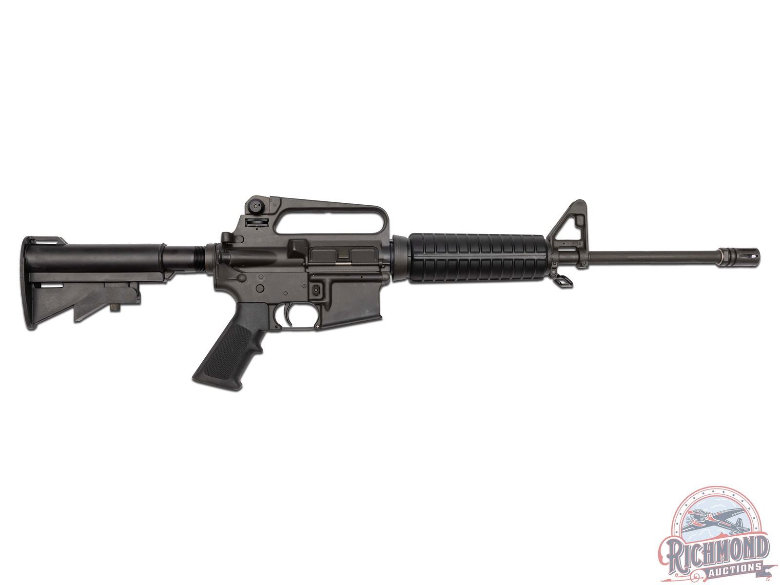 Manufactured circa 1992 previous to the ban on certain semi-auto rifles like this. Features a 16-1/2" barrel with muzzle brake. Barrel is stamped "C MP 5.56 NATO 1/7". Parkerized finish with a black 6" barrel guard. Carry handle with integrated adjustable peep sight and front post sight. Black checkered synthetic pistol grip and collapsible stock adjust from 10" to 13" LOP. Comes in the original factory box with two factory 20-round magazines, barrel brush, canvas sling, and factory manual. LOP: 10 to 13". CALIBER: 223 REM. S/N: SL012915. FFL STATUS: Modern.
