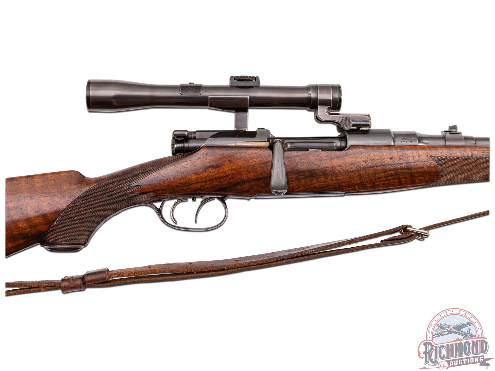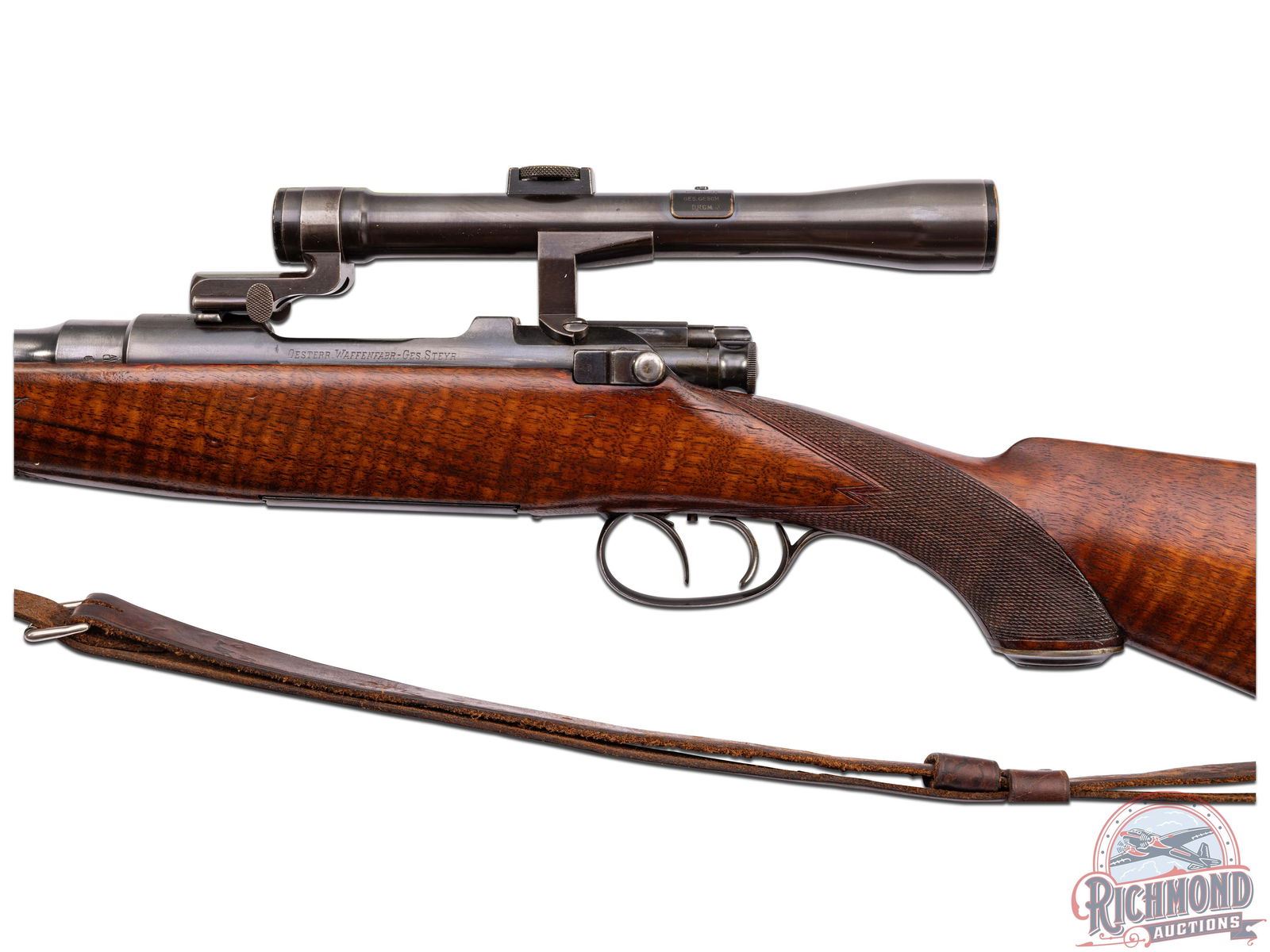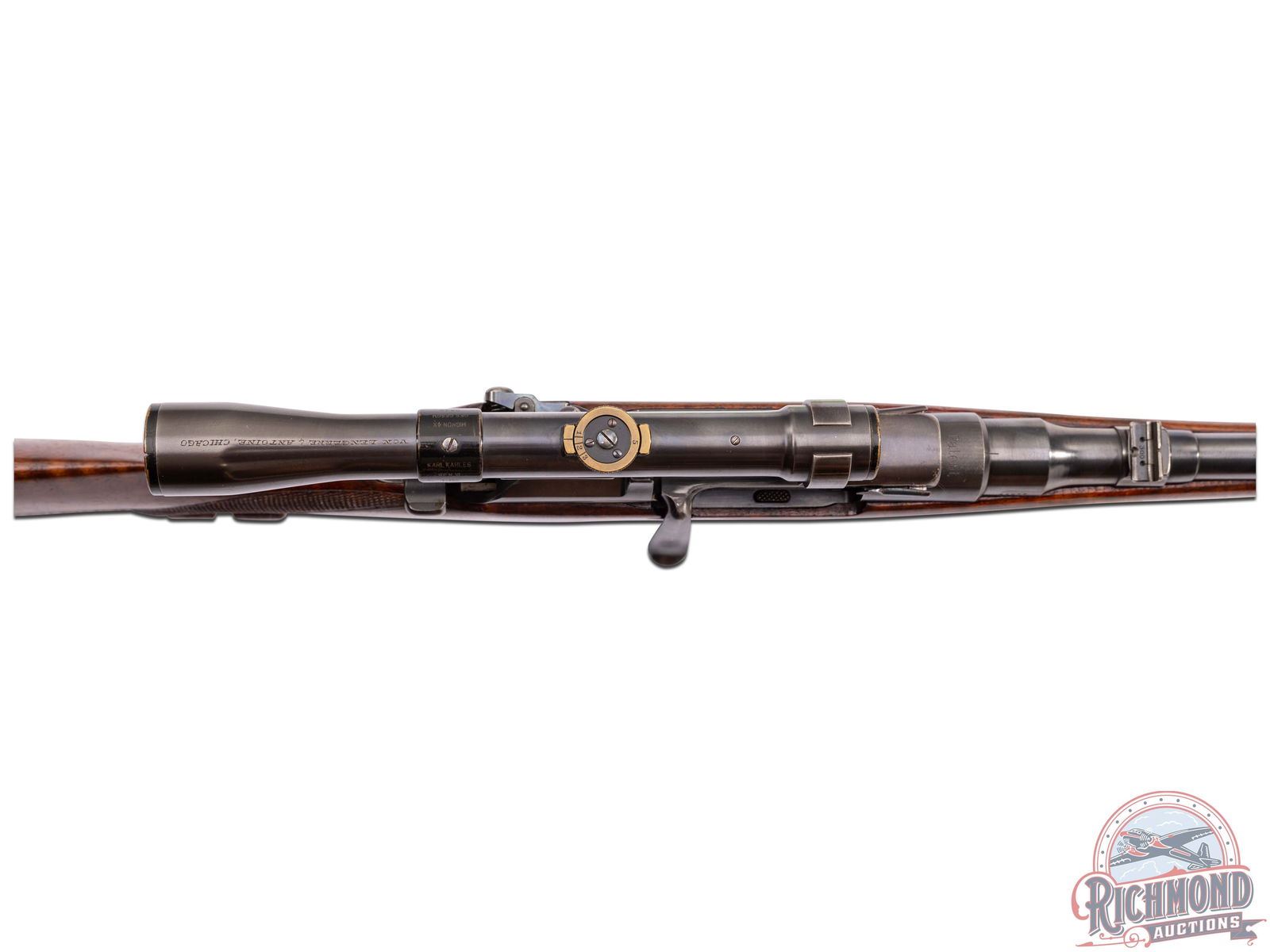 Made by Steyr in Steyr, Austria for Mannlicher Schonauer, circa 1910, and imported to the United States by Von Lengerke and Antoine, Chicago, Illinois. 18-1/2" blued round tapered barrel with ramp front sight and fixed two leaf rear sight marked with Von Lengerke logo. Blued action with spoon bolt, three position safety, rotary detachable magazine, double set triggers, and receiver marked "Patent Mannlicher Schonauer Model 1903". Action is fitted with 4x Kahles scope with Duplex reticle and marked with Van Lengerke logo. Full walnut checkered Alpine stock with blued hardware, leather sling and steel trap butt plate. J.T. Livengood Collection. CALIBER: 6.5x54 M.S. S/N: 11715. FFL STATUS: Curio & Relic.
