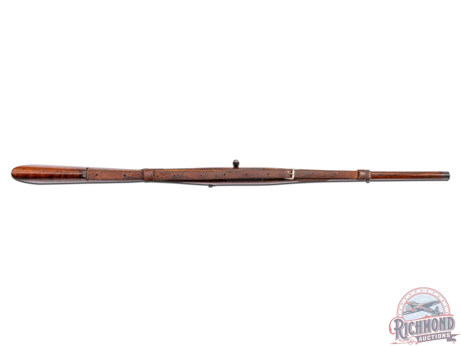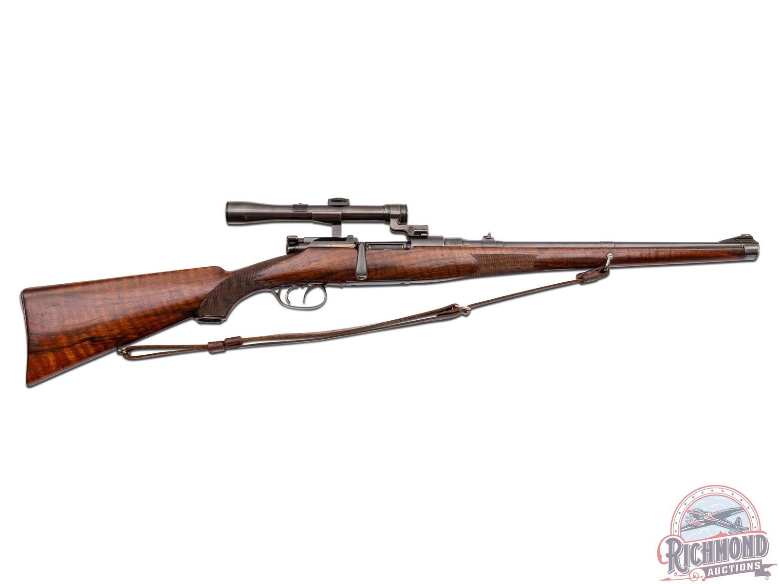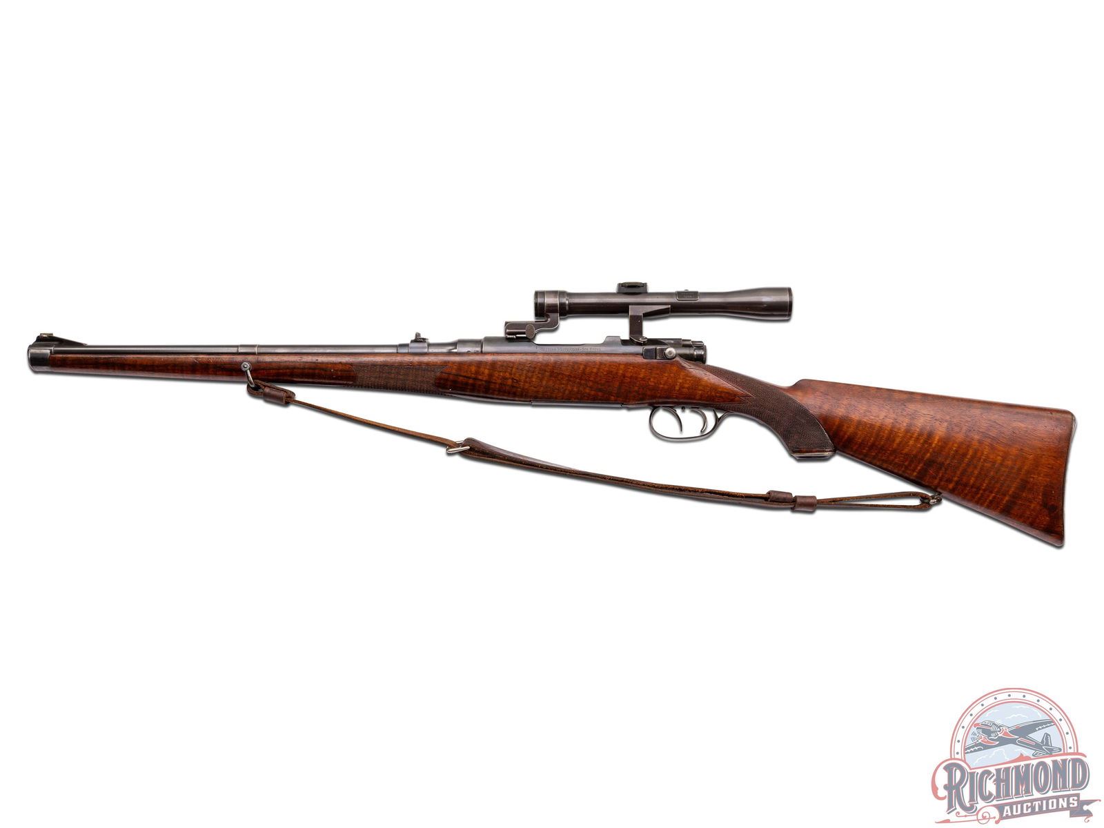 Made by Steyr in Steyr, Austria for Mannlicher Schonauer, circa 1910, and imported to the United States by Von Lengerke and Antoine, Chicago, Illinois. 18-1/2" blued round tapered barrel with ramp front sight and fixed two leaf rear sight marked with Von Lengerke logo. Blued action with spoon bolt, three position safety, rotary detachable magazine, double set triggers, and receiver marked "Patent Mannlicher Schonauer Model 1903". Action is fitted with 4x Kahles scope with Duplex reticle and marked with Van Lengerke logo. Full walnut checkered Alpine stock with blued hardware, leather sling and steel trap butt plate. J.T. Livengood Collection. CALIBER: 6.5x54 M.S. S/N: 11715. FFL STATUS: Curio & Relic.