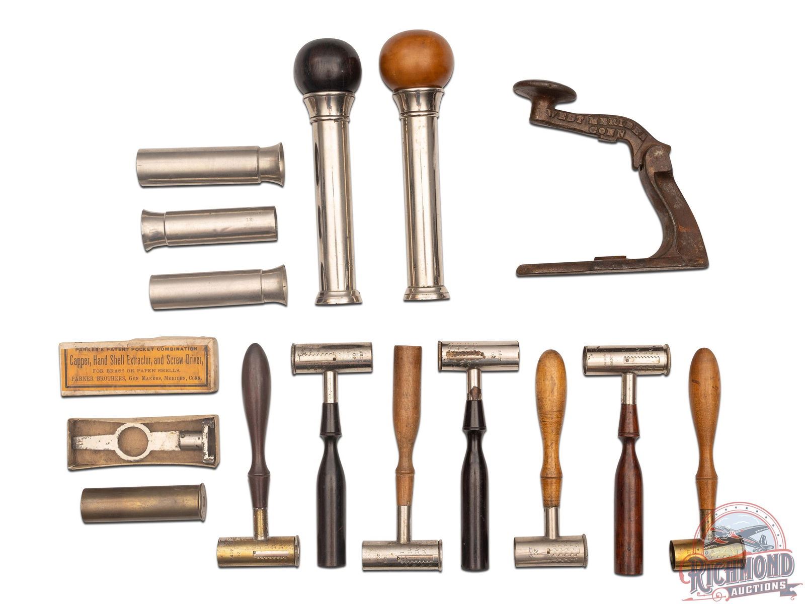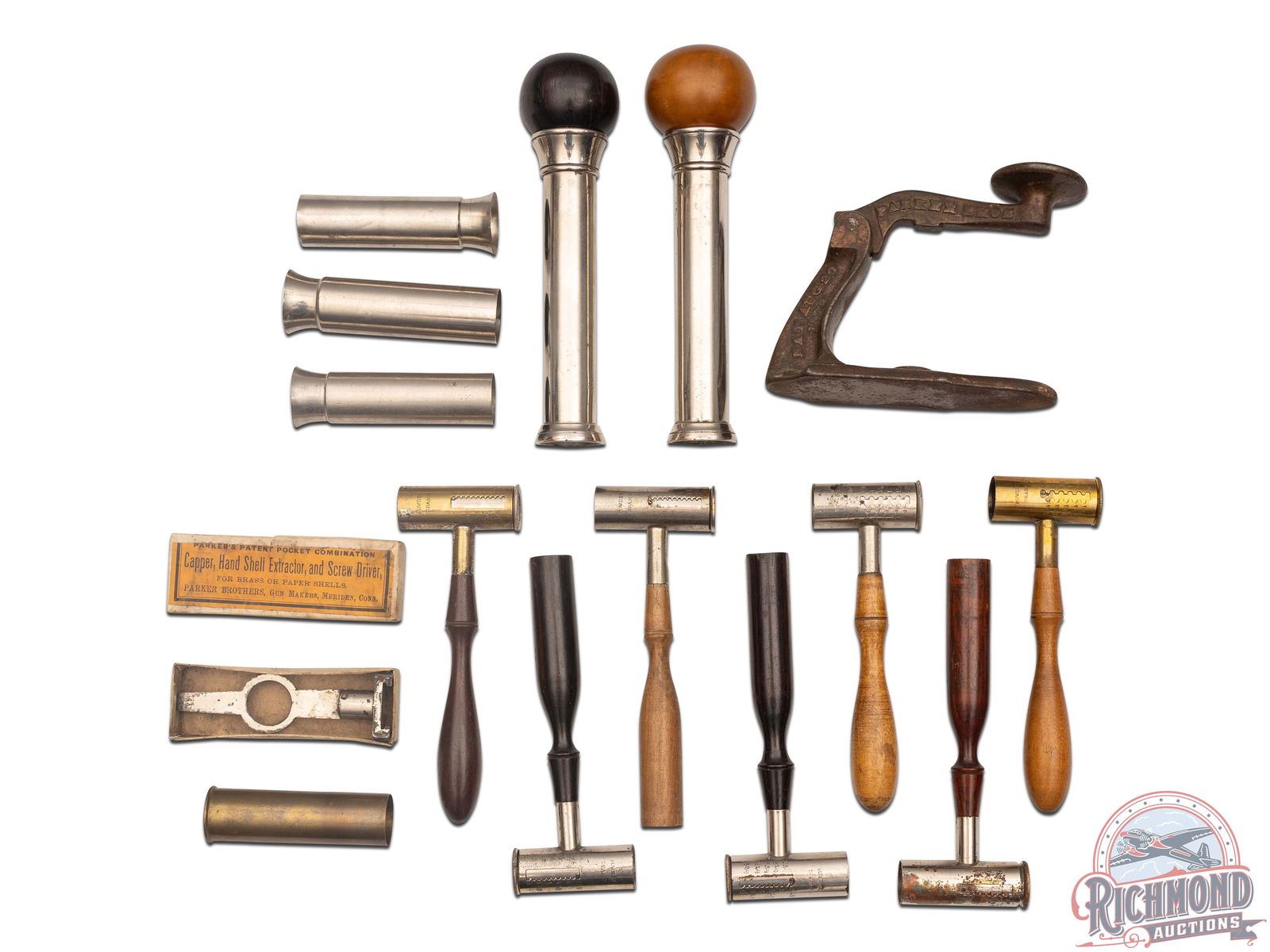 Lot consists of seven Parker Bros. marked wooden handled nickel plated shot/powder measures, two Parker Bros. nickel plated wad loaders with wooden knob plungers, three Parker Bros. 12 gauge wad and shot tubes, a unique cast Parker marked bench top priming tool, a Parker patent capper, hand shell extractor and screwdriver new in the box, and a brass 10 gauge Parker shotgun shell.