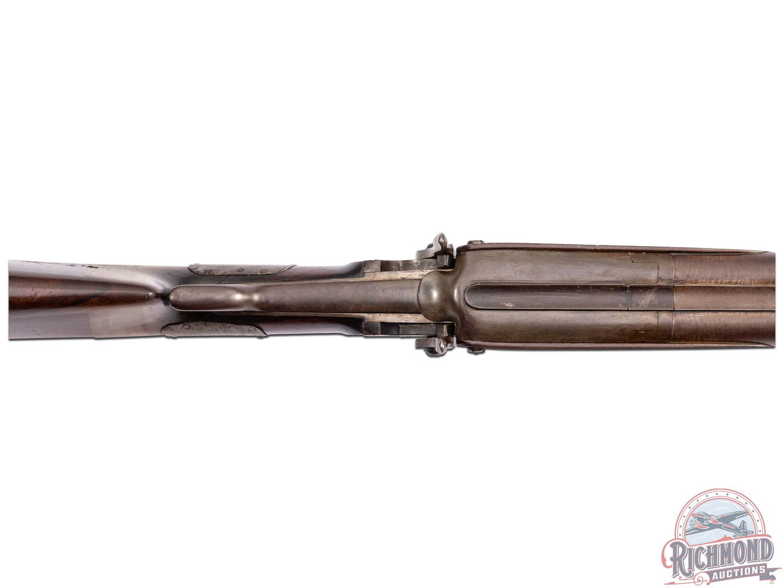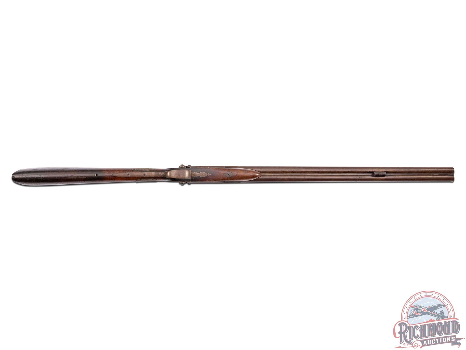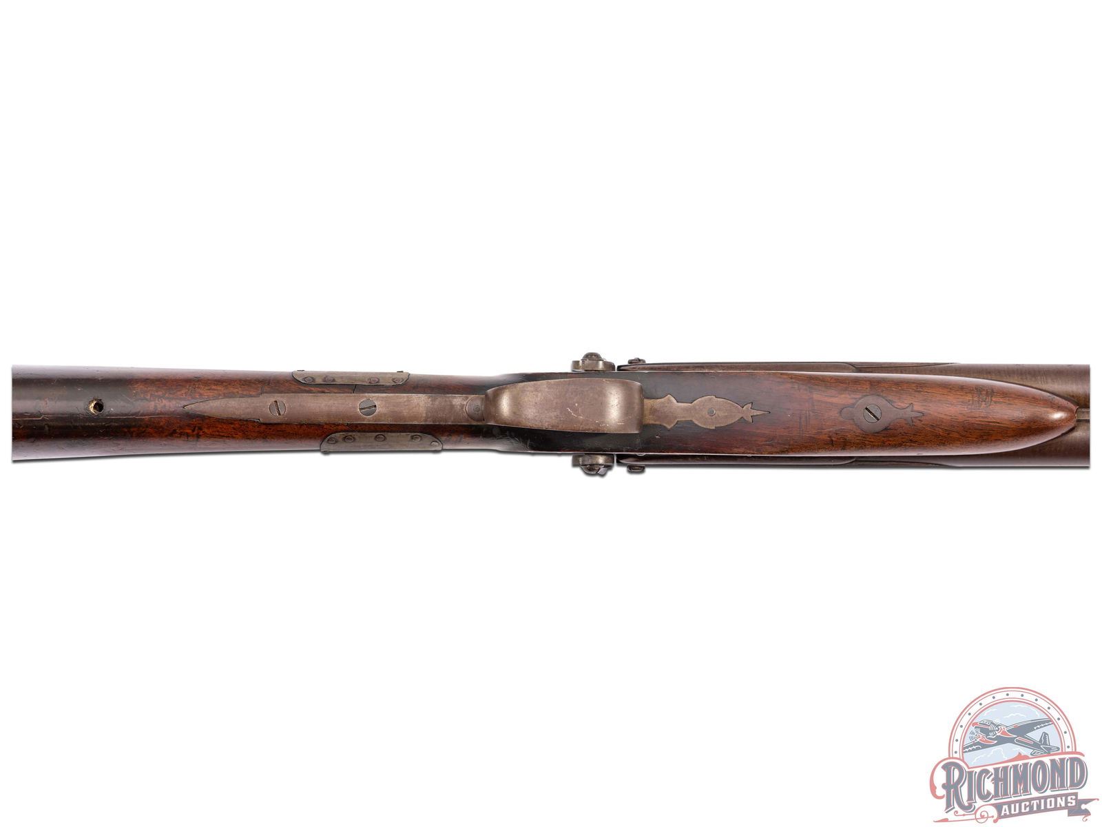 Overall fair with metal turning brown. Wood has a dark unique finish with period wrist repair. Missing wooden ramrod. Dark bores with functioning mechanics.