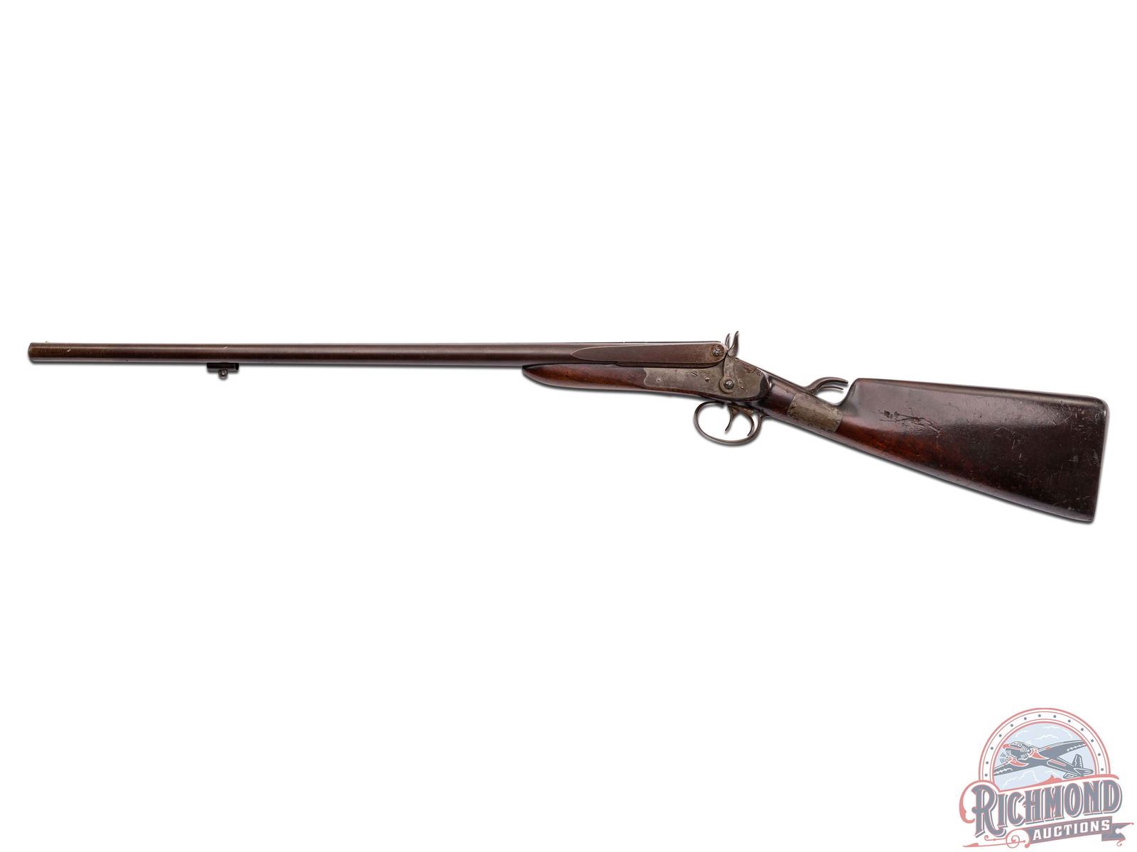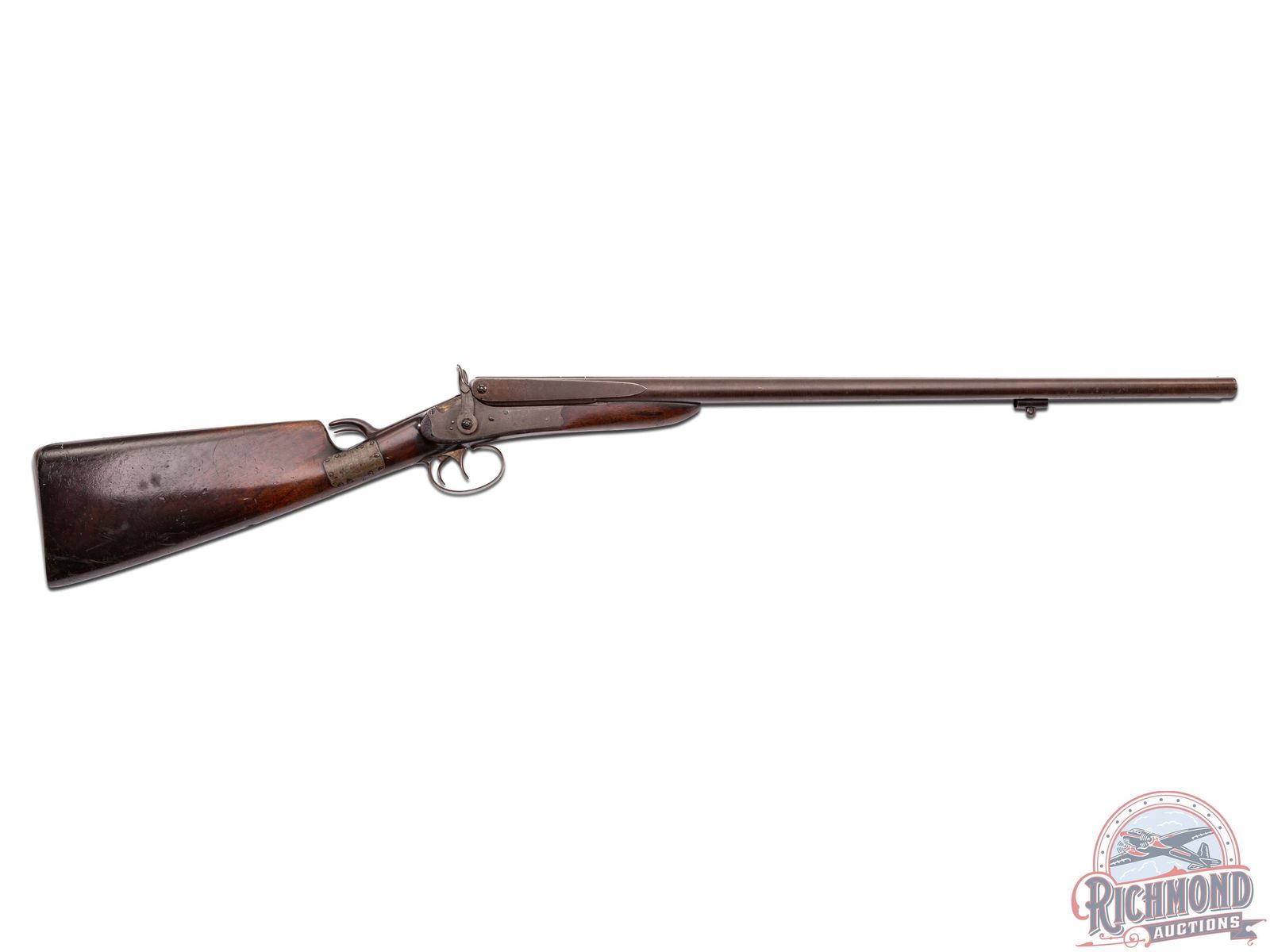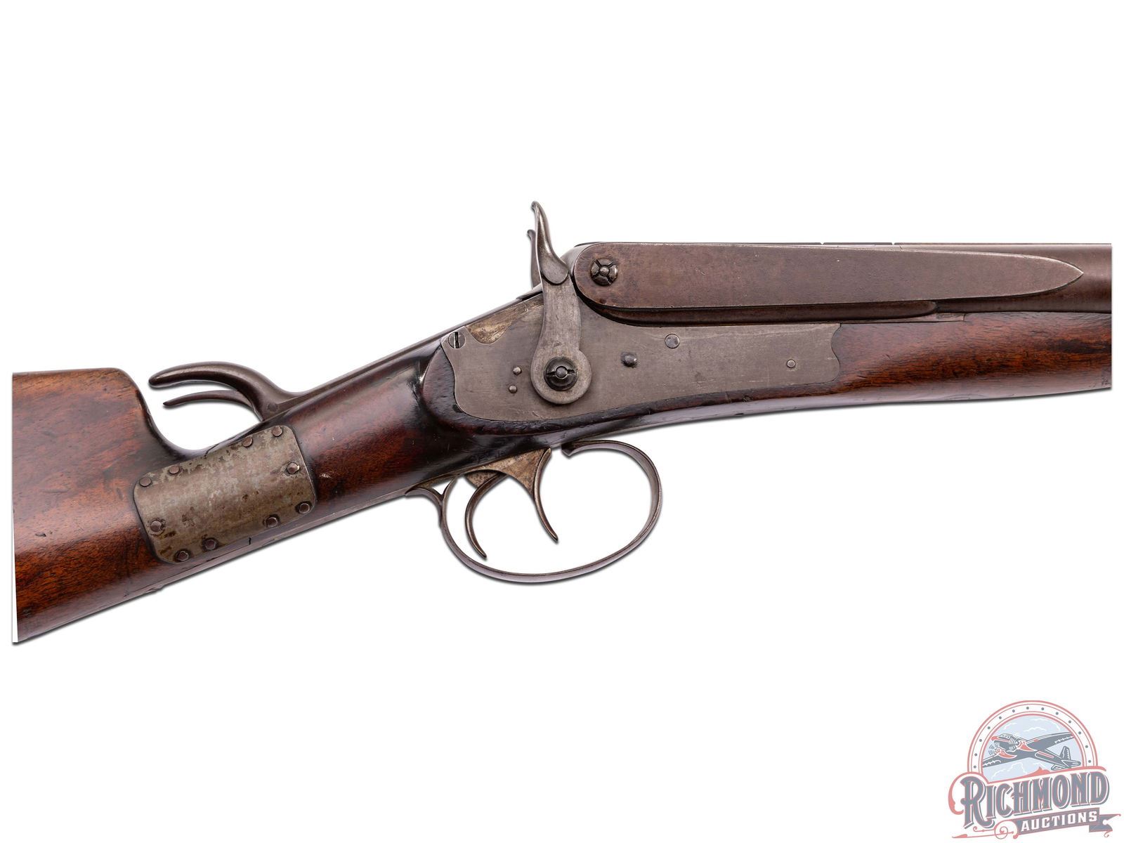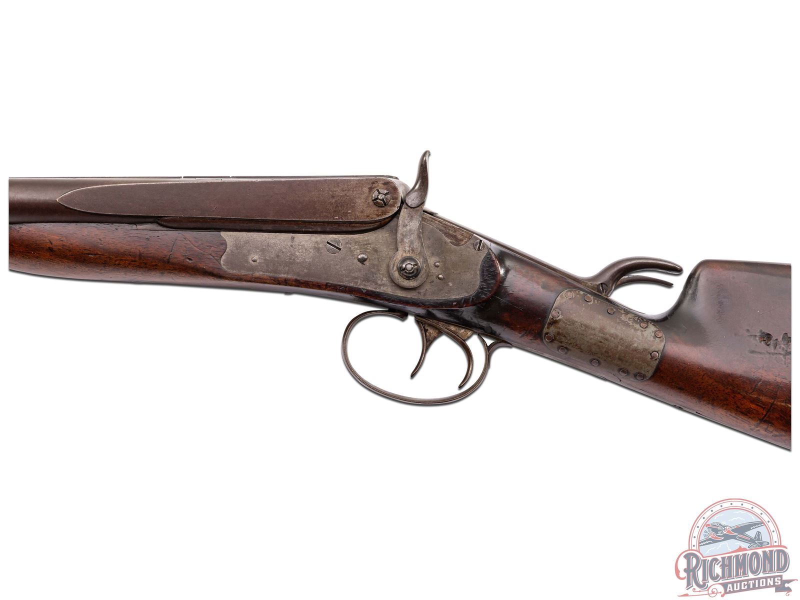 Overall fair with metal turning brown. Wood has a dark unique finish with period wrist repair. Missing wooden ramrod. Dark bores with functioning mechanics.