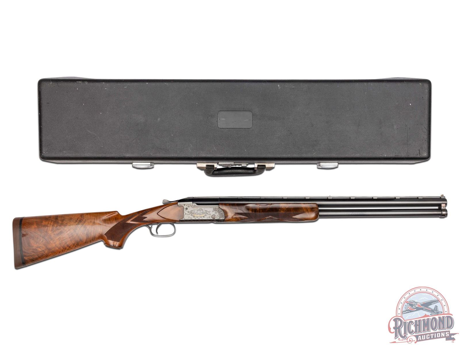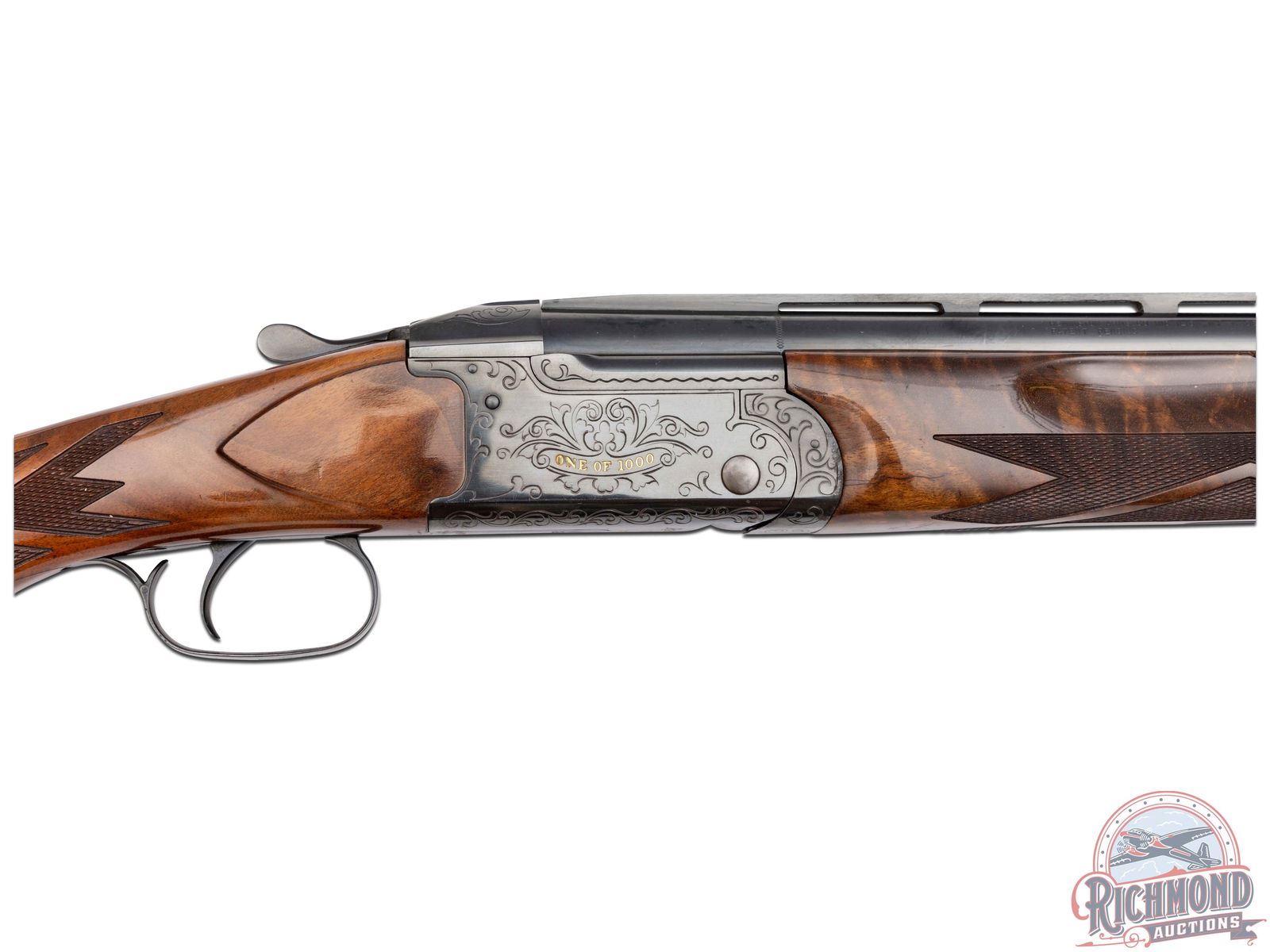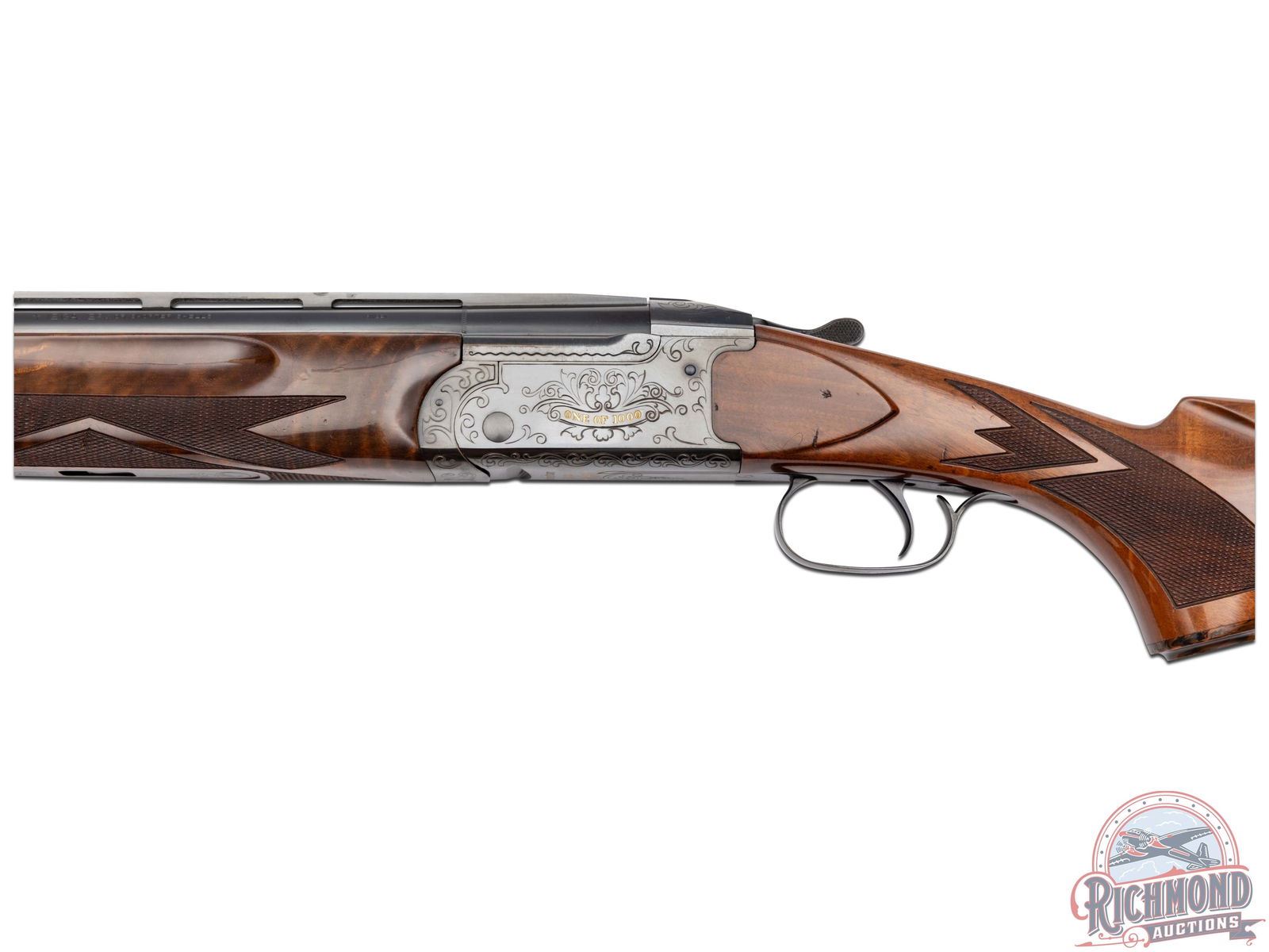 In 1974 Remington manufactured a Limited Edition of 1,000 Deluxe Skeet Grade 3200's named the "One Of 1000". Features a 26" blued ventilated rib barrel with white bead front sight, chambered for 2-3/4" shells with Skeet choke. Comes with four sets of tubes for 20, 28, and 410 gauge making it very versatile. Blued action with scroll engraving and gold lettering "ONE OF 1000" on each side panel. Bottom of the action is stamped in gold lettering "REMINGTON / 3200 / SK. 0997". Engraved scroll pattern on the bottom of the trigger guard. Single trigger with tang mounted selector switch missing (will need professionally replaced). Nicely figured walnut stock with pistol grip checkering and brass vanity plate inlaid pistol grip cap. Fitted with a factory brown rubber recoil pad. Matching skeet style forearm with checkering and scroll engraving on latch. Comes in a brown felt take-down case with factory tools. LOP: 13-3/4". DAC: 1-1/2". DAH: 2". CALIBER: MULTI GAUGE. S/N: 997. FFL STATUS: Curio & Relic.