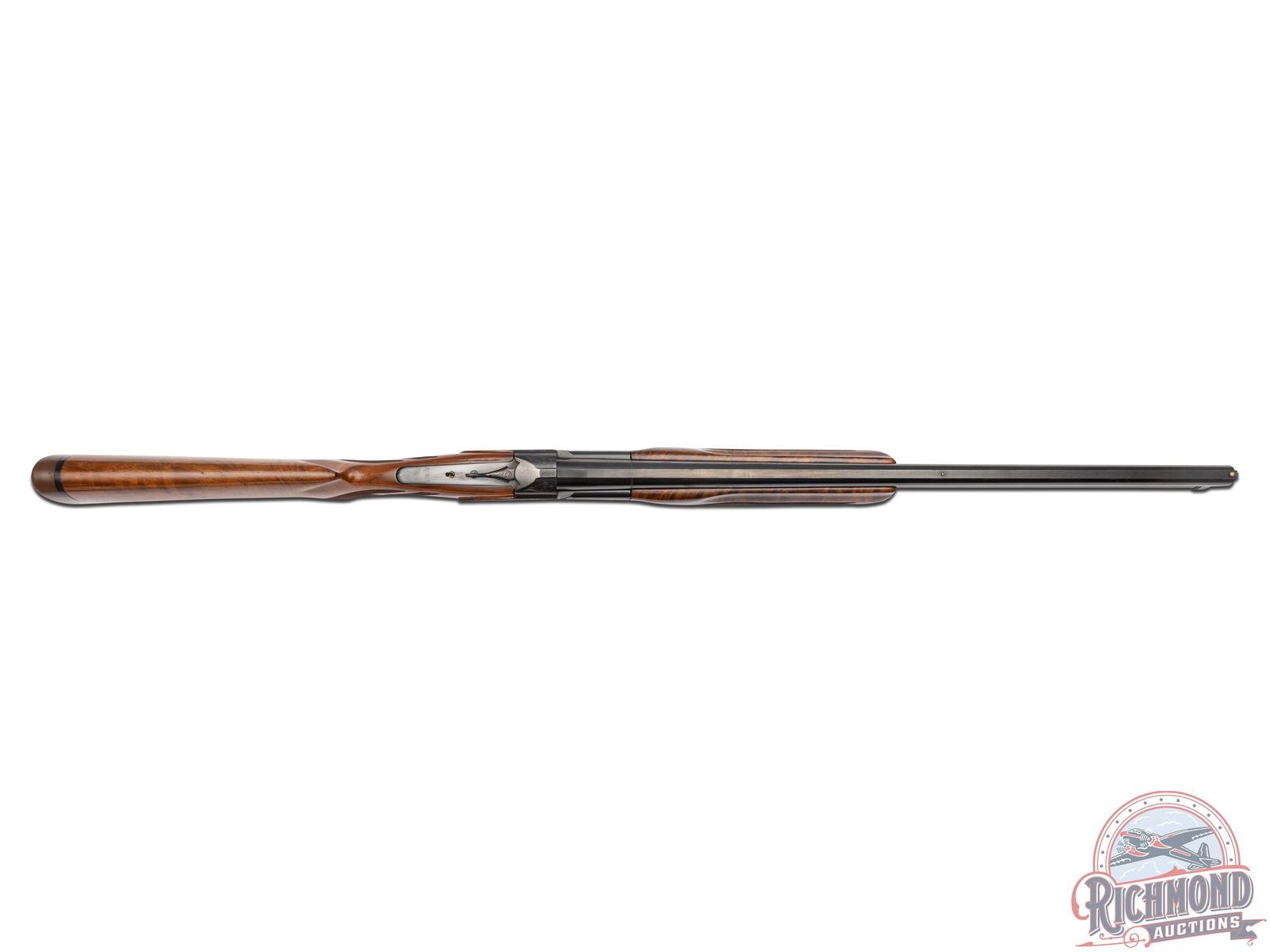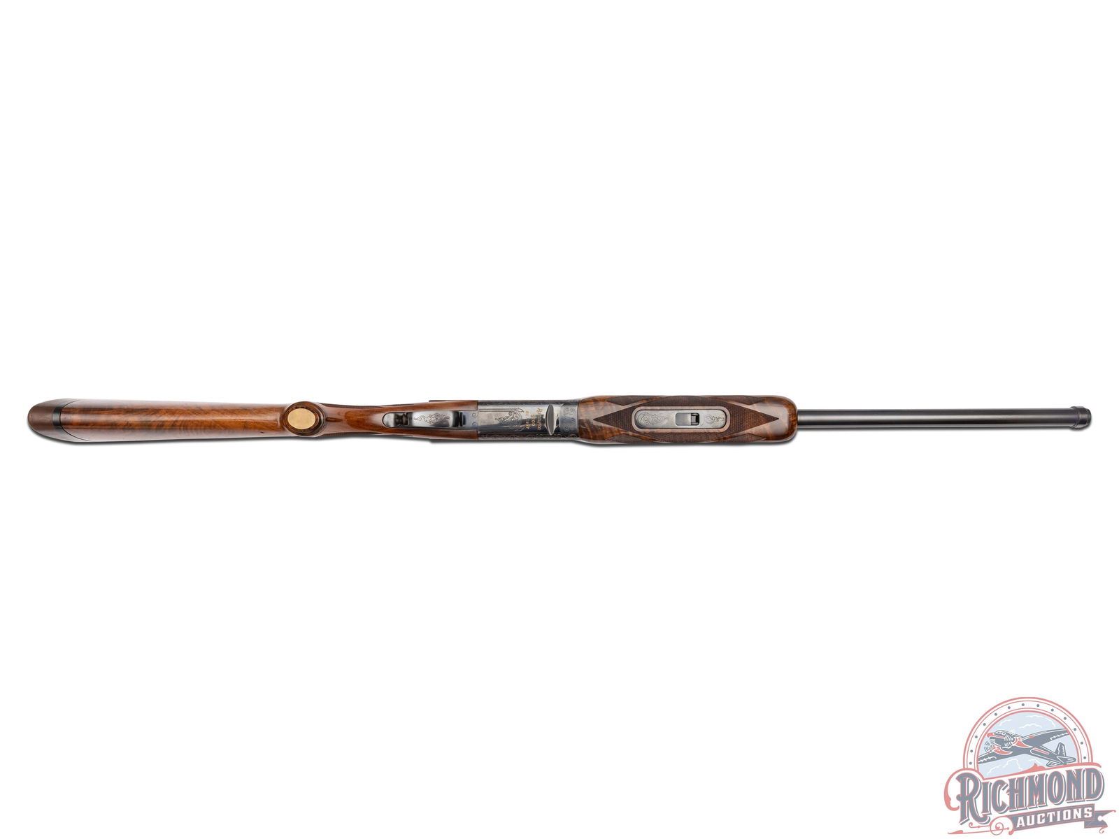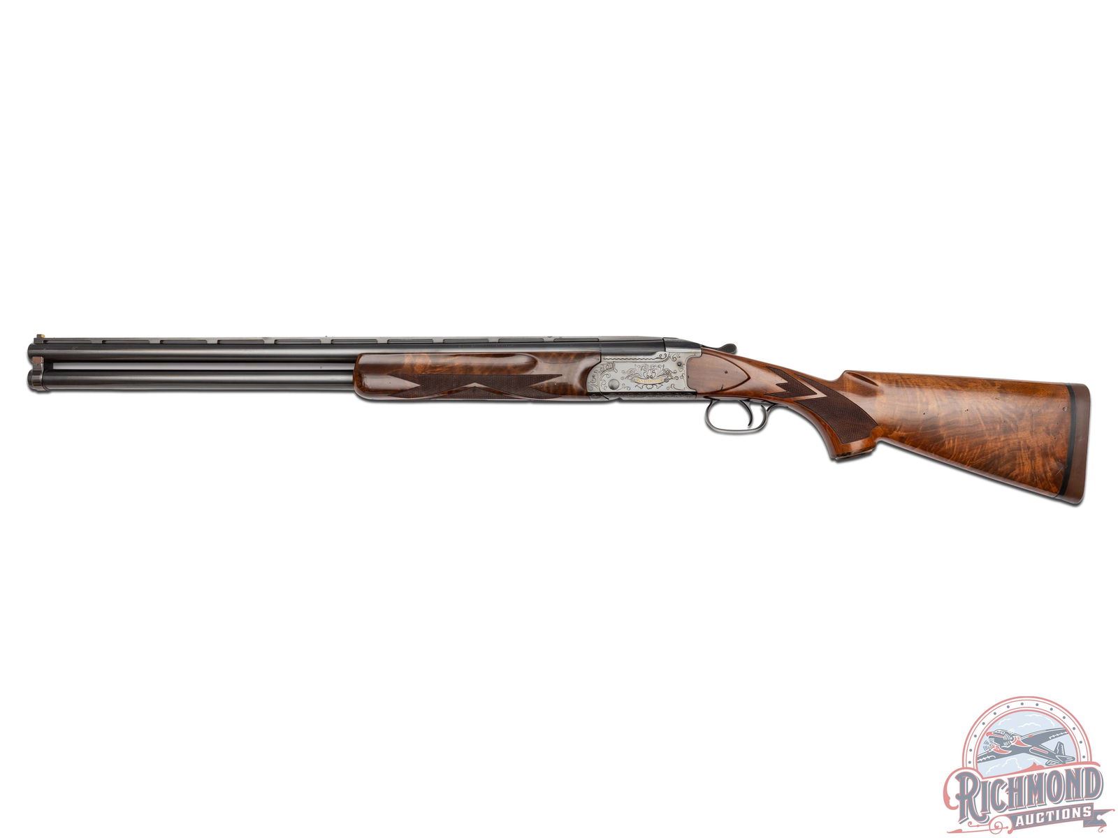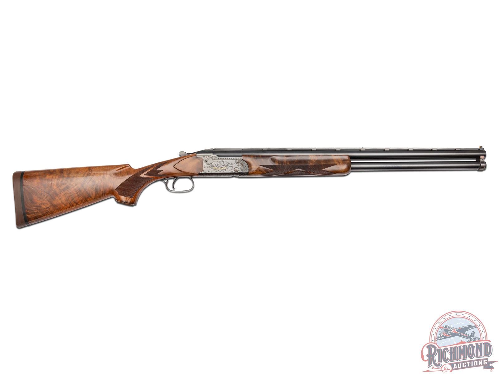 In 1974 Remington manufactured a Limited Edition of 1,000 Deluxe Skeet Grade 3200's named the "One Of 1000". Features a 26" blued ventilated rib barrel with white bead front sight, chambered for 2-3/4" shells with Skeet choke. Comes with four sets of tubes for 20, 28, and 410 gauge making it very versatile. Blued action with scroll engraving and gold lettering "ONE OF 1000" on each side panel. Bottom of the action is stamped in gold lettering "REMINGTON / 3200 / SK. 0997". Engraved scroll pattern on the bottom of the trigger guard. Single trigger with tang mounted selector switch missing (will need professionally replaced). Nicely figured walnut stock with pistol grip checkering and brass vanity plate inlaid pistol grip cap. Fitted with a factory brown rubber recoil pad. Matching skeet style forearm with checkering and scroll engraving on latch. Comes in a brown felt take-down case with factory tools. LOP: 13-3/4". DAC: 1-1/2". DAH: 2". CALIBER: MULTI GAUGE. S/N: 997. FFL STATUS: Curio & Relic.