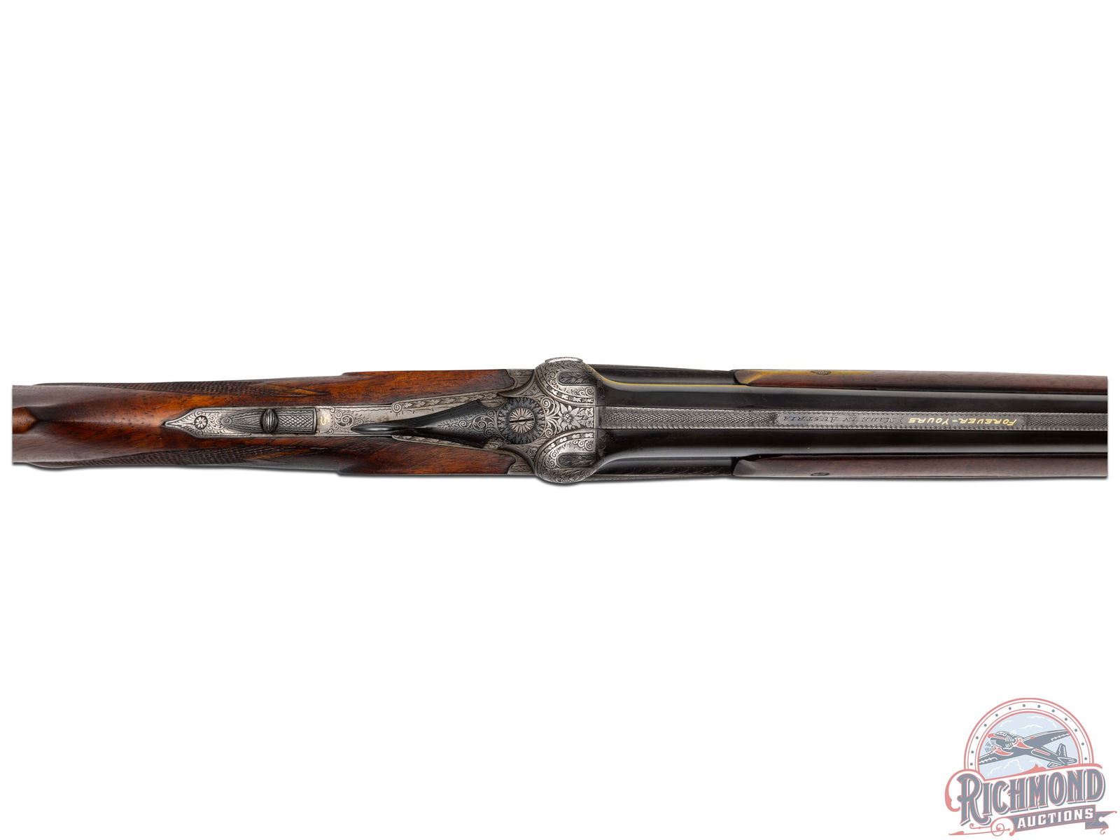 Made in Ferlach, Austria by Vinzenz Urbas and imported by Flaig's of Millvale, Pennsylvania in 1952. Blued 28" Bohler Steel barrel with ejectors, ventilated rib, bead front sight, 2-3/4" chambers, and Modified and Modified chokes in 16 gauge. Rib marked with "Forever Yours" in gold and "Made in Austria". Coin finish Kersten double lug action with full game scene engraved side plates. Action has vignette bird and dog scene on left and rabbit and duck scene on right with bottom having bird and floral scene. Action has top tang automatic safety, bushed firing pins, and double triggers. Select walnut checkered pistol grip stock with hard rubber grip cap and butt plate with white spacers. Matching checkered Merkel style 3 piece forearm with latch release. LOP: 14-1/2". DAC: 1-1/2". DAH: 2". CALIBER: 16 GA. S/N: 36493. FFL STATUS: Curio & Relic.