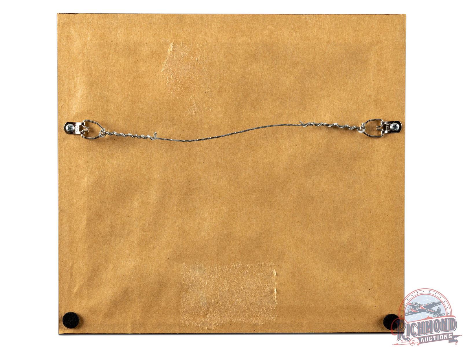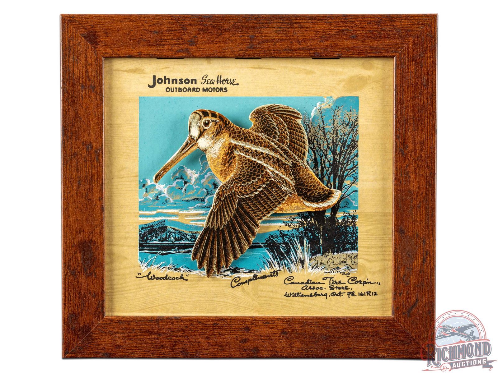 Unique Johnson Outboard framed cardboard sign with die cut and offset woodcock, giving the piece a 3D look as if the bird is in flight. Sign is in excellent condition with slight creasing in the woodcock's bill. Professionally framed. Marked "Woodcock" and Compliments Canadian Tire Corp. 10" H x 11" W.