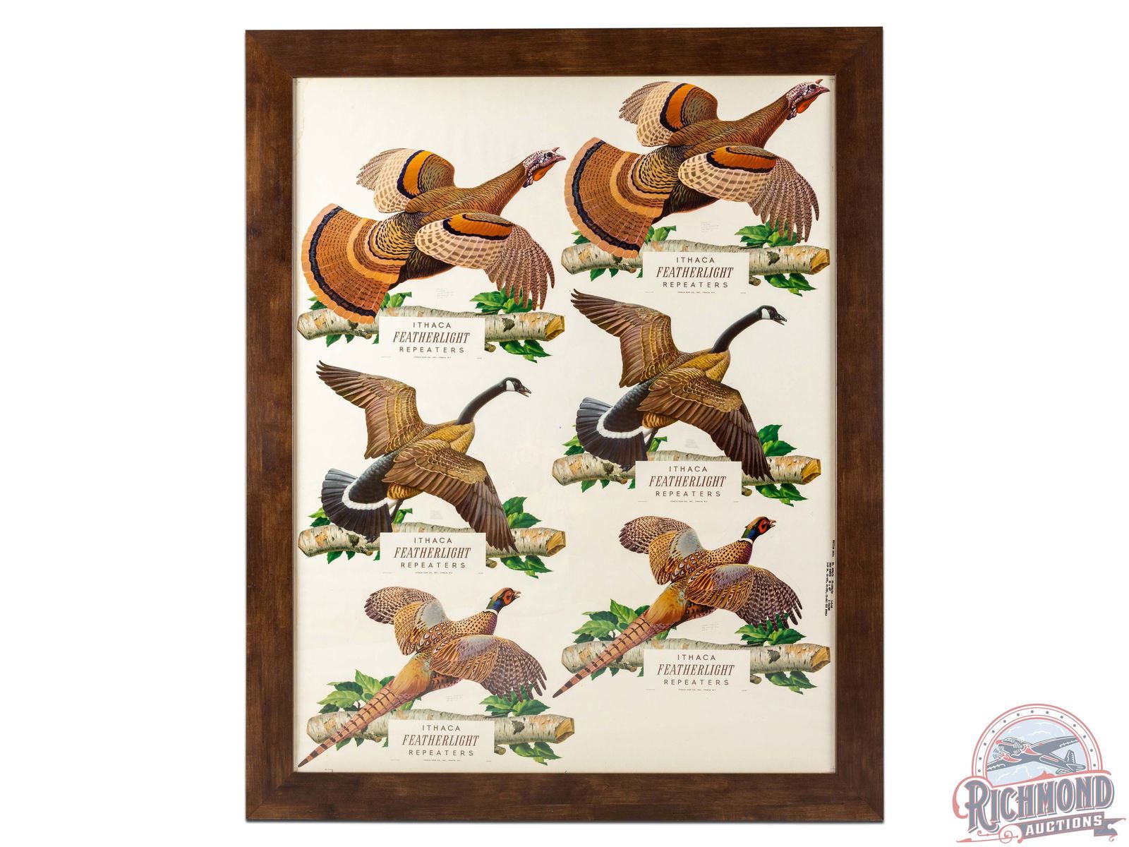 Large poster, possibly a printing sample, with three different graphics used by Ithaca to advertise their Featherweight Repeaters. Featuring a turkey, goose and pheasant in flight from a similar branch. Great colors and graphics with various areas of minor discoloration along the left edge. Professionally framed under glass. Marked under each bird with the scale and The Weiller Co, Phila, PA. Marked on right edge with printing information and dates. 50.25" H x 40.5" W.