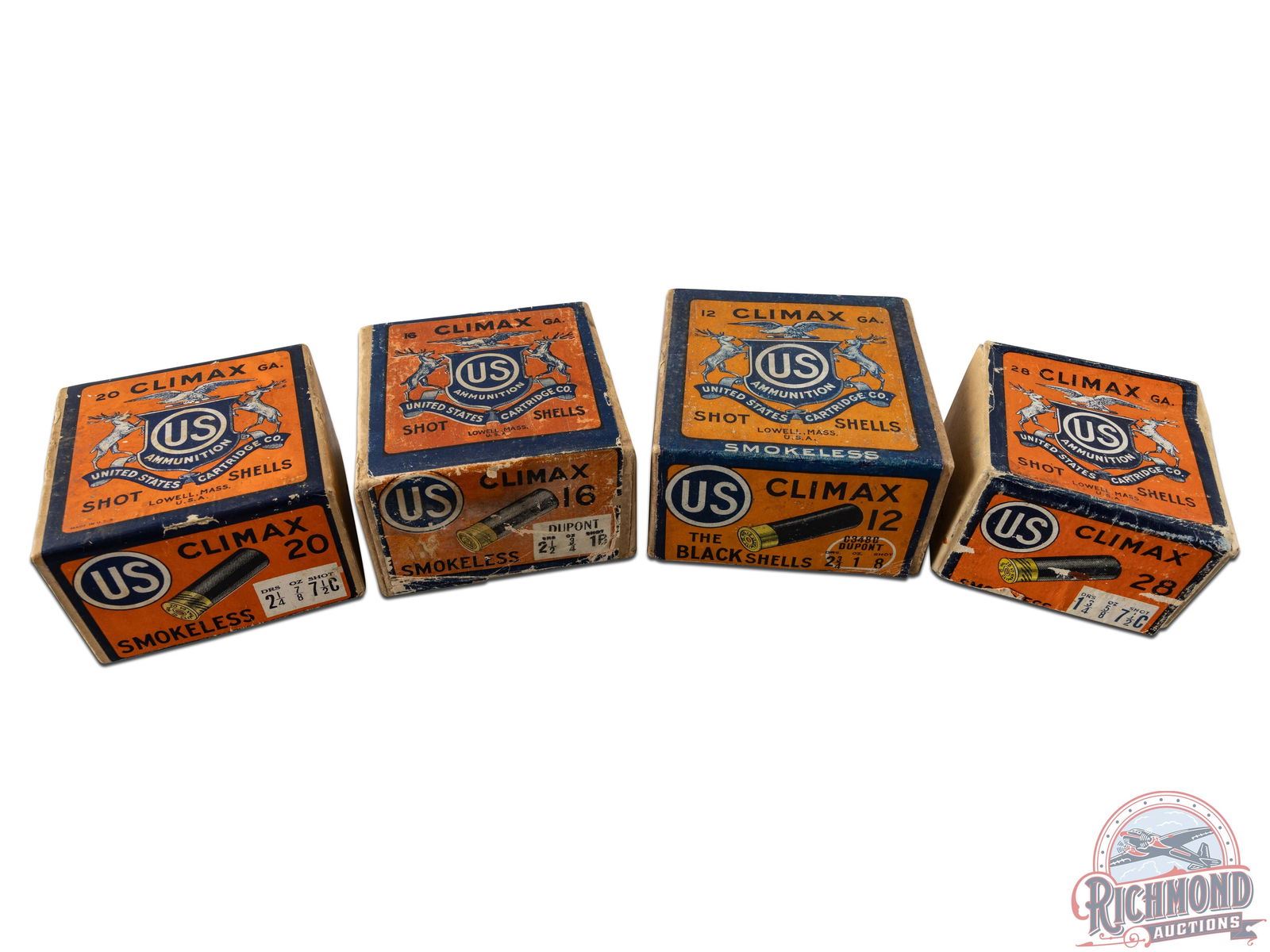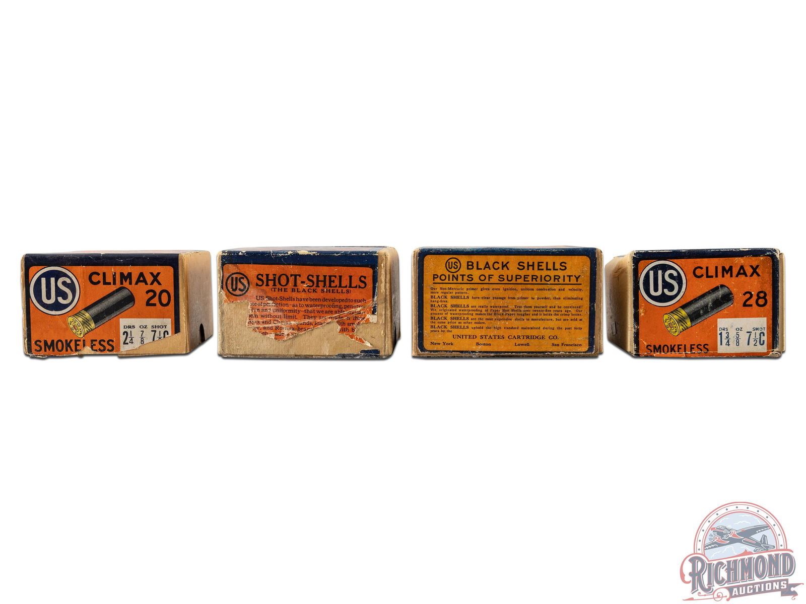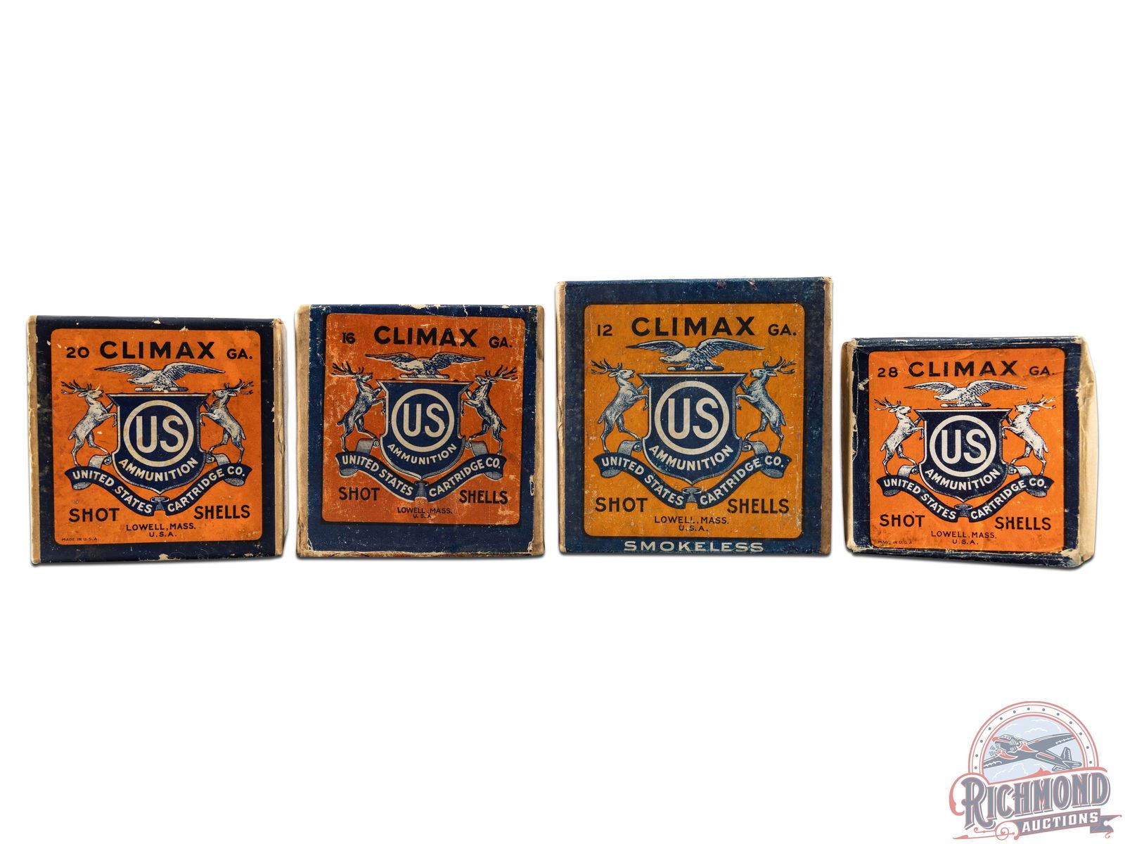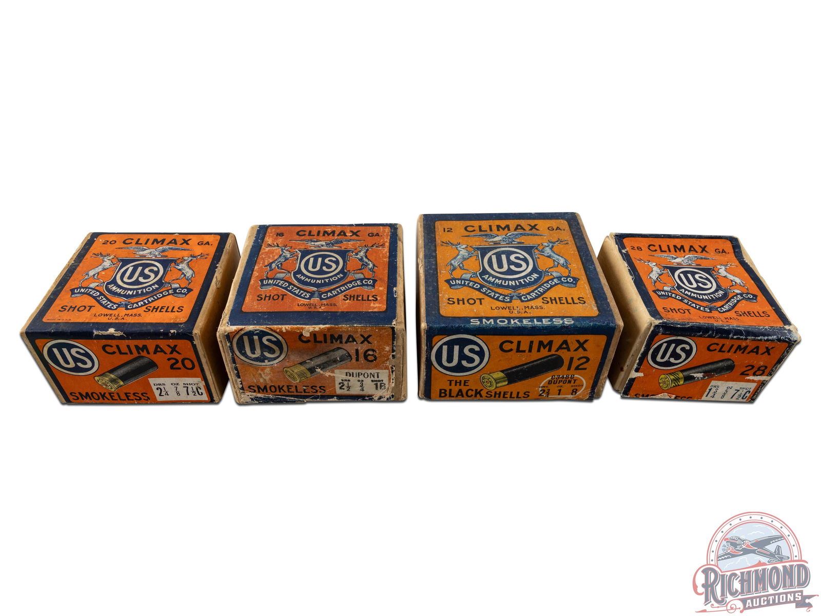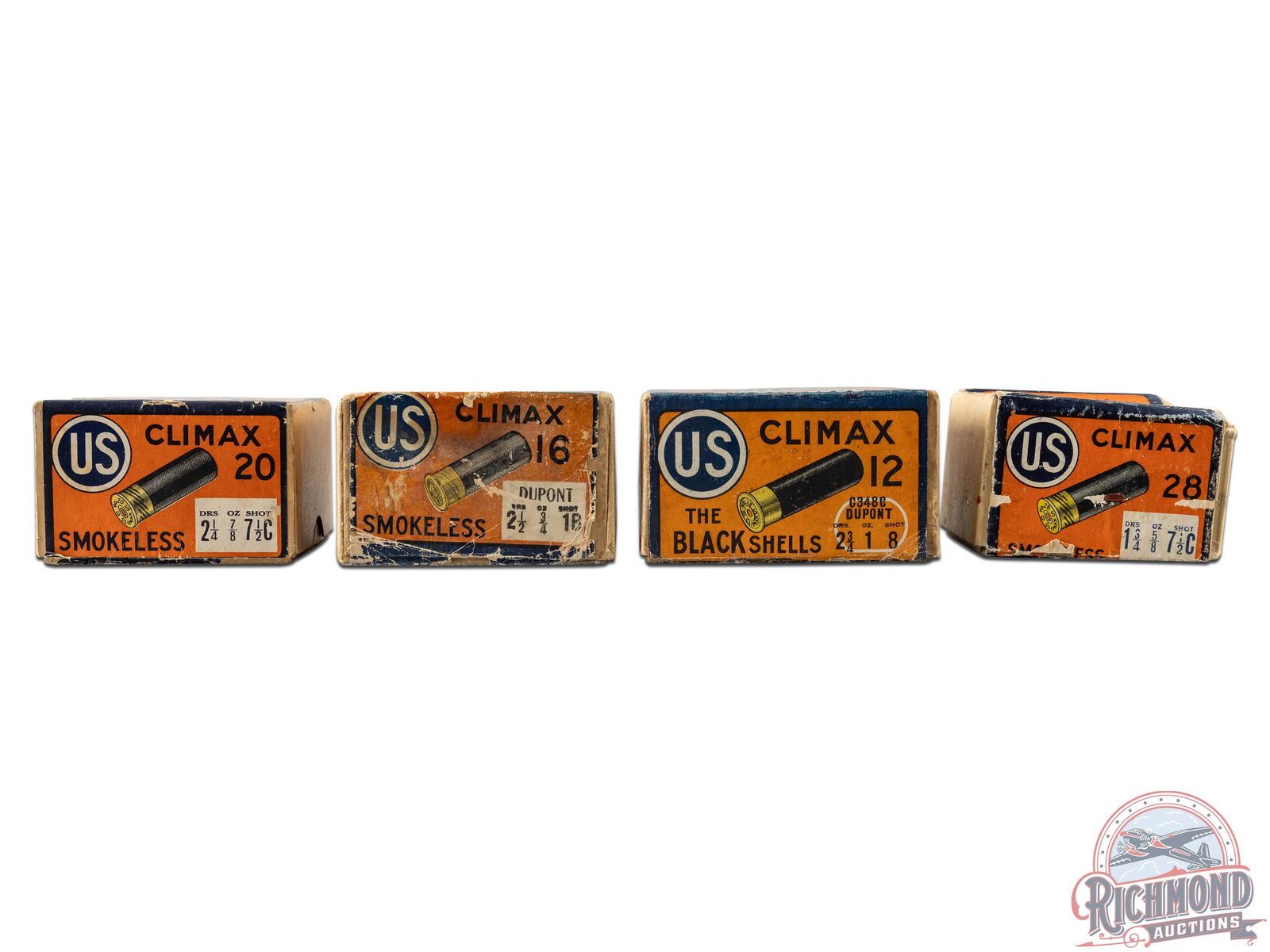 Lot includes 4 two-piece cardboard, 25 round "Climax" shotshell boxes in 28, 20, 16,12 gauge with 16 gauge box having 10 original rounds.