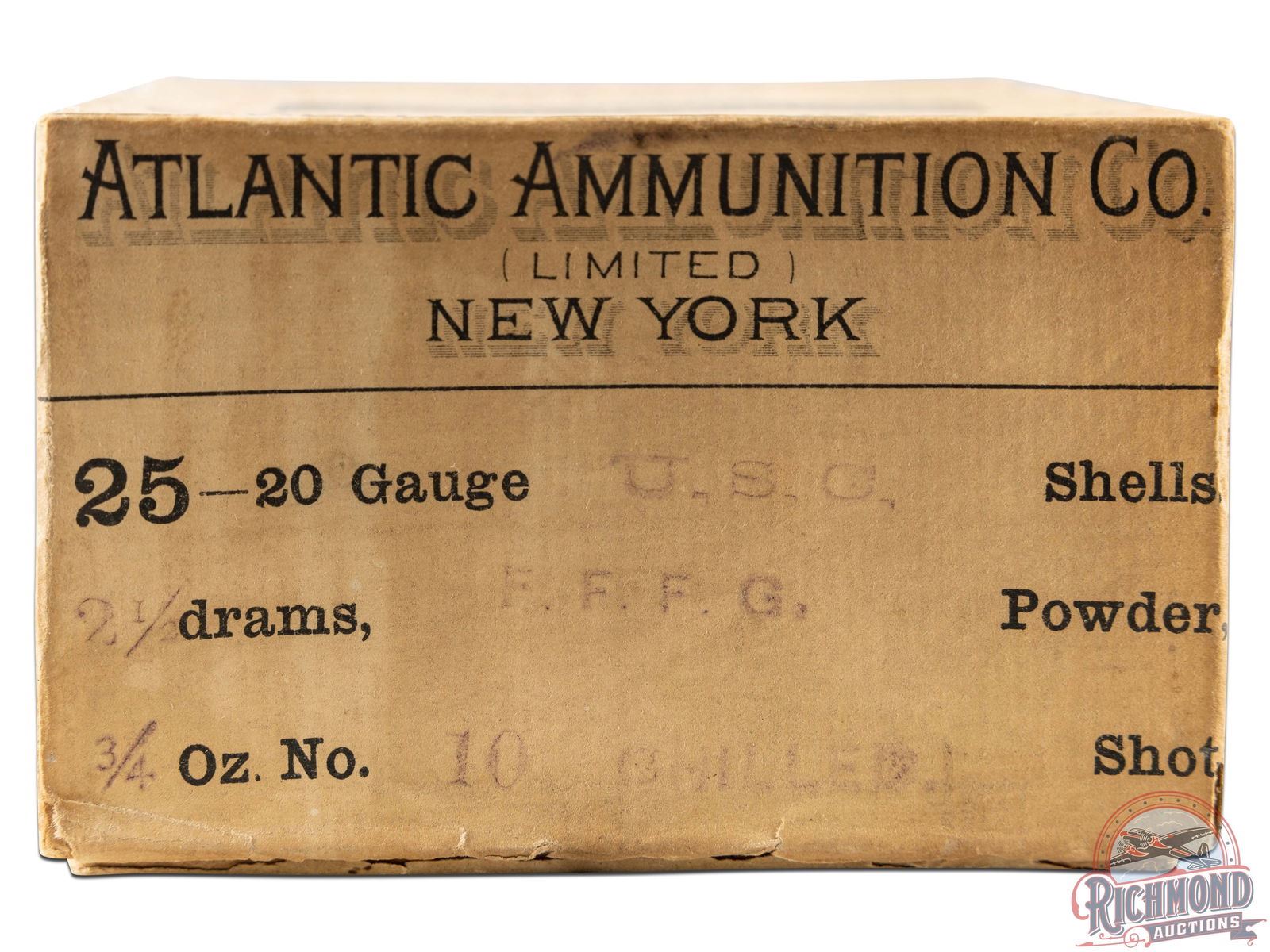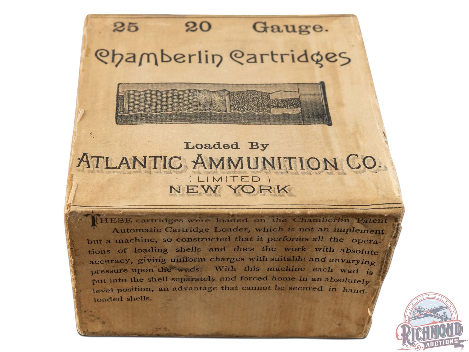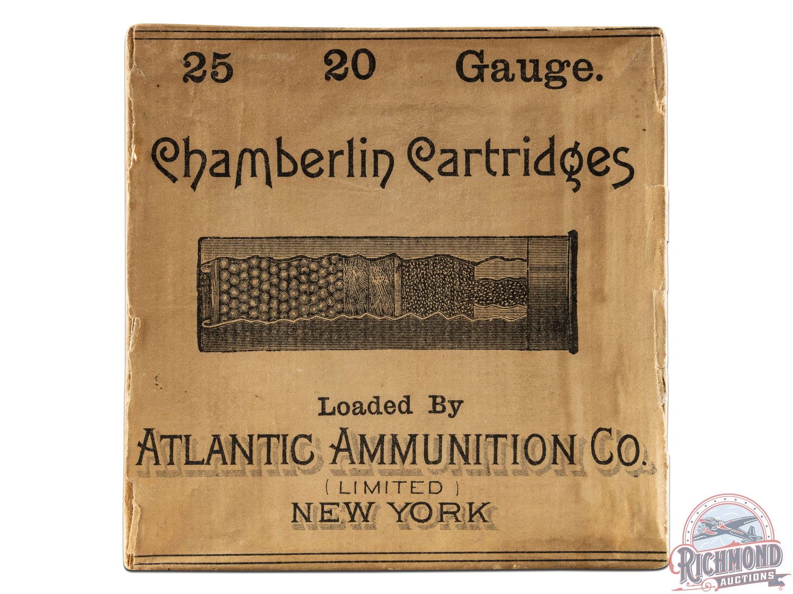 Box is a 25 round, 20 gauge two-piece cardboard box with "Chamberlin Cartridges" and "Loaded by Atlantic Ammunition Company Limited New York" beige colored box. Original shells were U.S. Cartridge Company manufacture and were loaded with F.F.F.6 and "No 10 Chilled" shot.