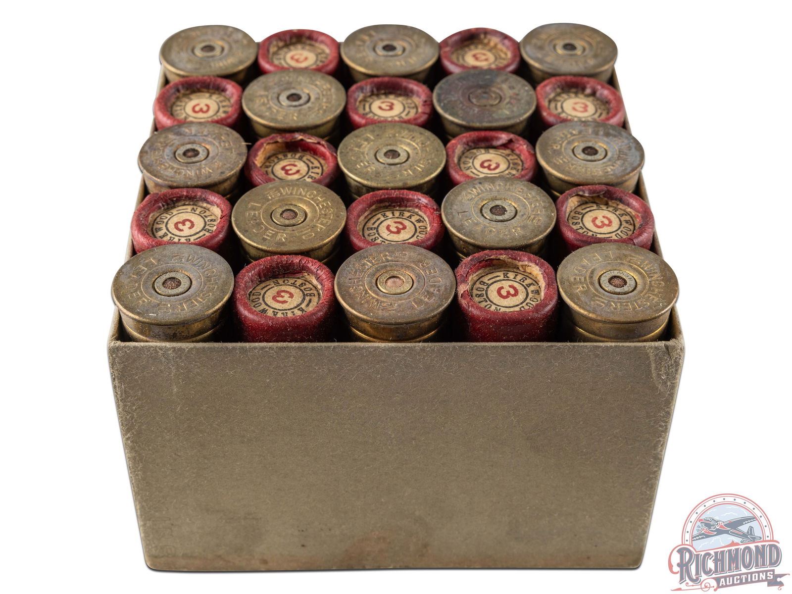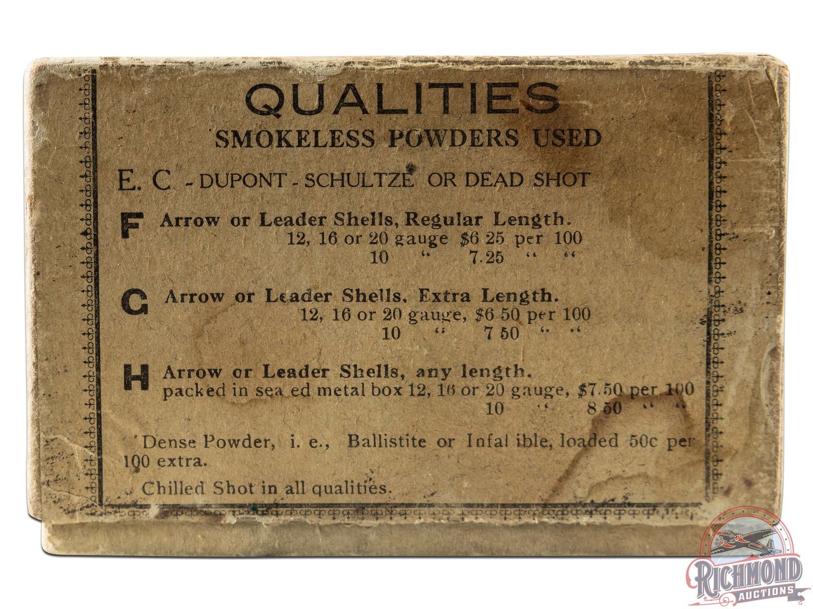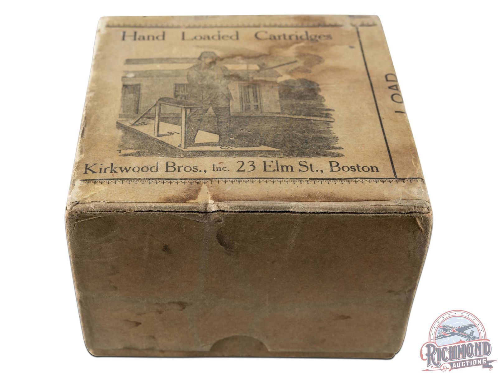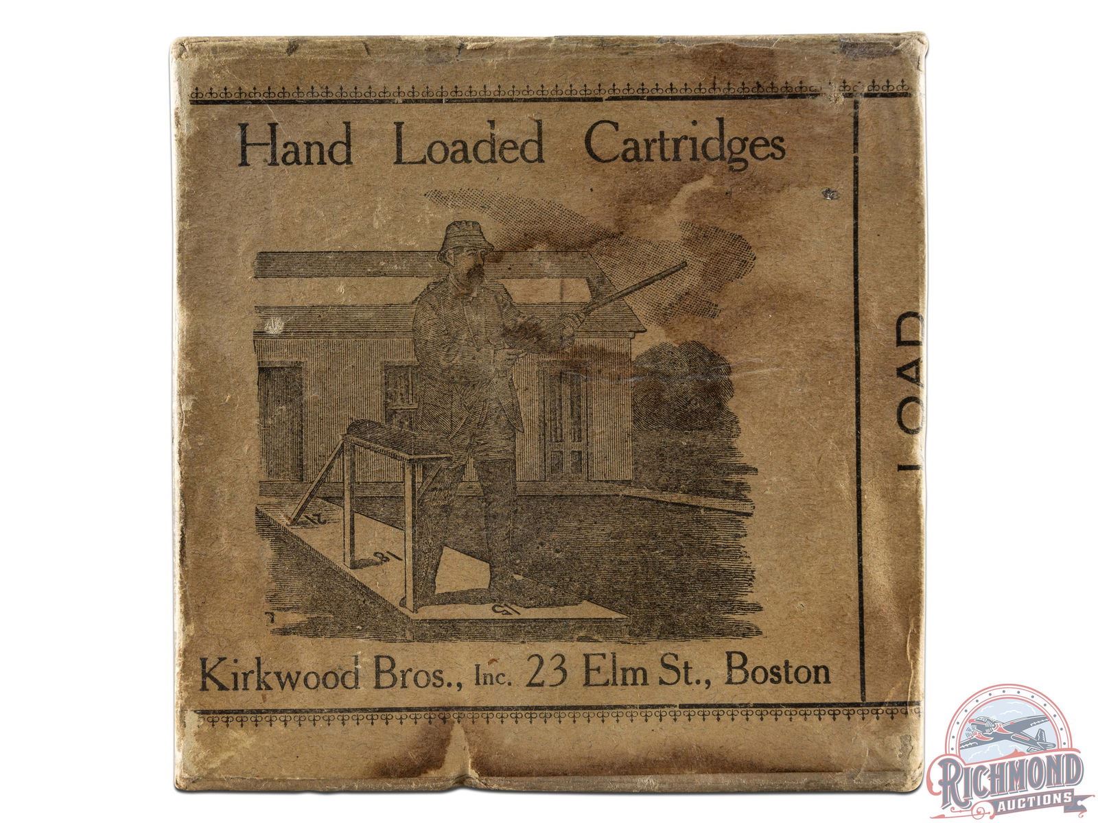 Listed as a "5" rarity in Bacyk's shotshell encyclopedia with Kirkwood Bros of Boston label with Trapshooter and "Load" label markings. Correct Winchester Leader reloaded shells matching and label being 3" with "Dead Shot" and Kirkwood top wads.