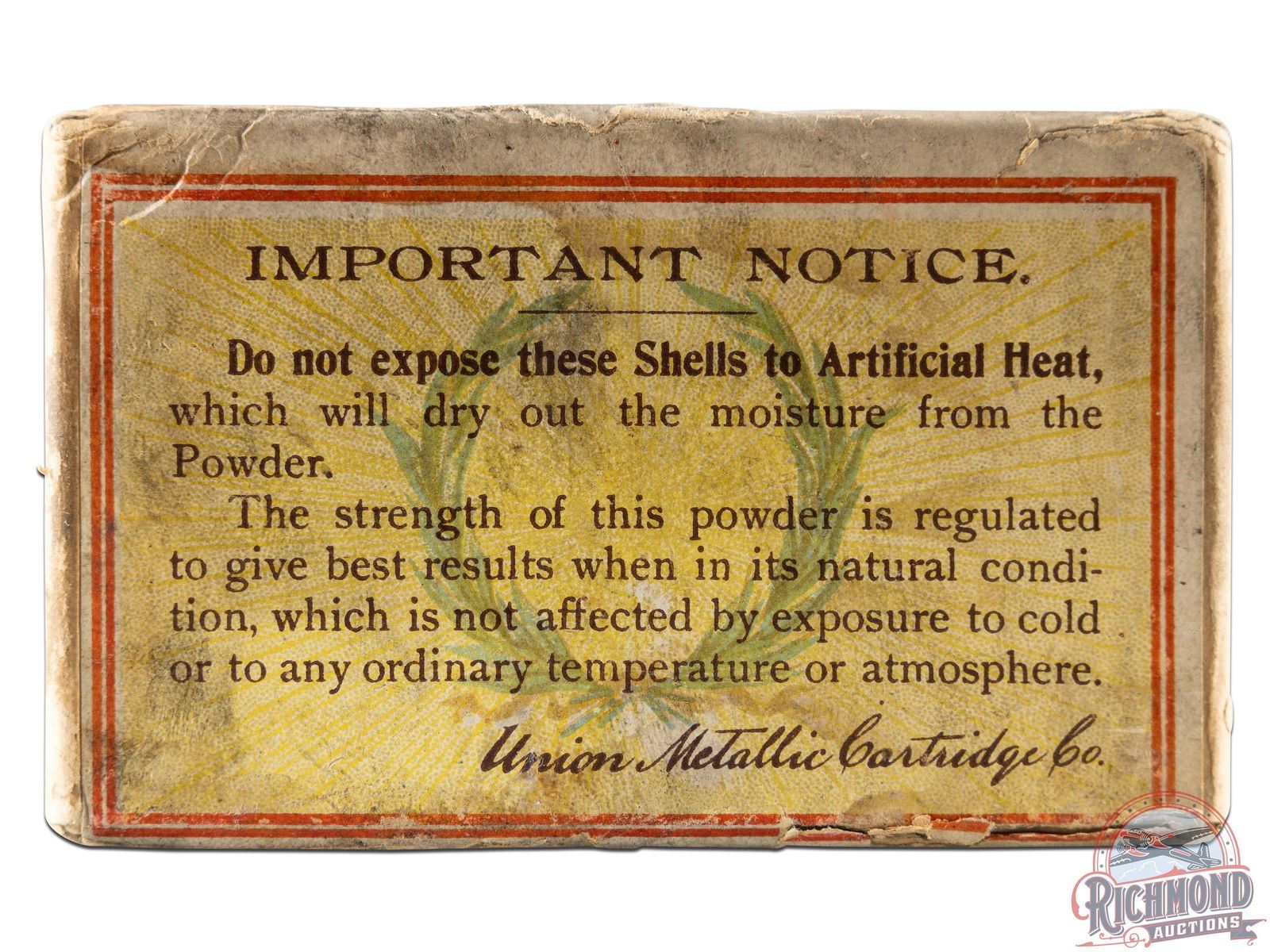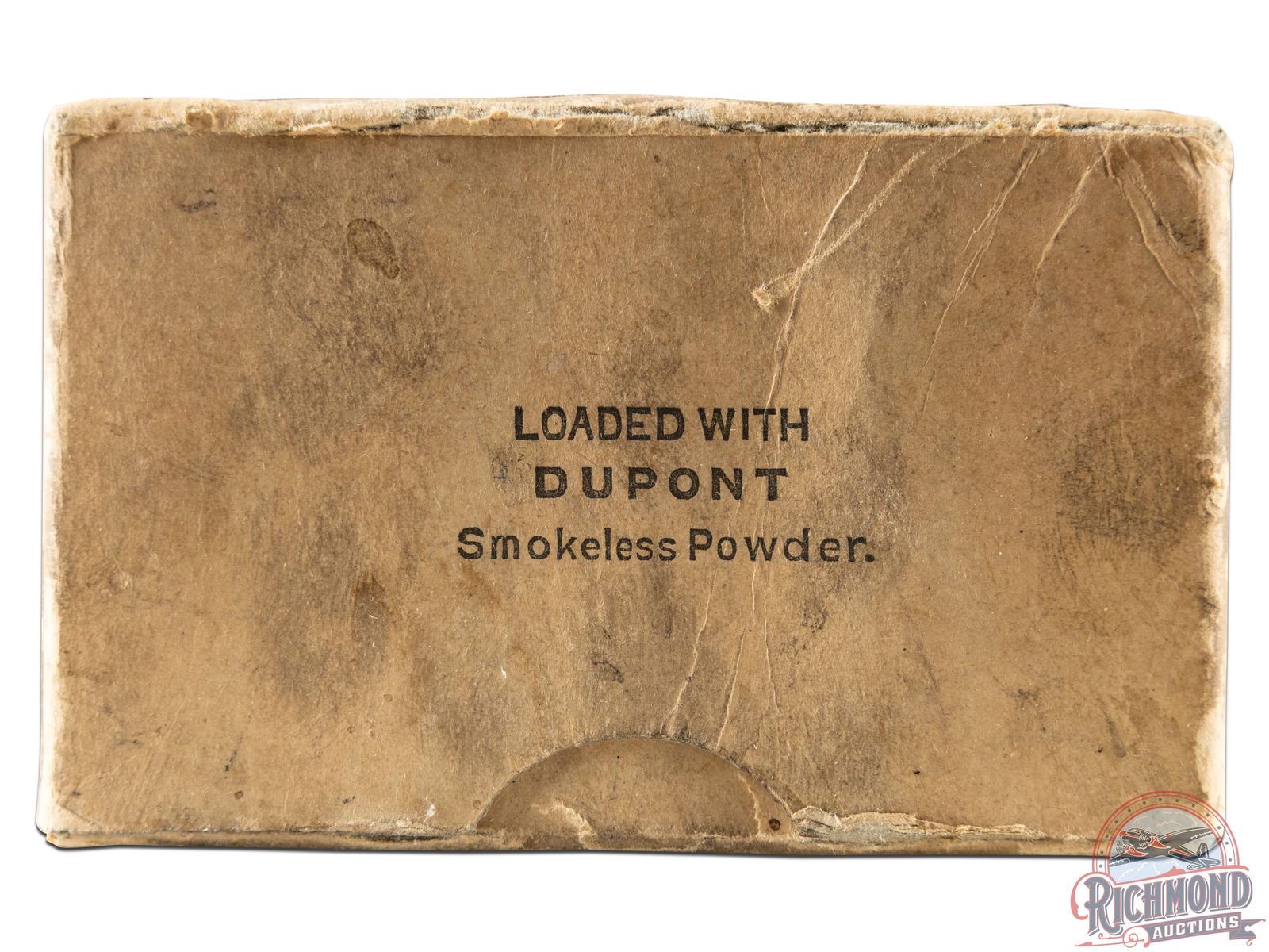 Listed as a "7" rarity in Bacyk's Shotshell Encyclopedia. Box is a 25 round, 12 gauge, two-piece cardboard box with "Man Shooting Scene" on front and loaded with "Dupont" powder and "8 Chilled Shot". Box is full with seal intact in places.