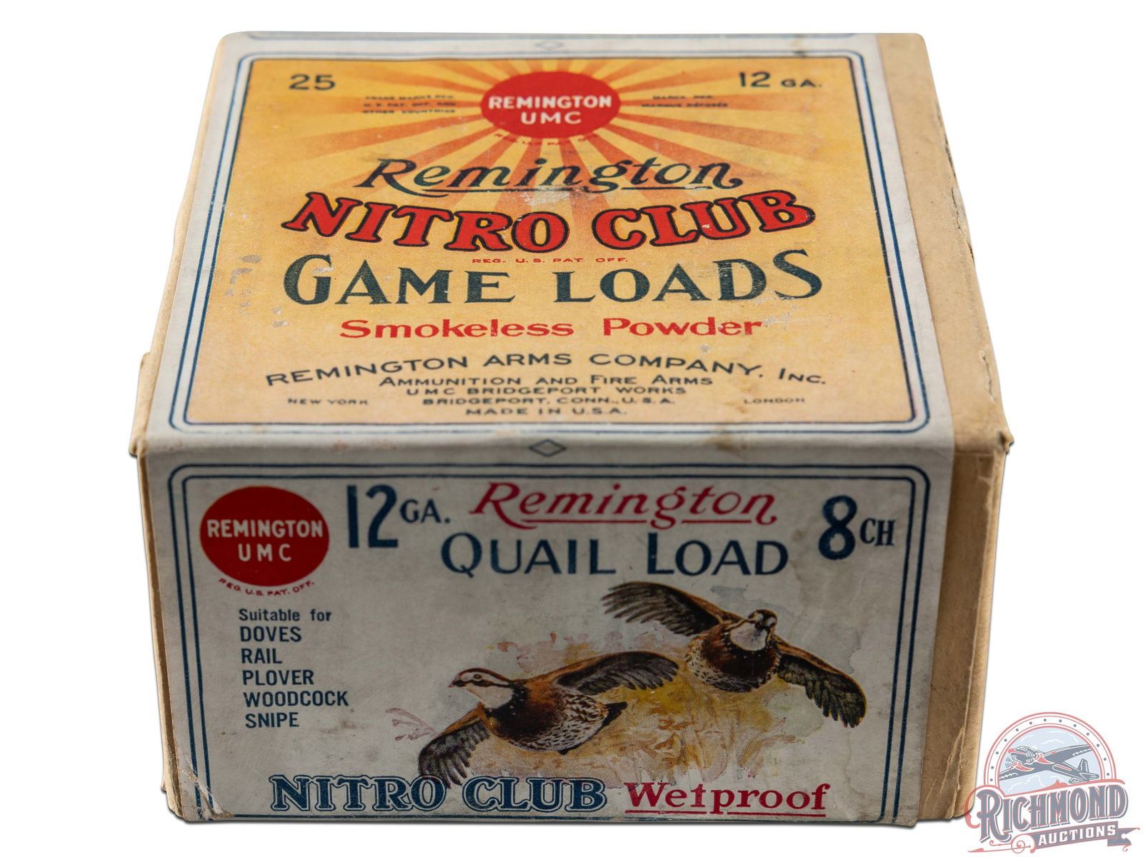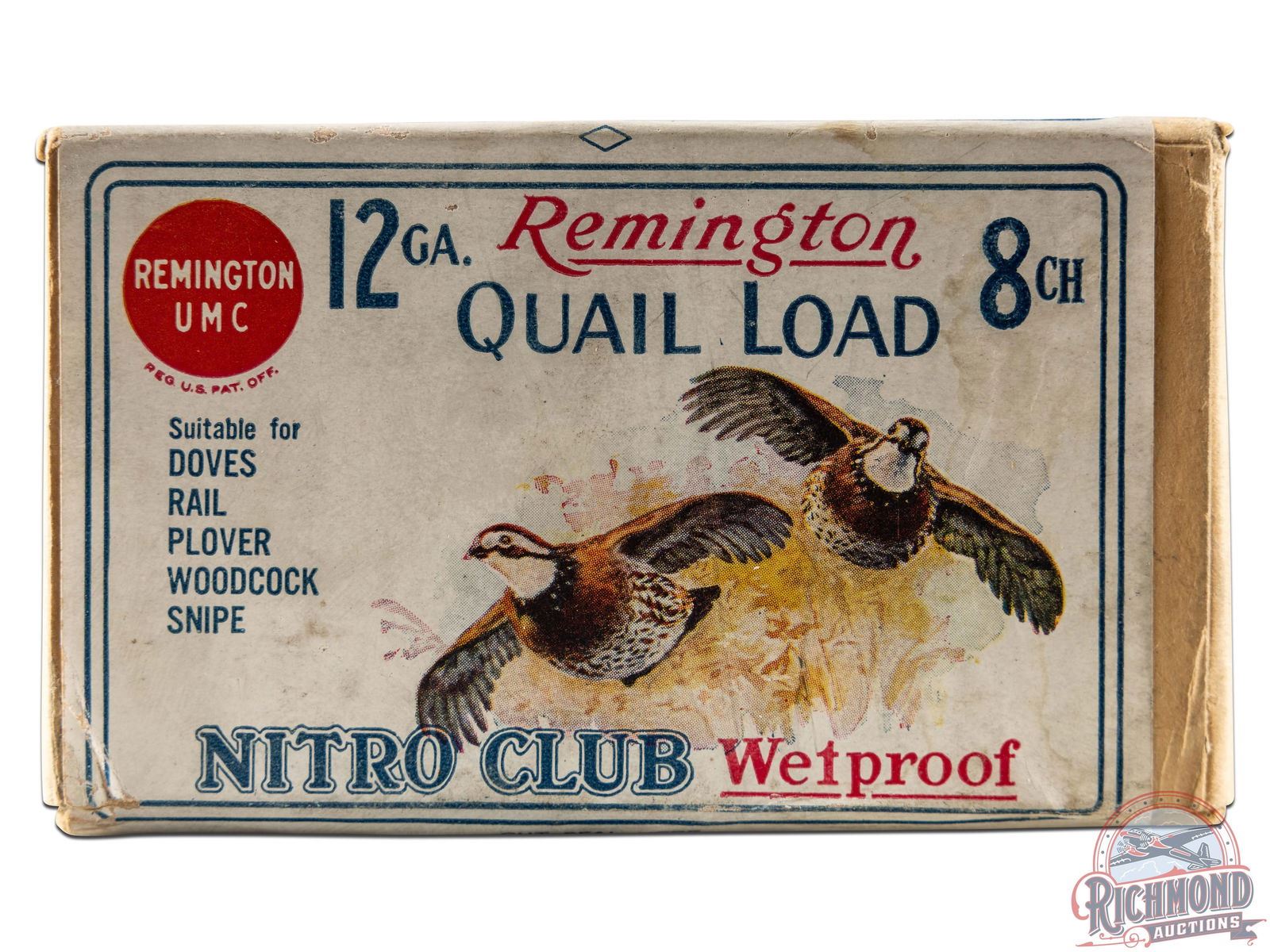Listed as a "5" rarity in Bacyk's Shotshell Encyclopedia. Box is a factory sealed 25 round Game scene end label Nitro Club 25 round, 12 gauge two-piece cardboard box with "8Ch" shot loading and "Quail Load" end label marking.